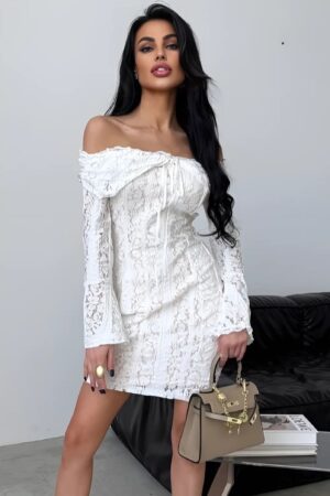 ΦΟΡΕΜΑ ΜΙΝΙ OFF SHOULDER ΜΕ ΔΑΝΤΕΛΑ ΚΑΙ ΚΑΜΠΑΝΑ ΜΑΝΙΚΙΑ – ΛΕΥΚΟ