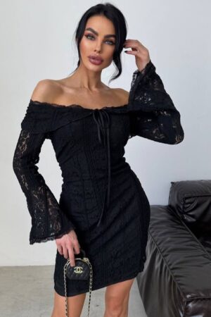 ΦΟΡΕΜΑ ΜΙΝΙ OFF SHOULDER ΜΕ ΔΑΝΤΕΛΑ ΚΑΙ ΚΑΜΠΑΝΑ ΜΑΝΙΚΙΑ – ΜΑΥΡΟ