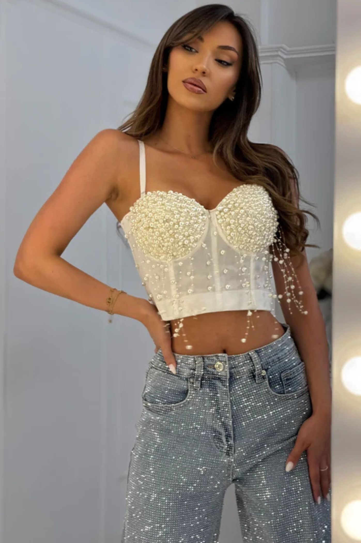 CORSET TOP ΜΕ ΤΙΡΑΝΤΕΣ ΚΑΙ ΠΕΡΛΕΣ – ΛΕΥΚΟ