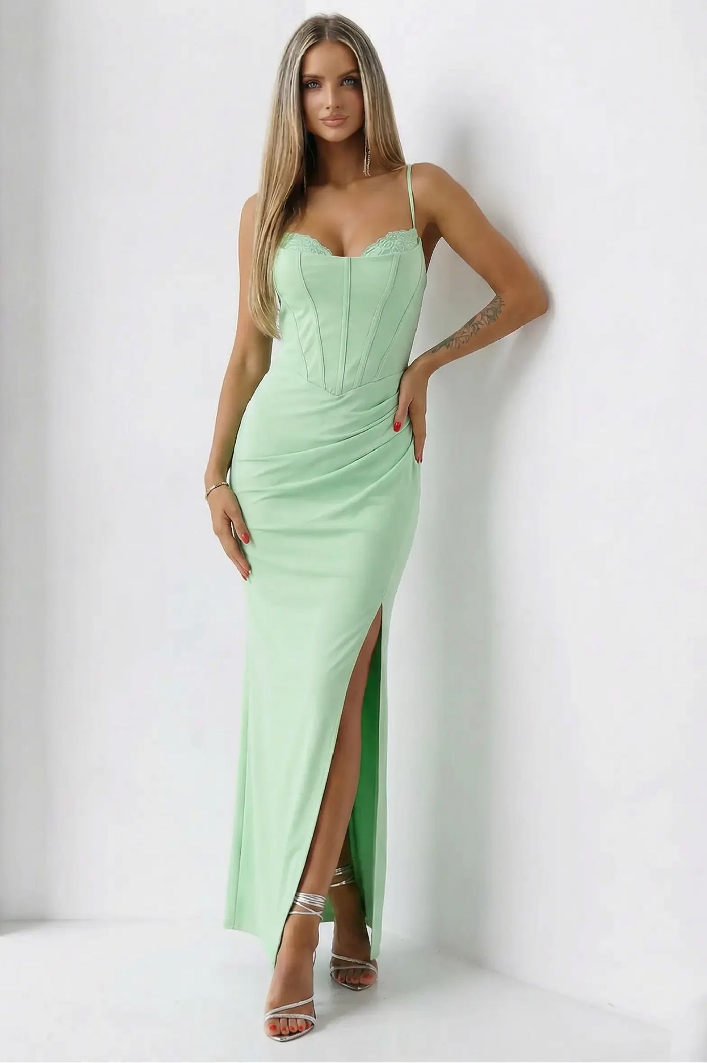Κλέψτε την παράσταση με το απόλυτο statement φόρεμα της σεζόν. Αυτό το maxi φόρεμα συνδυάζει την κλασική γοητεία του κορσέ με μοντέρνες λεπτομέρειες, δημιουργώντας ένα look που αποπνέει αυτοπεποίθηση και θηλυκότητα. Είναι η ιδανική επιλογή για επίσημες δεξιώσεις, γάμους ή οποιαδήποτε περίσταση απαιτεί μια εντυπωσιακή παρουσία. Το επάνω μέρος διαθέτει ενσωματωμένο κορσέ με εμφανείς ραφές και λεπτομέρεια από δαντέλα στο μπούστο, προσφέροντας σταθερότητα και σμιλευμένη σιλουέτα. Οι πλευρικές σούρες στην περιοχή των γοφών αγκαλιάζουν τις καμπύλες και προσδίδουν μια luxury υφή στο ύφασμα. Το βαθύ σκίσιμο στο πόδι προσθέτει μια δόση αισθησιασμού και επιτρέπει την ελευθερία κινήσεων, αναδεικνύοντας ταυτόχρονα τα παπούτσια σας. Η μακριά, χυτή γραμμή επιμηκύνει το σώμα, δημιουργώντας μια αριστοκρατική και επιβλητική εμφάνιση.
