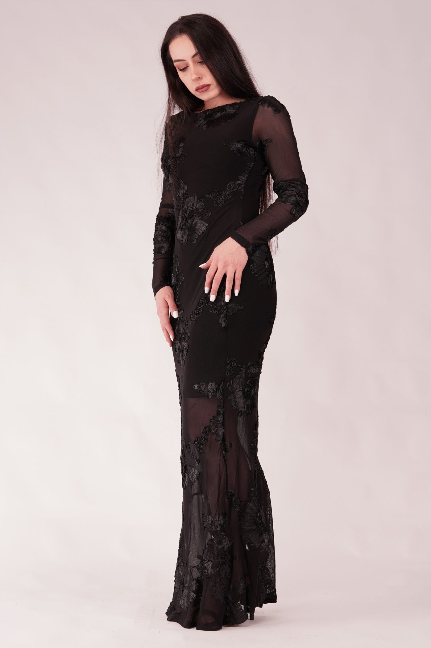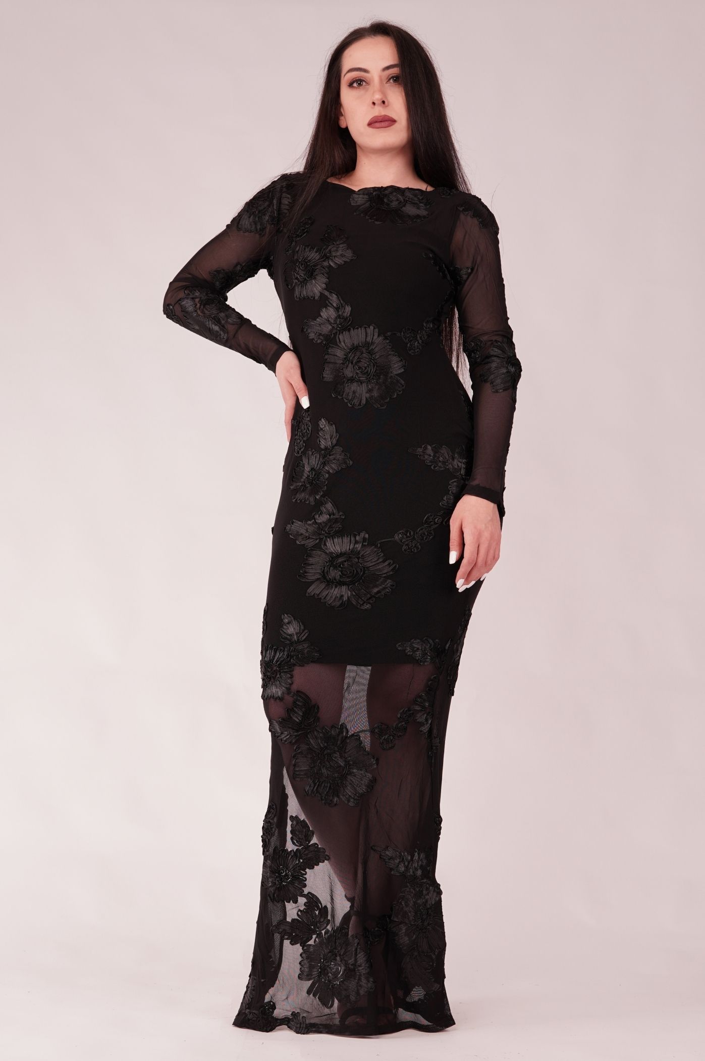 Αποκτήστε ένα εντυπωσιακό, βραδινό μάξι φόρεμα που αποπνέει ρομαντισμό και κομψότητα. Το φόρεμα διαθέτει κολακευτική, στενή γραμμή που αγκαλιάζει τη σιλουέτα. Τα κεντημένα λουλούδια δίνουν μια αίσθηση τρισδιάστατης υφής και πολυτέλειας. Τα μακριά μανίκια από διαφάνεια με κεντημένα λουλούδια προσφέρουν διακριτική κάλυψη και ένα αισθησιακό αποτέλεσμα, ενώ η μάξι φούστα με διαφάνεια στο κάτω μέρος χαρίζει κίνηση και δραματικότητα. Μπορεί να φορεθεί με μαύρα ή nude ψηλοτάκουνα και μια μικρή τσάντα φακέλο για ένα sophisticated και glamour look που θα μαγνητίσει τα βλέμματα. Ιδανική επιλογή για κάθε επίσημη εκδήλωση ή γιορτή.