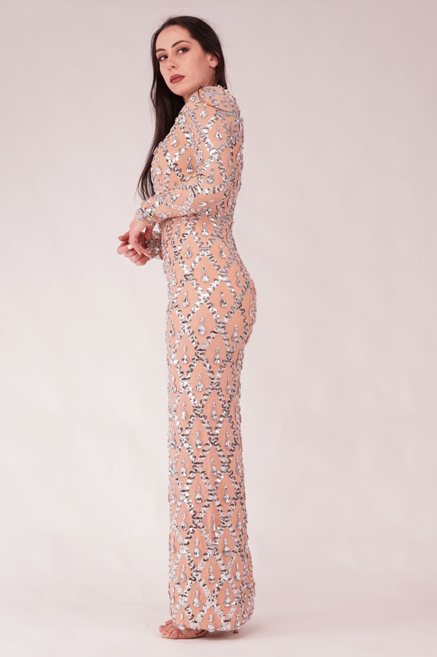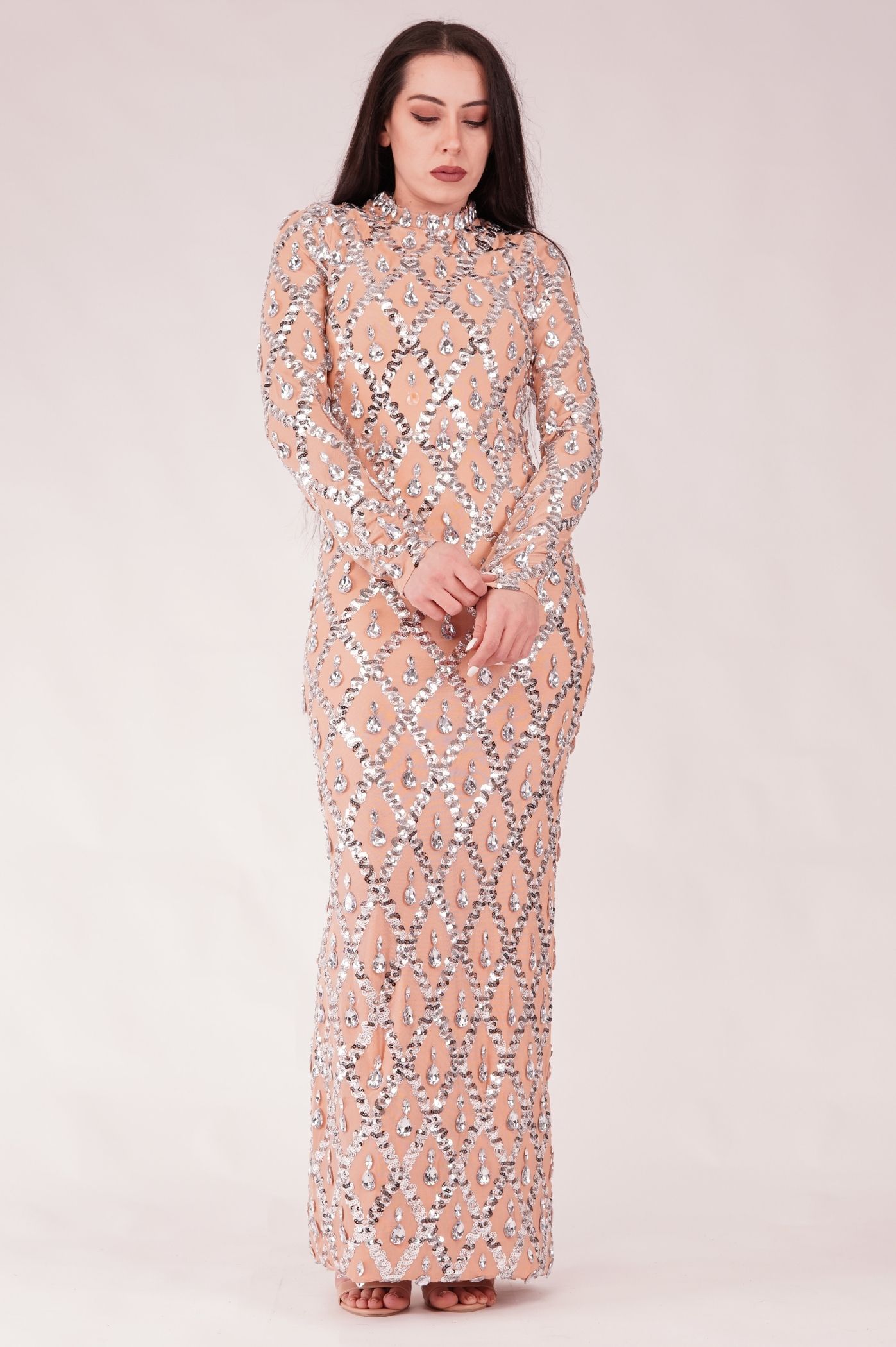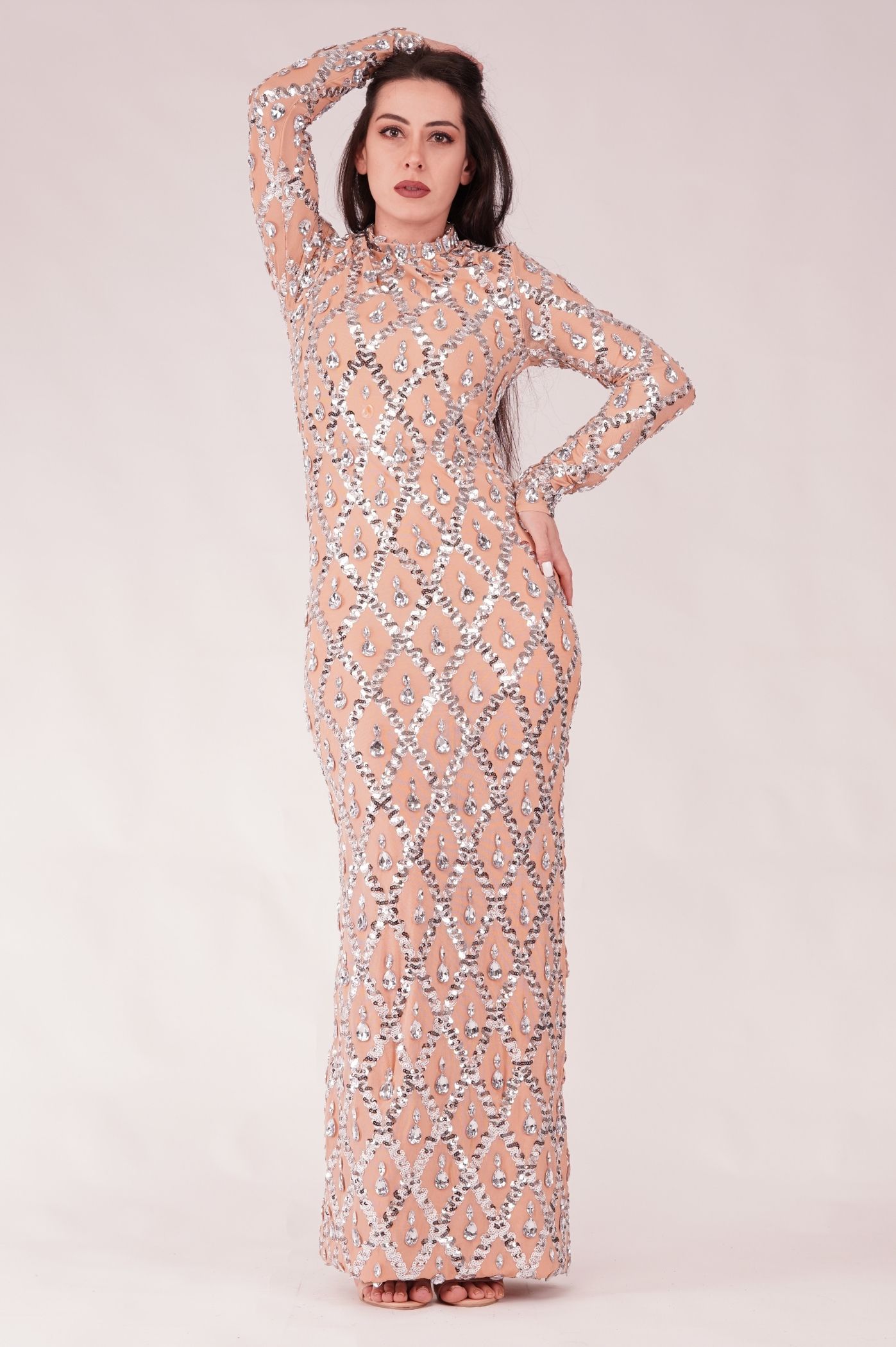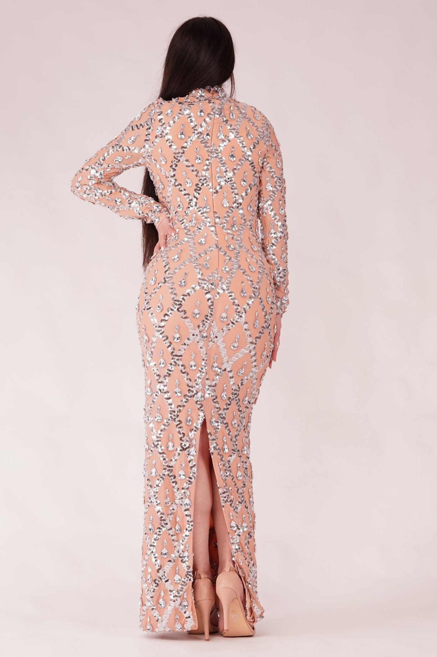 Αναδείξτε το στυλ σας με αυτό το μάξι φόρεμα που είναι η επιτομή της πολυτέλειας και του glamour. Το φόρεμα καλύπτεται από ένα εντυπωσιακό γεωμετρικό κέντημα με αστραφτερά στρας και παγιέτες, που τραβάει τα βλέμματα σε κάθε σας κίνηση. Η ψηλή λαιμόκοψη και τα μακριά μανίκια προσδίδουν μια νότα διακριτικής κομψότητας και αισιοδοξίας. Το φόρεμα έχει τέλεια εφαρμογή που αναδεικνύει τη σιλουέτα, ενώ το ψηλό σχίσιμο στο πόδι προσθέτει μια αισθησιακή πινελιά και διευκολύνει την κίνηση. Μπορεί να φορεθεί με minimal ασημένια κοσμήματα και ψηλοτάκουνα πέδιλα για μια ασύγκριτη, red-carpet εμφάνιση. Ιδανικό φόρεμα για μια επίσημη εμφάνιση, έναν γάμο ή ένα λαμπερό cocktail party.