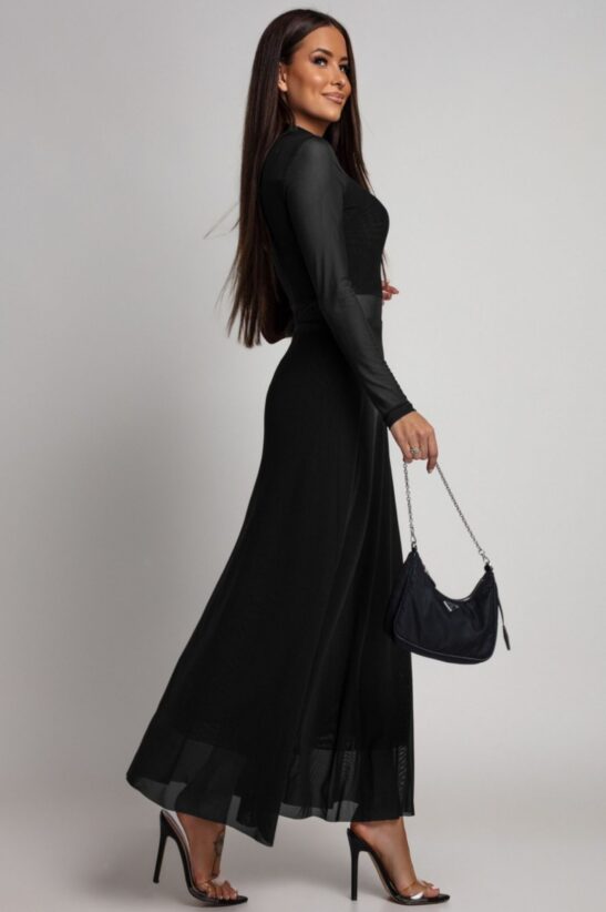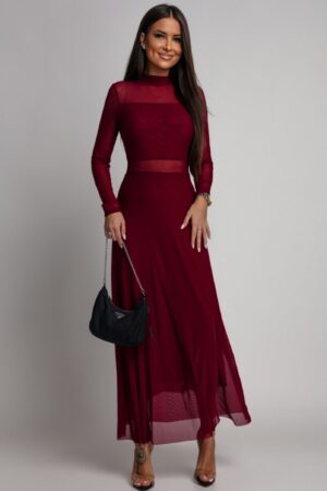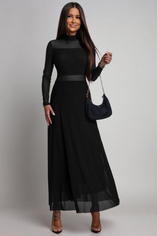 Κομψότητα και Μυστήριο! Ανακαλύψτε το εκθαμβωτικό μάξι φόρεμα με διαφάνεια, ιδανικό για τις πιο λαμπερές βραδινές εμφανίσεις σας. Αυτό το αέρινο μάξι φόρεμα προσφέρει ένα διακριτικά σέξι look. Το ψηλό ζιβάγκο και τα μακριά μανίκια εξισορροπούν την ένταση της ημιδιάφανης ύφανσης στο μπούστο και τη μέση, δημιουργώντας ένα παιχνίδι αποκάλυψης. Η ρέουσα γραμμή της φούστας εξασφαλίζει άνεση και θεατρικότητα σε κάθε σας βήμα. Είναι το τέλειο φόρεμα για γάμους, βαπτίσεις ή επίσημα events.