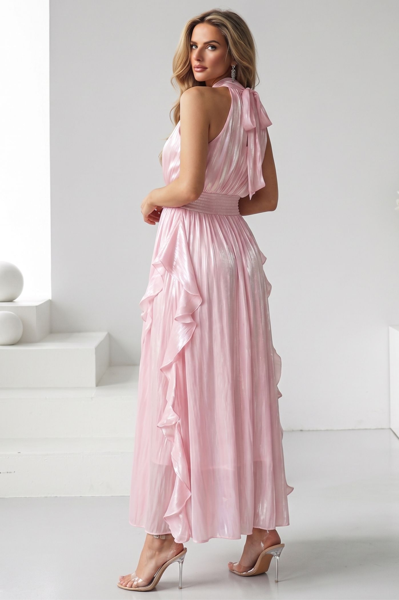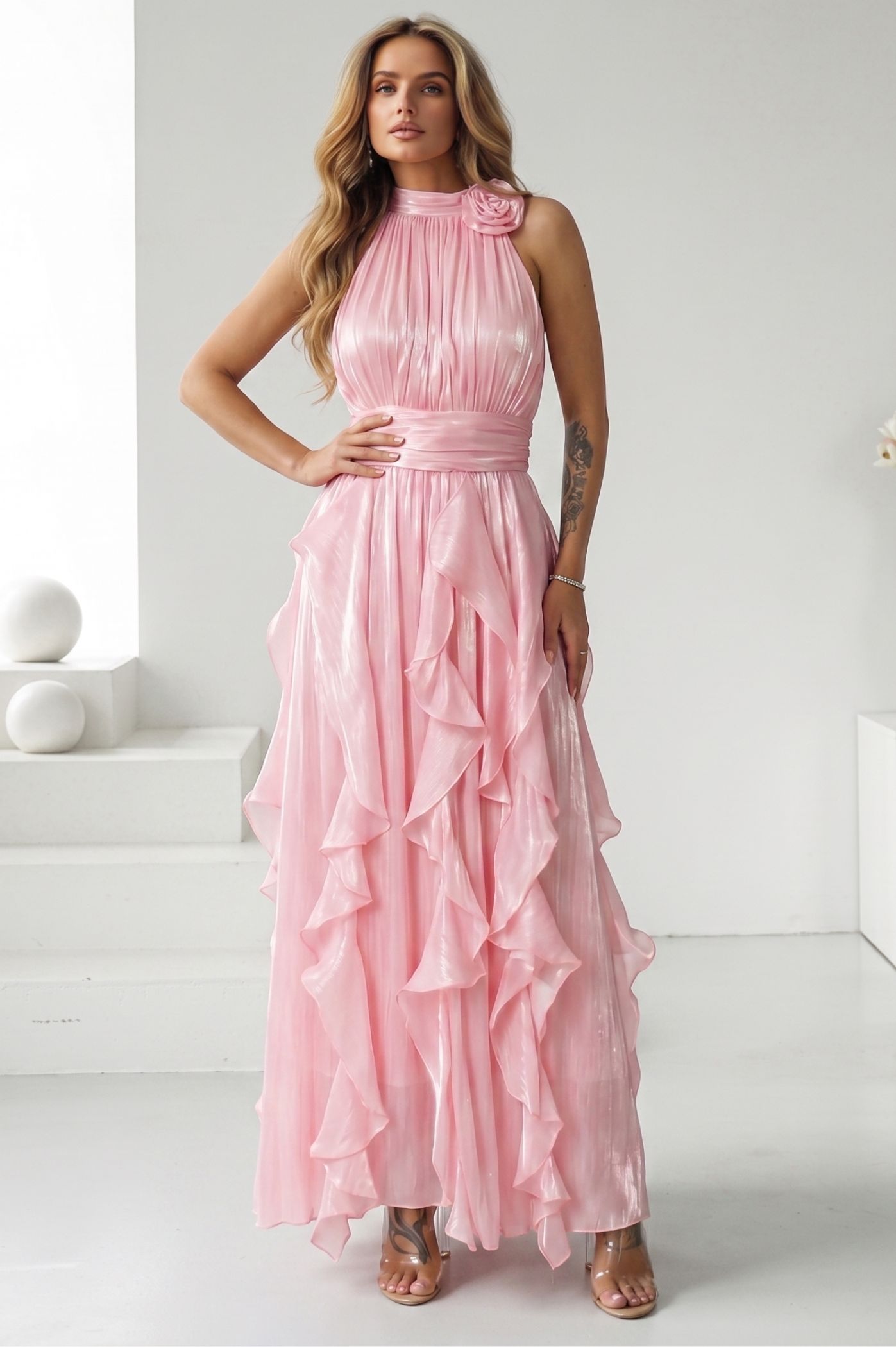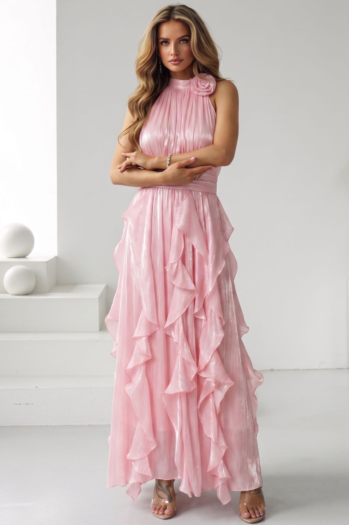 Κλέψτε τις εντυπώσεις στην επόμενη επίσημη εμφάνισή σας με αυτό το αιθέριο μάξι φόρεμα. Με αριστοκρατικό σχεδιασμό και μοναδικές λεπτομέρειες, αποτελεί την τέλεια επιλογή για γάμο, βάπτιση ή οποιαδήποτε άλλη κοινωνική εκδήλωση όπου η κομψότητα είναι το ζητούμενο. Η διακριτική μεταλλική λάμψη του υφάσματος αντανακλά το φως, δίνοντας μια αίσθηση πολυτέλειας και κίνησης σε κάθε σας βήμα. Ο κομψός κλειστός λαιμός κοσμείται από ένα χειροποίητο διακοσμητικό λουλούδι στον ώμο, προσθέτοντας μια ρομαντική και high-fashion πινελιά. Το κάτω μέρος του φορέματος διαθέτει πλούσια κάθετα βολάν που δημιουργούν έναν αέρινο όγκο και μια άκρως θηλυκή σιλουέτα. Η ενσωματωμένη φάσα στη μέση σμιλεύει το σώμα, προσφέροντας την ιδανική εφαρμογή και αναδεικνύοντας τις καμπύλες σας.