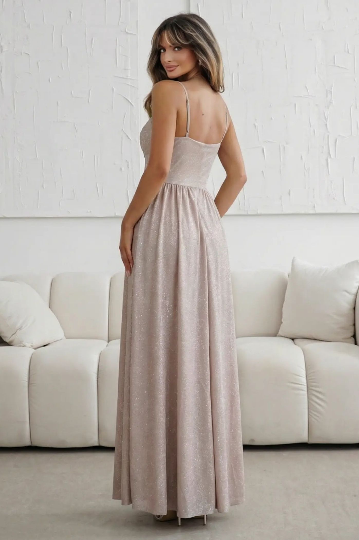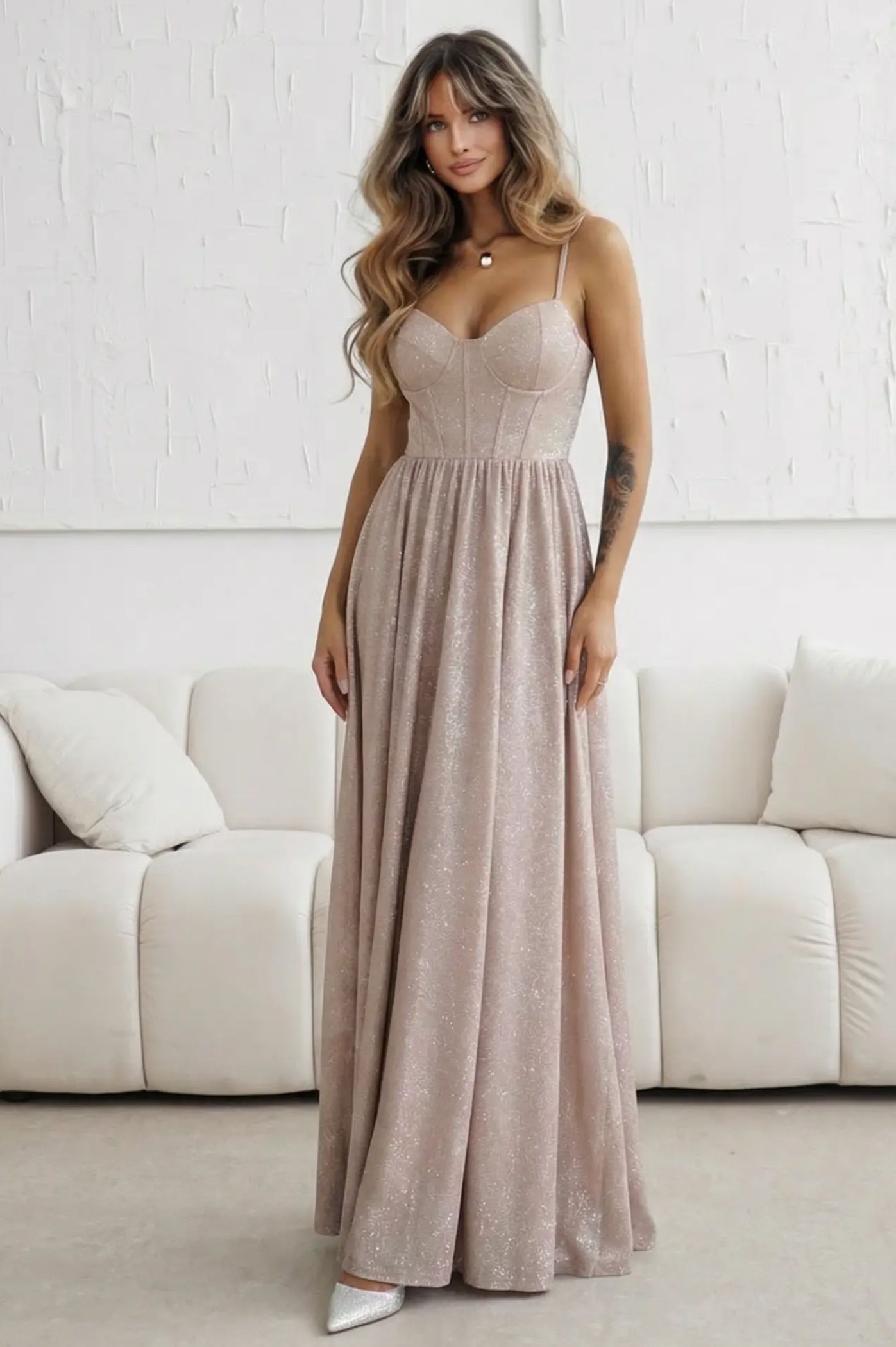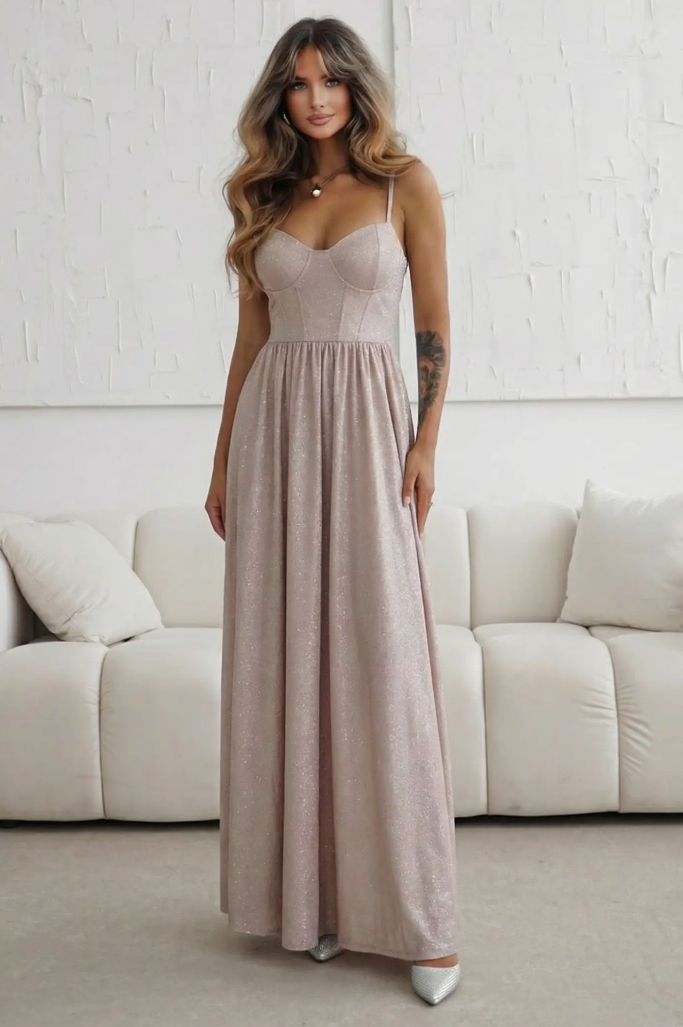 Λάμψτε στην επόμενη βραδινή σας έξοδο με αυτό το αριστοκρατικό μάξι φόρεμα με μεταλλιζέ υφή. Η διακριτική λάμψη του υφάσματος σε συνδυασμό με την κλασική γραμμή το καθιστούν ιδανικό για γκαλά, δεξιώσεις ή επίσημα καλέσματα. Σταθερό μπούστο με σχεδιασμό κορσέ που προσφέρει εξαιρετική υποστήριξη και αναδεικνύει το ντεκολτέ. Υψηλής ποιότητας μεταλλιζέ υλικό που αντανακλά το φως με κάθε σας κίνηση. Μακριά, πλούσια φούστα που πέφτει ομοιόμορφα, χαρίζοντας ύψος και κομψότητα. Minimal αισθητική που αφήνει τους ώμους ακάλυπτους για ένα chic αποτέλεσμα.