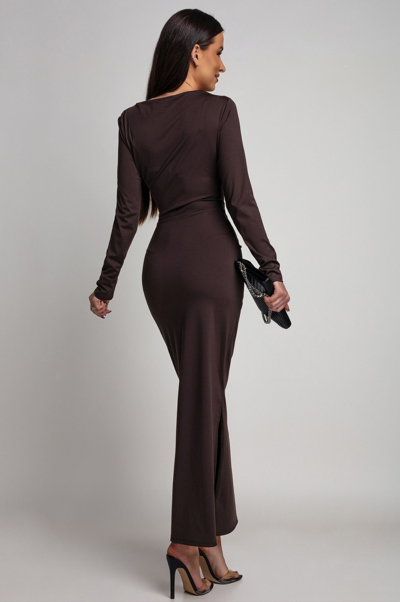 Αναδείξτε την πιο εντυπωσιακή πλευρά σας με αυτό το πολυτελές μάξι φόρεμα, ιδανικό για τις πιο επίσημες περιστάσεις. Το φόρεμα διαθέτει κομψή, εφαρμοστή γραμμή από ελαστικό ύφασμα, εξασφαλίζοντας άψογη εφαρμογή και άνεση καθ' όλη τη διάρκεια της βραδιάς. Οι δραματικές σούρες αγκαλιάζουν στρατηγικά τη σιλουέτα, προσφέροντας ένα άκρως κολακευτικό αποτέλεσμα στη μέση και το μπούστο. Δύο εντυπωσιακές διακοσμητικές αγκράφες, μία στον ώμο και μία κεντρικά στη μέση, προσδίδουν λάμψη και υψηλή αισθητική. Το μακρύ μανίκι και η κλειστή λαιμόκοψη ολοκληρώνουν το σοφιστικέ look.