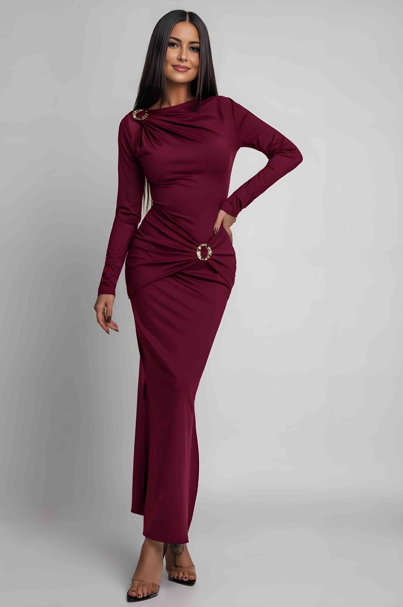 Αναδείξτε την πιο εντυπωσιακή πλευρά σας με αυτό το πολυτελές μάξι φόρεμα, ιδανικό για τις πιο επίσημες περιστάσεις. Το φόρεμα διαθέτει κομψή, εφαρμοστή γραμμή από ελαστικό ύφασμα, εξασφαλίζοντας άψογη εφαρμογή και άνεση καθ' όλη τη διάρκεια της βραδιάς. Οι δραματικές σούρες αγκαλιάζουν στρατηγικά τη σιλουέτα, προσφέροντας ένα άκρως κολακευτικό αποτέλεσμα στη μέση και το μπούστο. Δύο εντυπωσιακές διακοσμητικές αγκράφες, μία στον ώμο και μία κεντρικά στη μέση, προσδίδουν λάμψη και υψηλή αισθητική. Το μακρύ μανίκι και η κλειστή λαιμόκοψη ολοκληρώνουν το σοφιστικέ look.