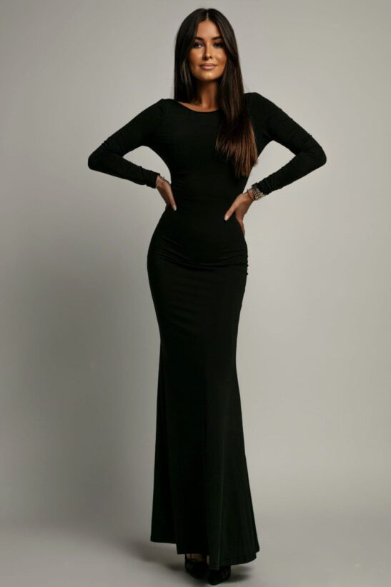 Αναδείξτε το στυλ σας με αυτό το εκθαμβωτικό maxi φόρεμα. Το φόρεμα διαθέτει μακριά μανίκια και στρογγυλή λαιμόκοψη μπροστά, προσφέροντας μια κομψή και κλασική εμφάνιση. Η ανοιχτή πλάτη δίνει έναν αέρα αισθησιασμού, διατηρώντας ταυτόχρονα την απόλυτη φινέτσα. Το ελαστικό ύφασμα τύπου bodycon εξασφαλίζει τέλεια εφαρμογή και άνεση καθ' όλη τη διάρκεια της νύχτας, ενώ το maxi μήκος δίνει ένα αέρα αίγλης. Συνδυάστε το με διακριτικά κοσμήματα και ένα clutch για μια αψεγάδιαστη εμφάνιση.