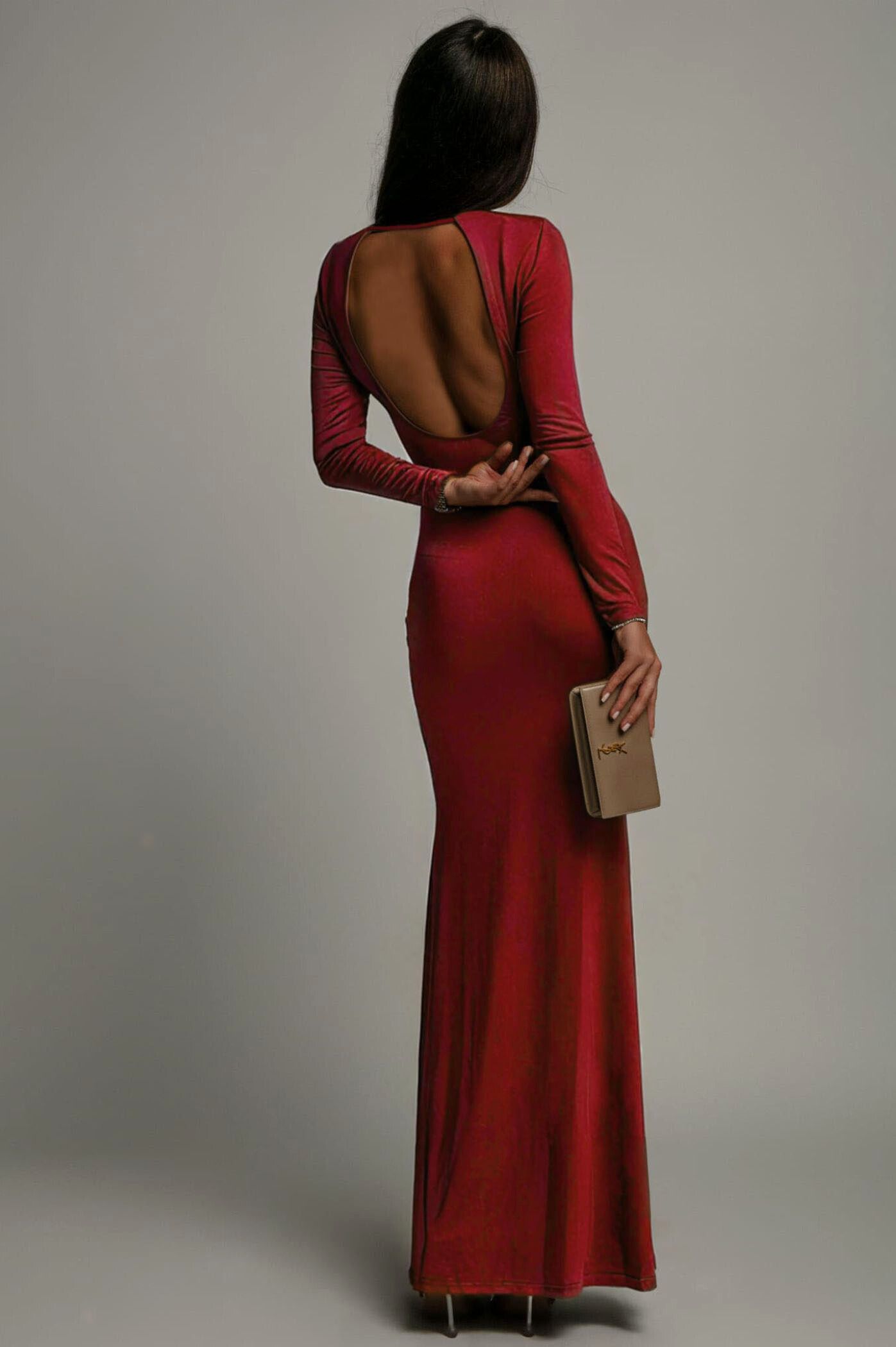 Αναδείξτε το στυλ σας με αυτό το εκθαμβωτικό maxi φόρεμα. Το φόρεμα διαθέτει μακριά μανίκια και στρογγυλή λαιμόκοψη μπροστά, προσφέροντας μια κομψή και κλασική εμφάνιση. Η ανοιχτή πλάτη δίνει έναν αέρα αισθησιασμού, διατηρώντας ταυτόχρονα την απόλυτη φινέτσα. Το ελαστικό ύφασμα τύπου bodycon εξασφαλίζει τέλεια εφαρμογή και άνεση καθ' όλη τη διάρκεια της νύχτας, ενώ το maxi μήκος δίνει ένα αέρα αίγλης. Συνδυάστε το με διακριτικά κοσμήματα και ένα clutch για μια αψεγάδιαστη εμφάνιση.