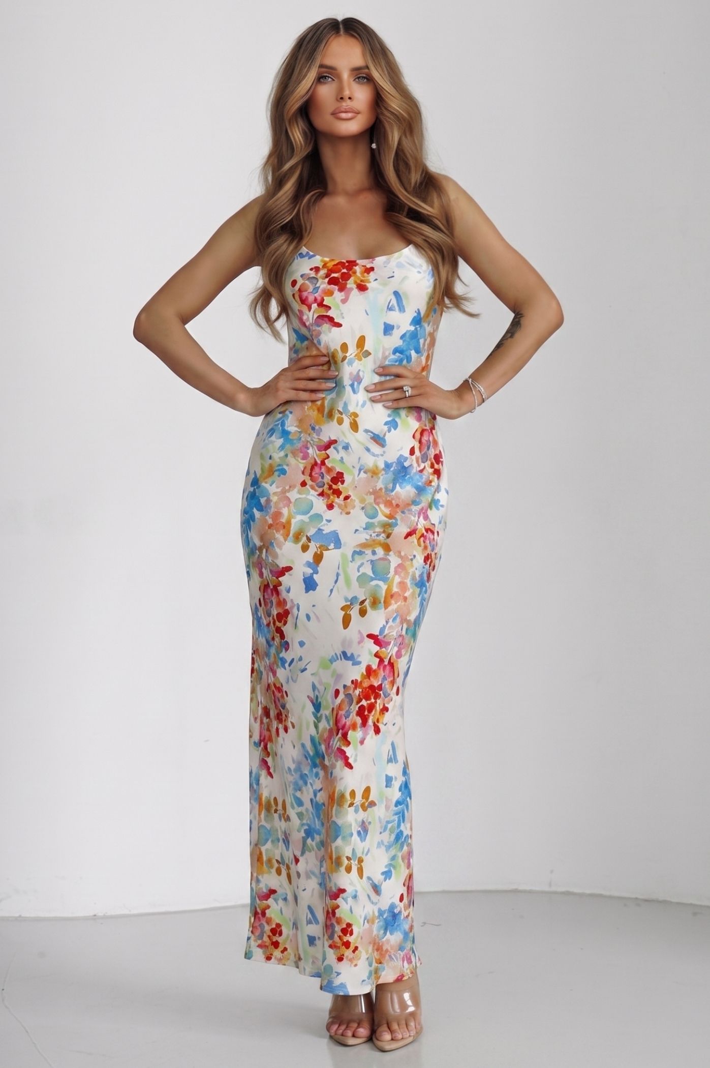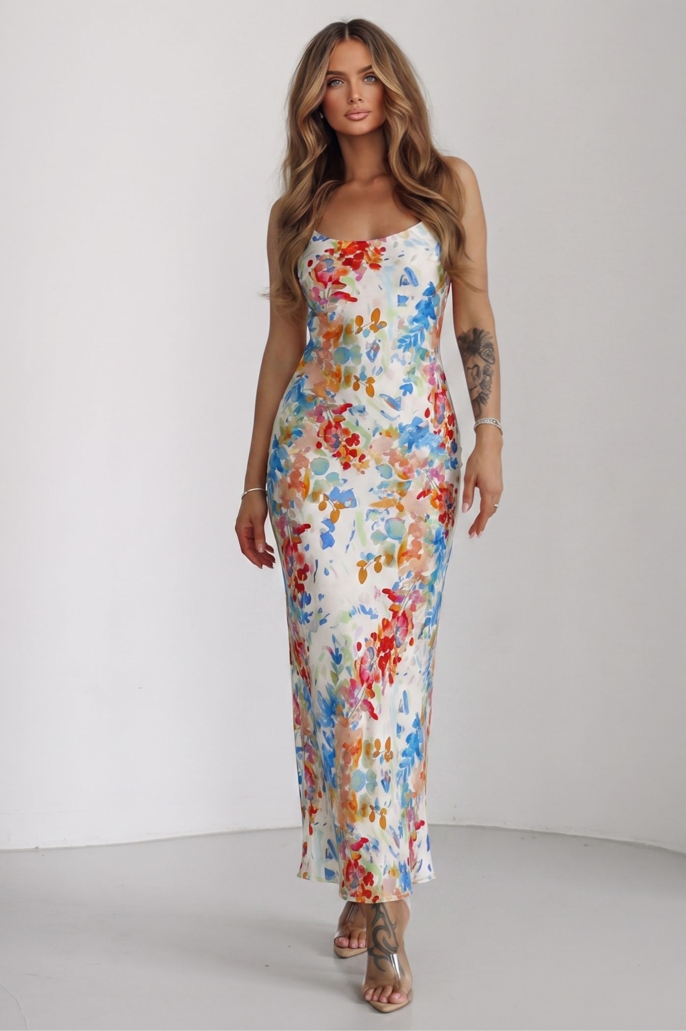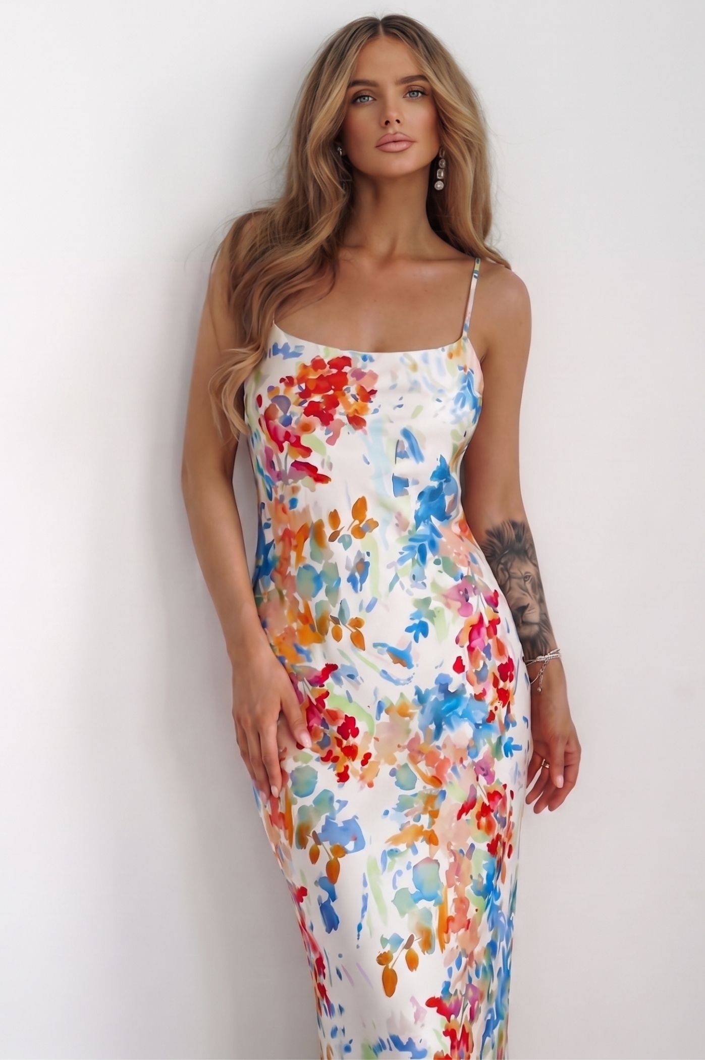 Αναδείξτε φινέτσα και θηλυκότητα με αυτό το υπέροχο maxi floral φόρεμα. Ιδανικό για καλοκαιρινές εκδηλώσεις, δεξιώσεις ή μια βραδινή έξοδο δίπλα στο κύμα, το φόρεμα αυτό συνδυάζει την αέρινη γραμμή με ένα εντυπωσιακό, πολύχρωμο floral μοτίβο που κλέβει τις εντυπώσεις. Το έντονο και καλλιτεχνικό floral print με ζωηρές αποχρώσεις προσφέρει μια αίσθηση ζωντάνιας και φρεσκάδας. Η maxi, στενή γραμμή που αγκαλιάζει απαλά το σώμα αναδεικνύει τη σιλουέτα σας με τον πιο κολακευτικό τρόπο. Οι διακριτικές λεπτές τιράντες προσδίδουν μια "clean & chic" αισθητική, επιτρέποντας στο εντυπωσιακό μοτίβο του υφάσματος να αποτελέσει τον πρωταγωνιστή του συνόλου. Το ύφασμα έχει μια πολυτελή υφή που χαρίζει κίνηση και άνεση, κάνοντάς το την ιδανική επιλογή για όσες θέλουν να συνδυάσουν το στυλ με την άνεση.