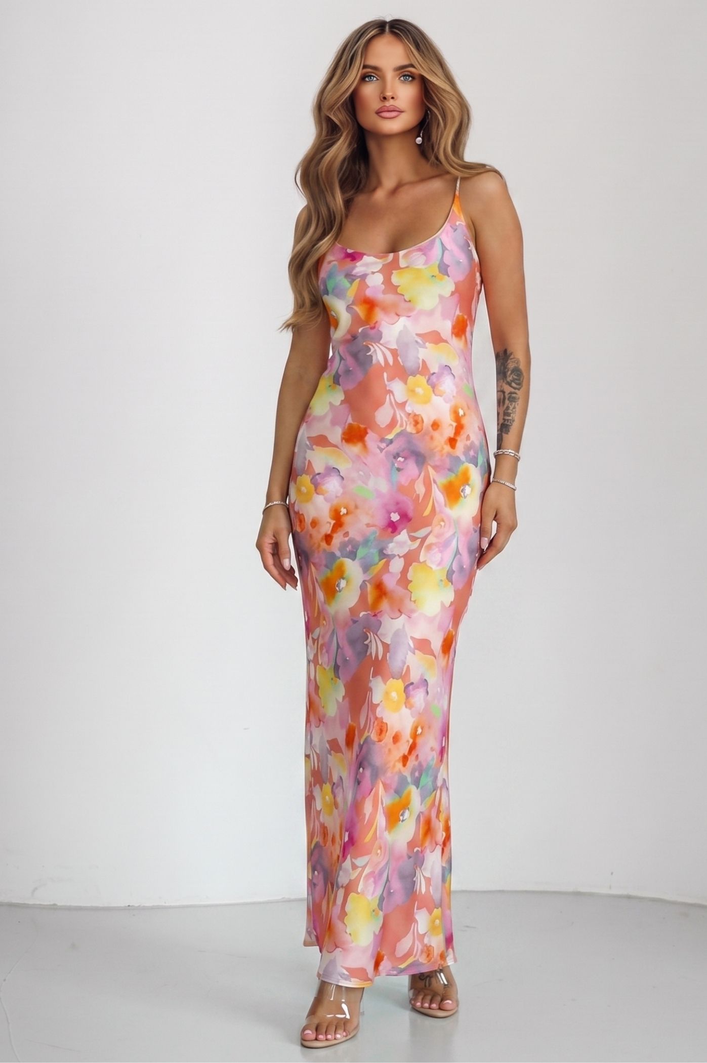 Αναδείξτε φινέτσα και θηλυκότητα με αυτό το υπέροχο maxi floral φόρεμα. Ιδανικό για καλοκαιρινές εκδηλώσεις, δεξιώσεις ή μια βραδινή έξοδο δίπλα στο κύμα, το φόρεμα αυτό συνδυάζει την αέρινη γραμμή με ένα εντυπωσιακό, πολύχρωμο floral μοτίβο που κλέβει τις εντυπώσεις. Το έντονο και καλλιτεχνικό floral print με ζωηρές αποχρώσεις προσφέρει μια αίσθηση ζωντάνιας και φρεσκάδας. Η maxi, στενή γραμμή που αγκαλιάζει απαλά το σώμα αναδεικνύει τη σιλουέτα σας με τον πιο κολακευτικό τρόπο. Οι διακριτικές λεπτές τιράντες προσδίδουν μια "clean & chic" αισθητική, επιτρέποντας στο εντυπωσιακό μοτίβο του υφάσματος να αποτελέσει τον πρωταγωνιστή του συνόλου. Το ύφασμα έχει μια πολυτελή υφή που χαρίζει κίνηση και άνεση, κάνοντάς το την ιδανική επιλογή για όσες θέλουν να συνδυάσουν το στυλ με την άνεση.