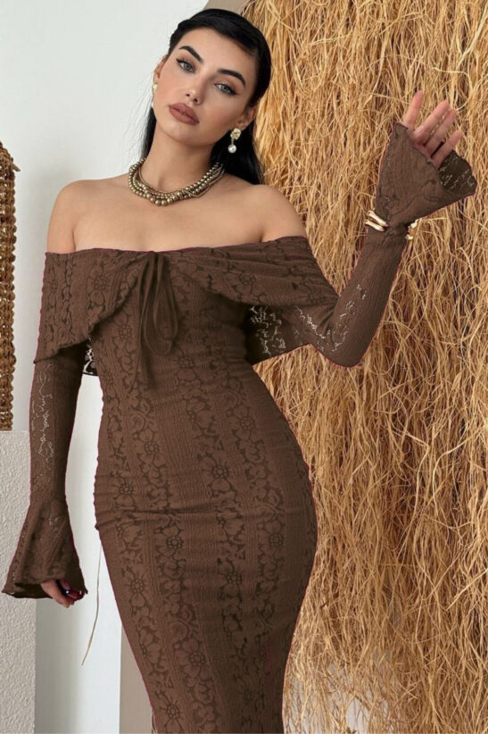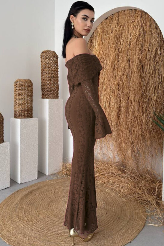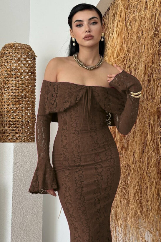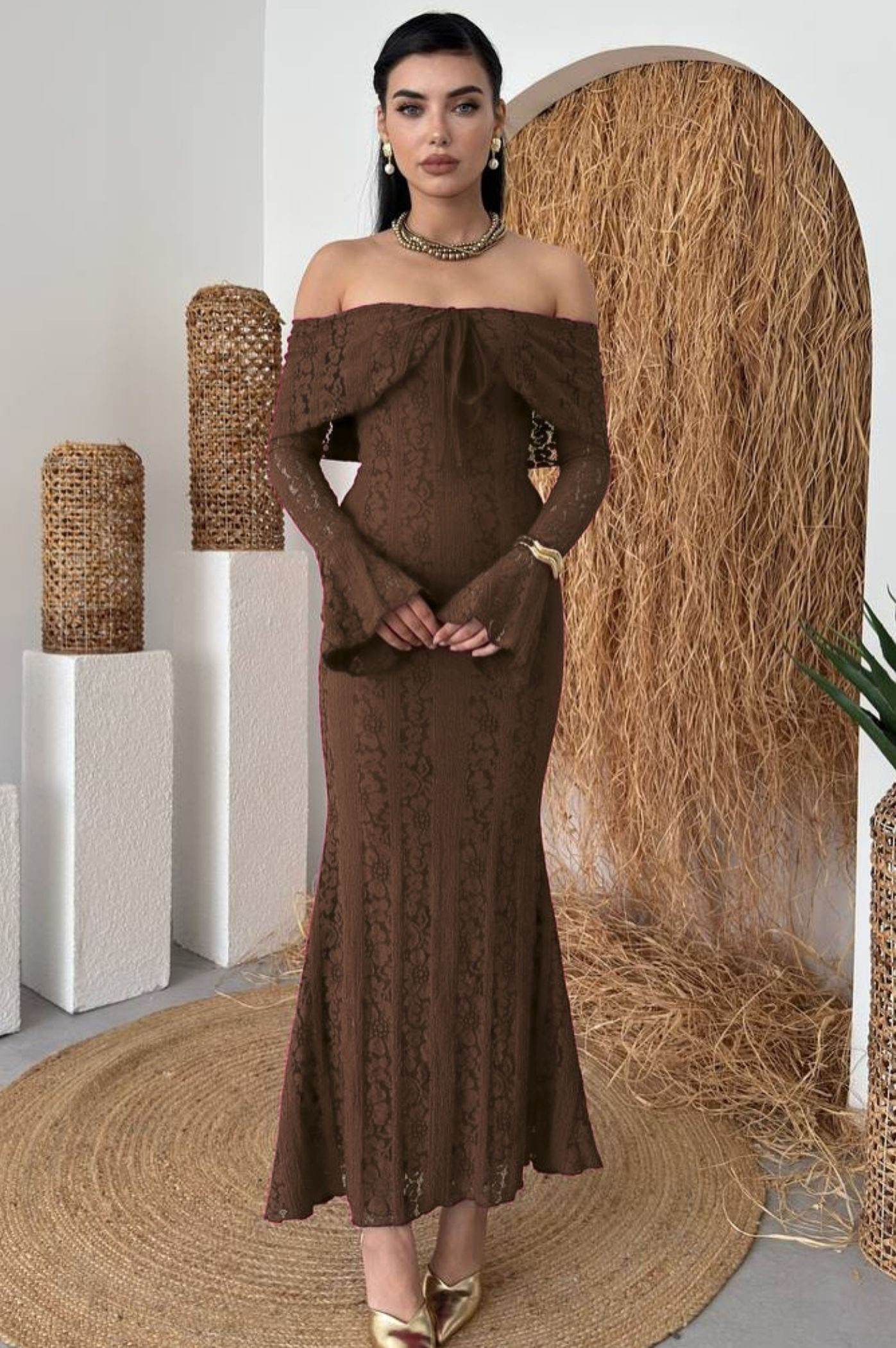 ΦΟΡΕΜΑ MAXI OFF SHOULDER ΜΕ ΔΑΝΤΕΛΑ ΚΑΙ ΚΑΜΠΑΝΑ ΜΑΝΙΚΙΑ – ΚΑΦΕ