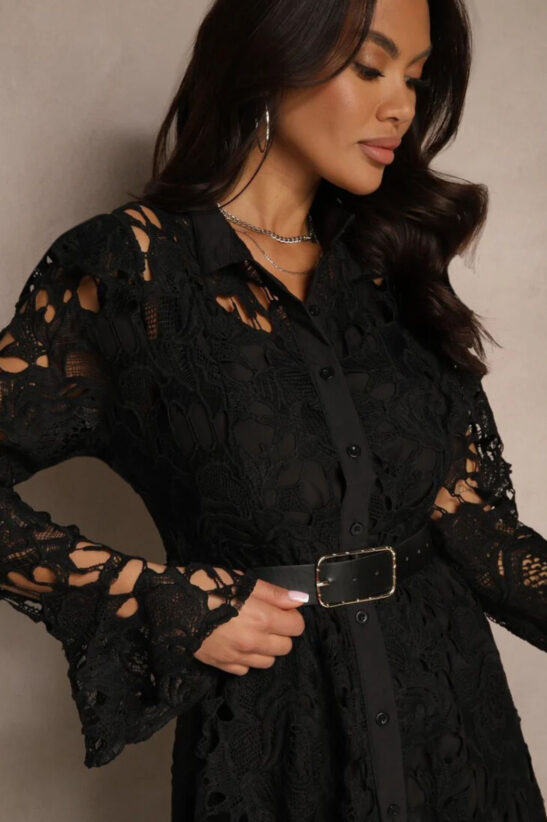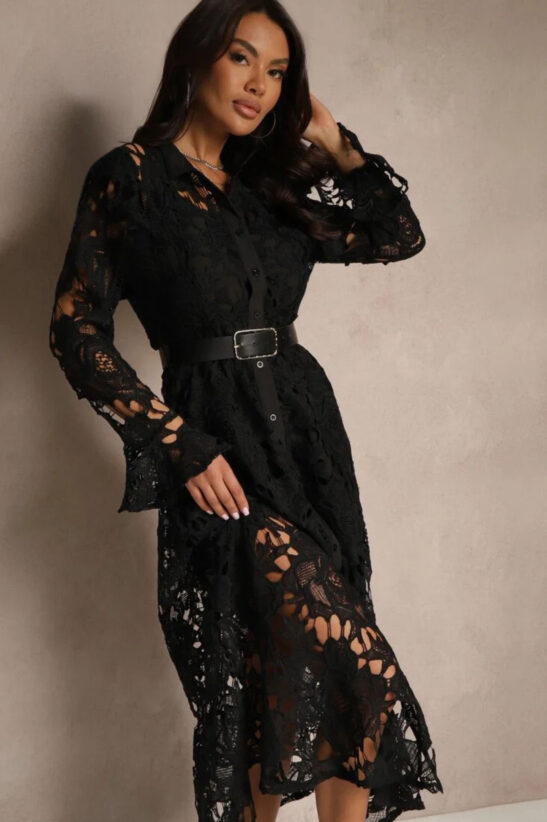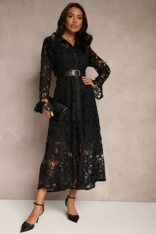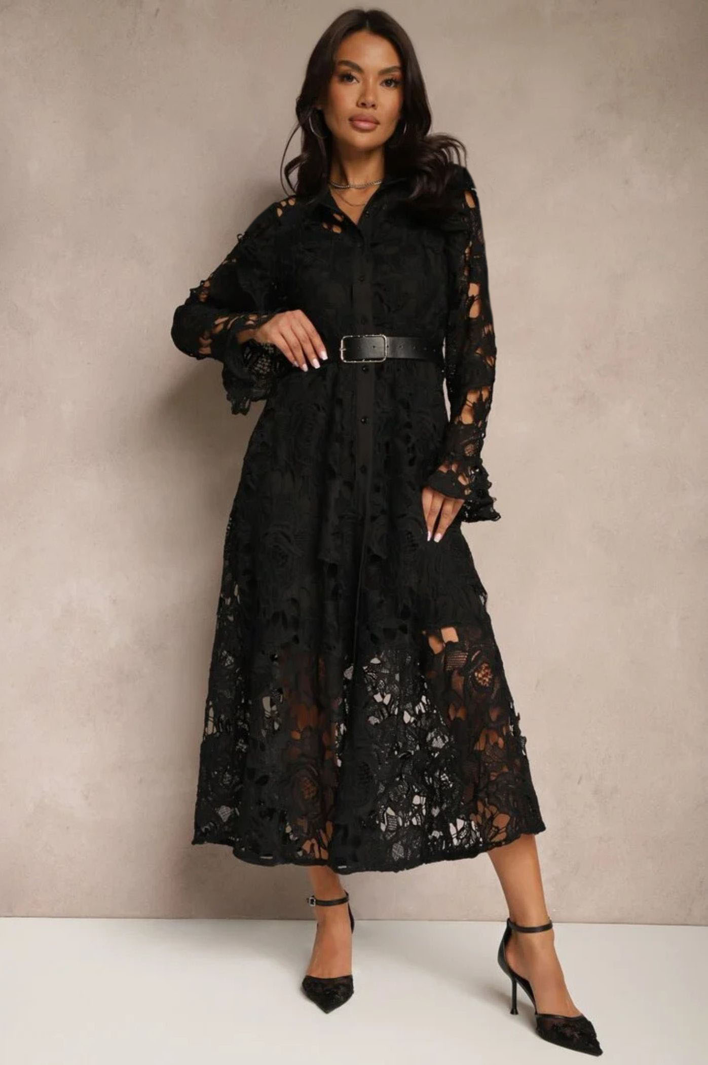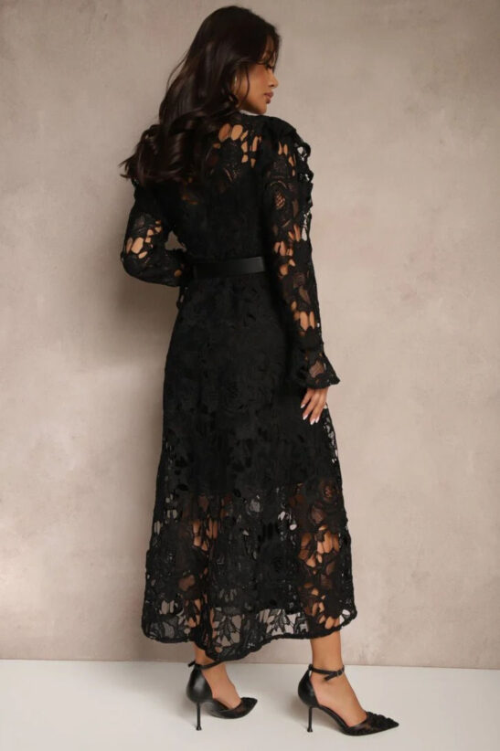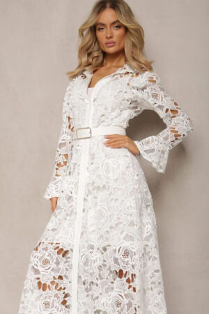 Φόρεμα maxi κιπούρ με κουμπιά κατά μήκος του φορέματος και ζώνη. Διαθέτει μεσοφόρι.