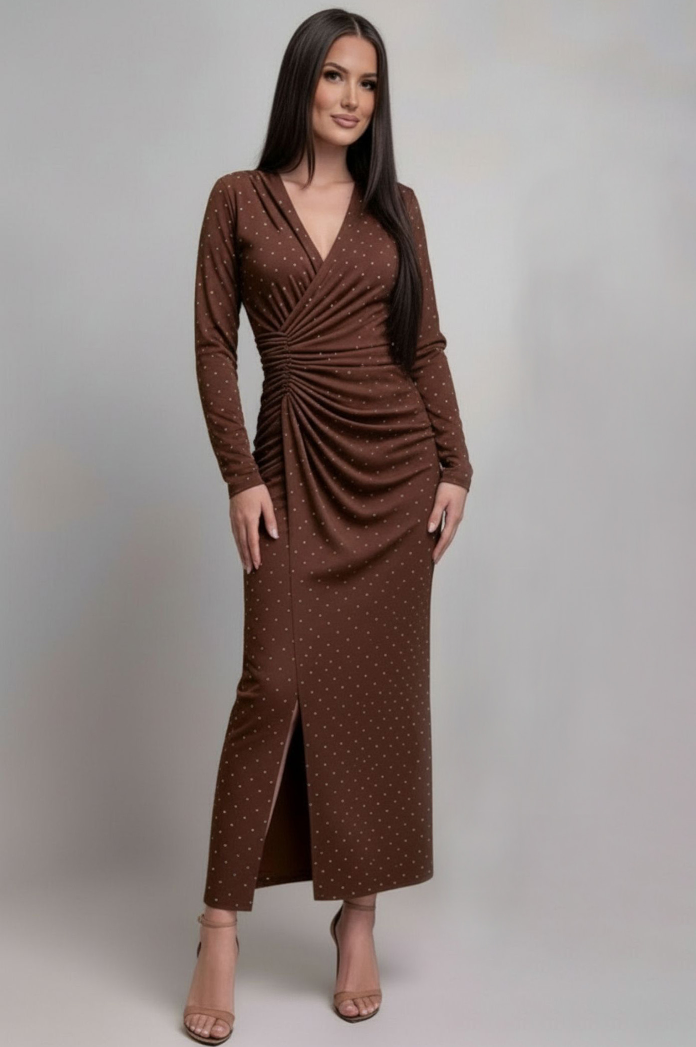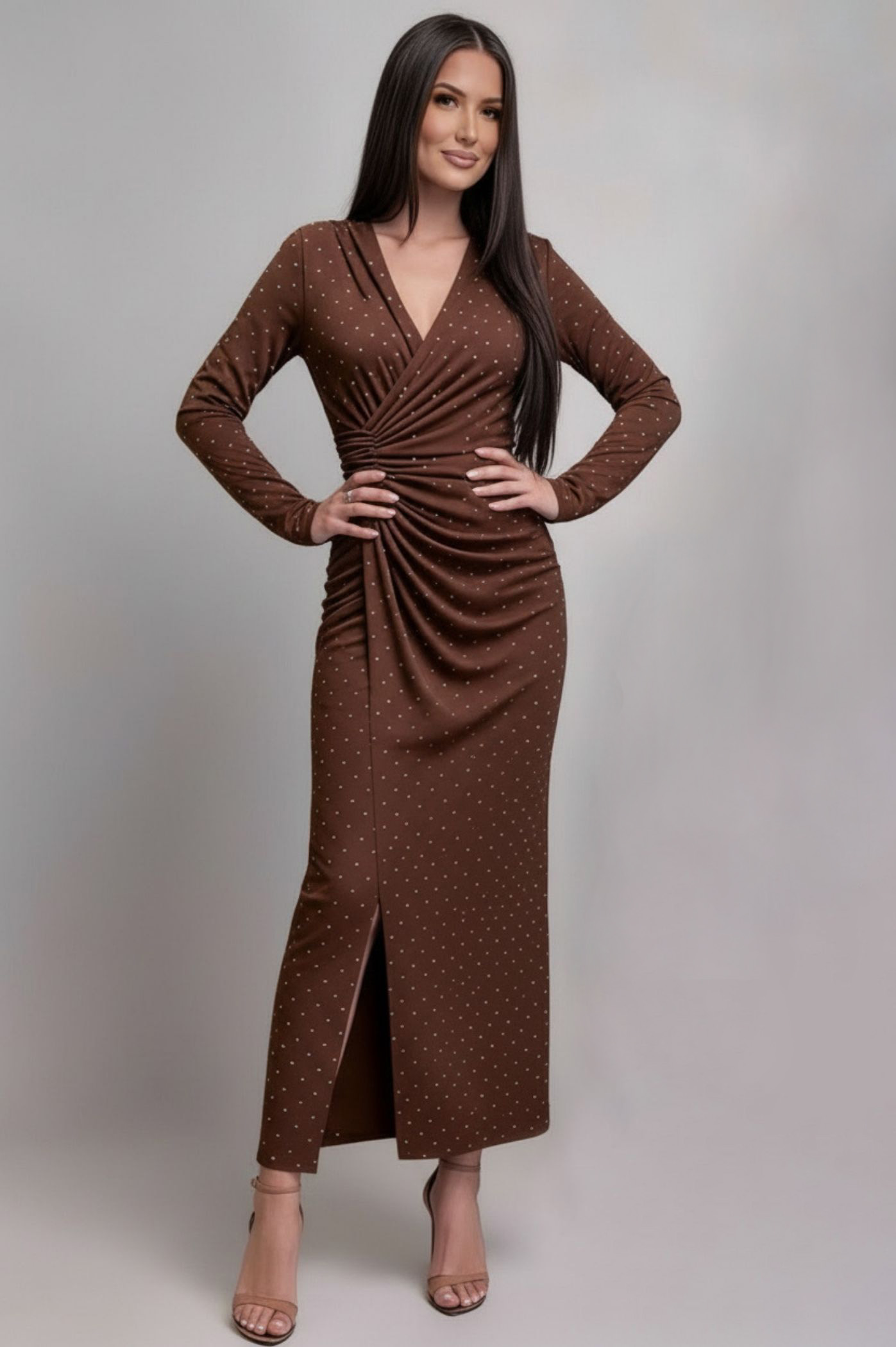 Εκθαμβωτικό μάξι φόρεμα κρουαζέ με μακριά μανίκια, ιδανικό για επίσημες εμφανίσεις, ρεβεγιόν και χριστουγεννιάτικα πάρτι. Το φόρεμα διαθέτει εντυπωσιακό all-over διακόσμηση από στρασάκια που προσδίδει λάμψη και πολυτέλεια. Η εφαρμοστή εφαρμογή αγκαλιάζει τη σιλουέτα, ενώ το ψηλό σκίσιμο στο πόδι προσφέρει κίνηση και θηλυκότητα. Ο σχεδιασμός κρουαζέ στη μέση δημιουργεί ένα κομψό draping, τονίζοντας τη μέση. Συνδυάστε το με χρυσά ή nude πέδιλα και ένα μαύρο clutch για μια ακαταμάχητη βραδινή εμφάνιση. Ιδανικό φόρεμα για γάμο, βάπτιση ή δεξίωση.