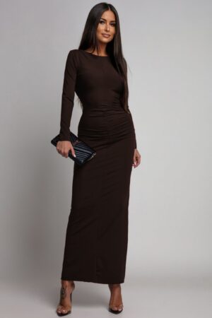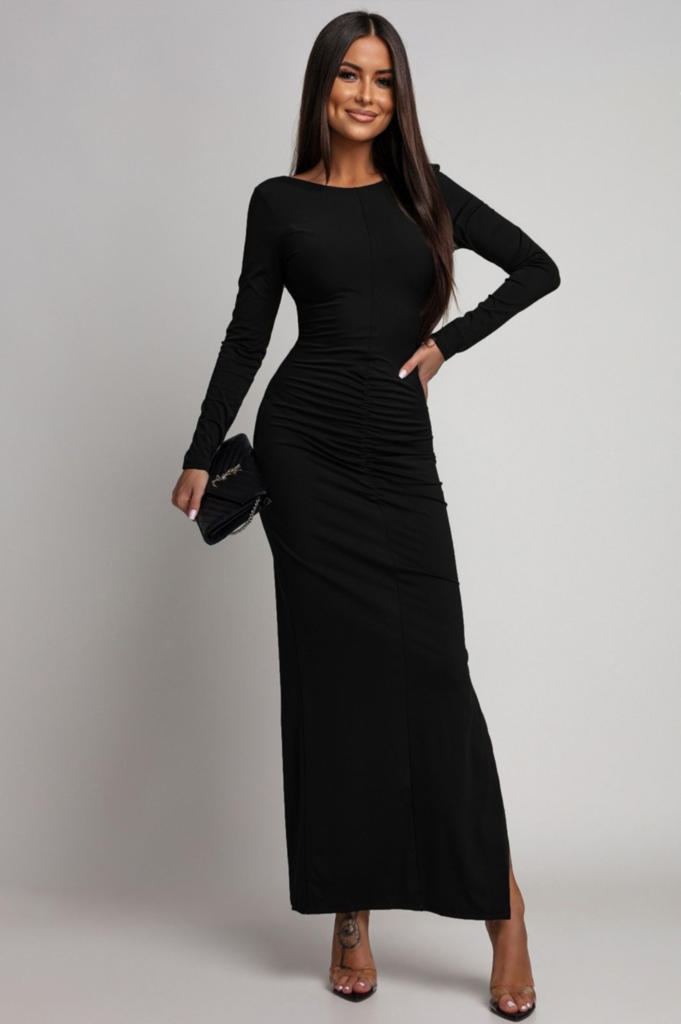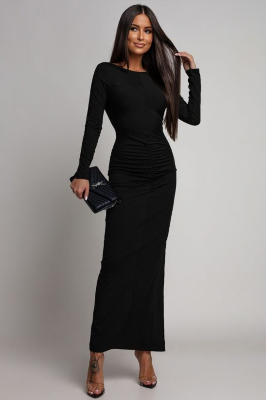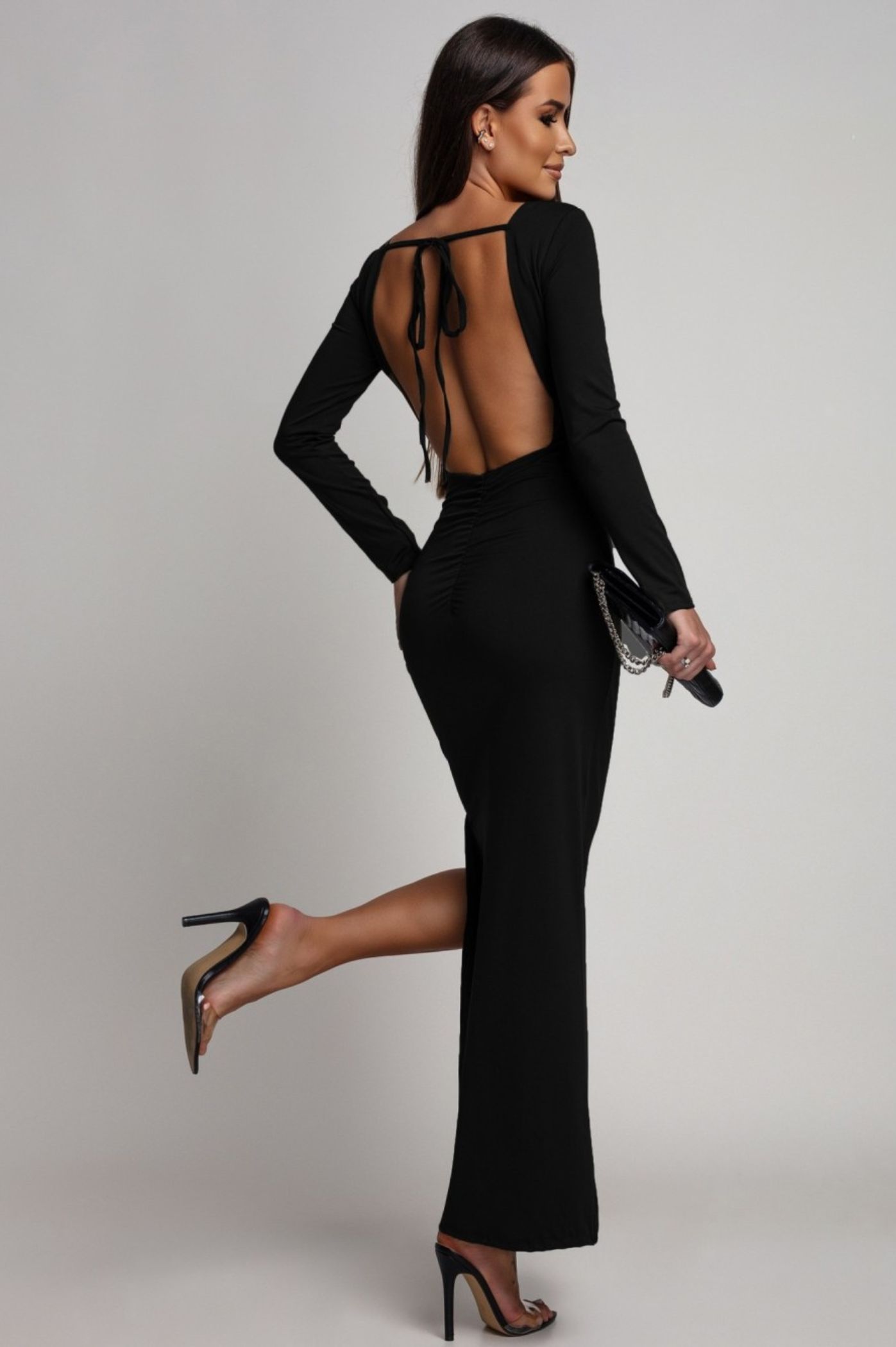 Αναδείξτε το στυλ σας με αυτό το φόρεμα σχεδιασμένο για να εντυπωσιάζει από κάθε γωνία. Το φόρεμα συνδυάζει την κομψότητα των μακριών μανικιών με τον απόλυτο αισθησιασμό μιας πολύ ανοιχτής πλάτης. Η πλάτη δένει ψηλά στον αυχένα με λεπτά κορδόνια, προσφέροντας ένα μοναδικό στυλ. Το ελαστικό ύφασμα bodycon και οι διακριτικές σούρες στο πίσω μέρος τονίζουν υπέροχα τη σιλουέτα. Διαθέτει διακριτικό σχίσιμο στο πόδι, που αποκαλύπτεται με χάρη σε κάθε σας βήμα.