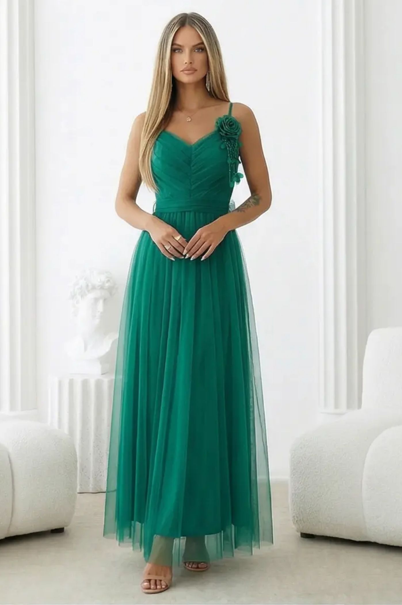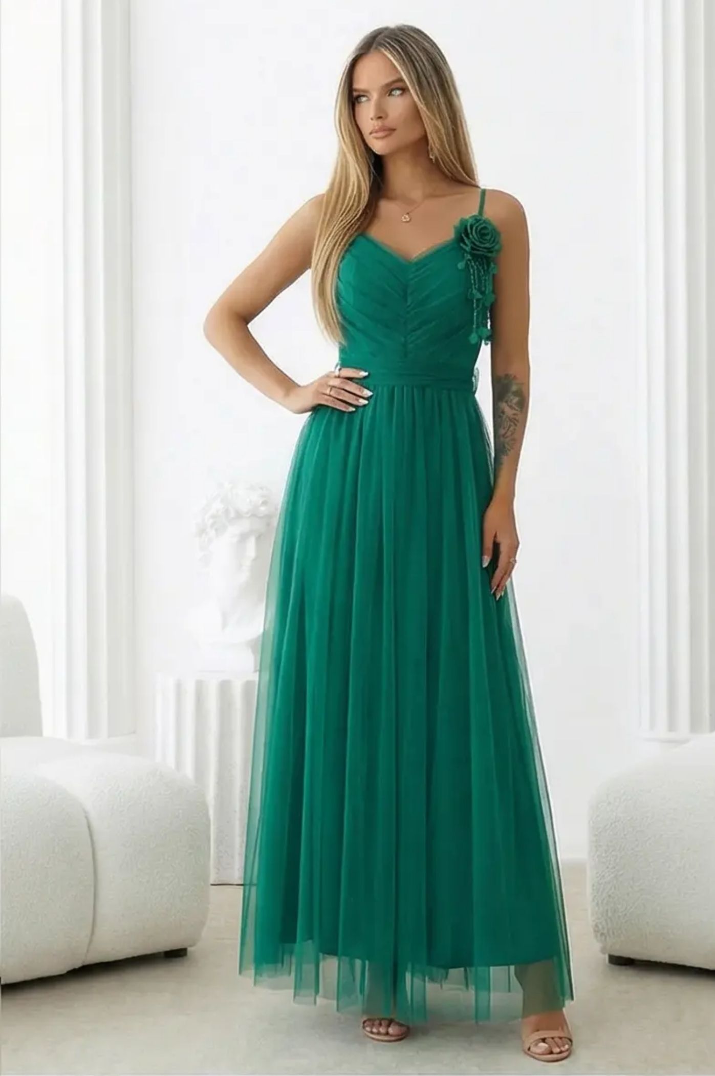 Αναδείξτε την εμφάνισή σας σε μια αιθέρια παρουσία με αυτό το πανέμορφο maxi φόρεμα από τούλι. Η αέρινη γραμμή του το καθιστά την απόλυτη επιλογή για περιστάσεις όπου θέλετε να ακτινοβολείτε κομψότητα και ρομαντισμό. Οι πολλαπλές στρώσεις από τούλι δημιουργούν έναν εντυπωσιακό όγκο και κίνηση, προσφέροντας μια πριγκιπική αίσθηση. Το μπούστο διαθέτει περίτεχνο σχεδιασμό με σούρες που αγκαλιάζει ομοιόμορφα το σώμα, καταλήγοντας σε μια κολακευτική λαιμόκοψη σχήματος V. Διακοσμημένο με ένα τρισδιάστατο λουλούδι στον ώμο, που προσθέτει μια μοναδική, couture πινελιά. Η ζώνη από το ίδιο ύφασμα ορίζει τη μέση, αναδεικνύοντας τη θηλυκότητά σας.