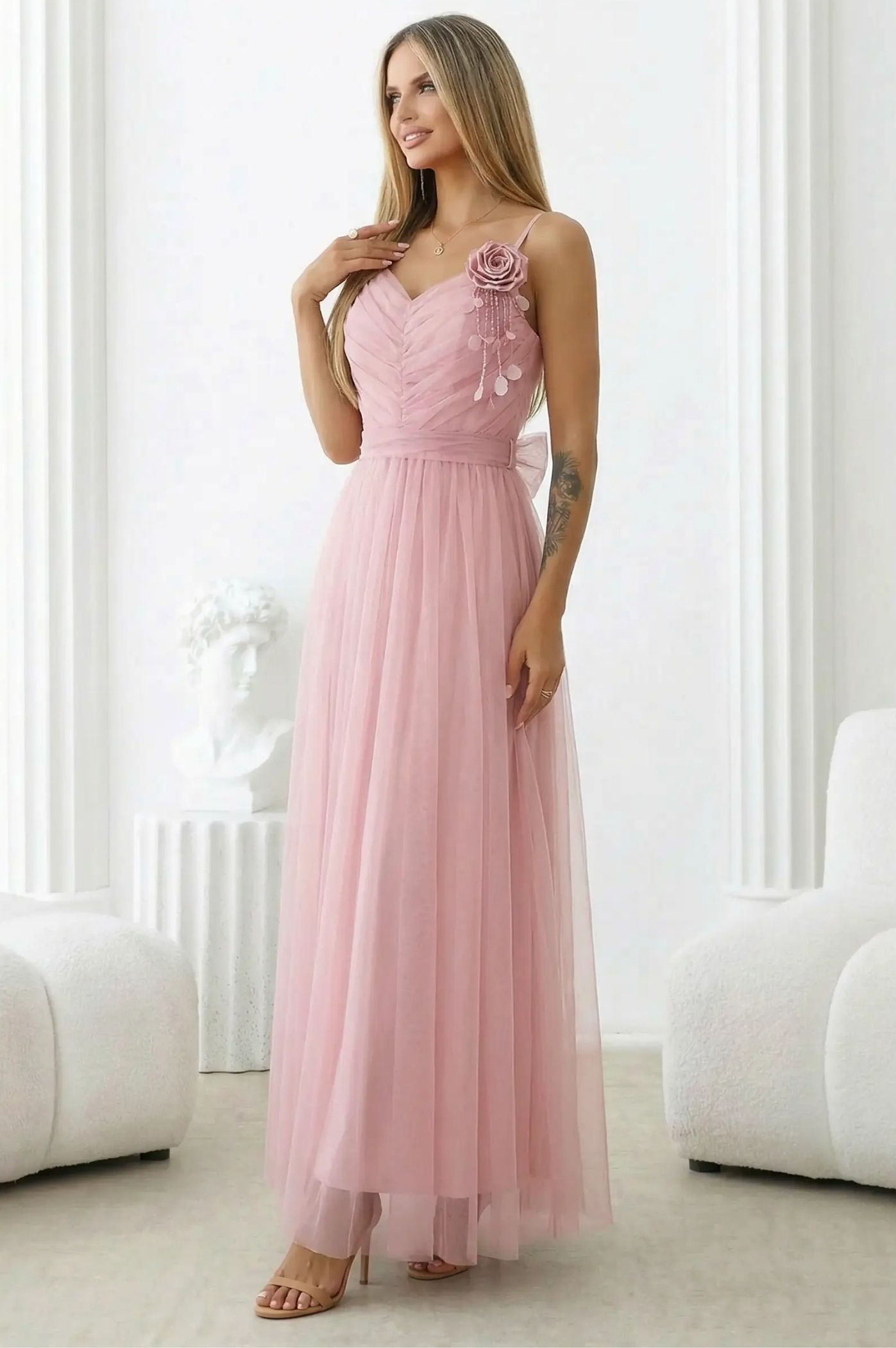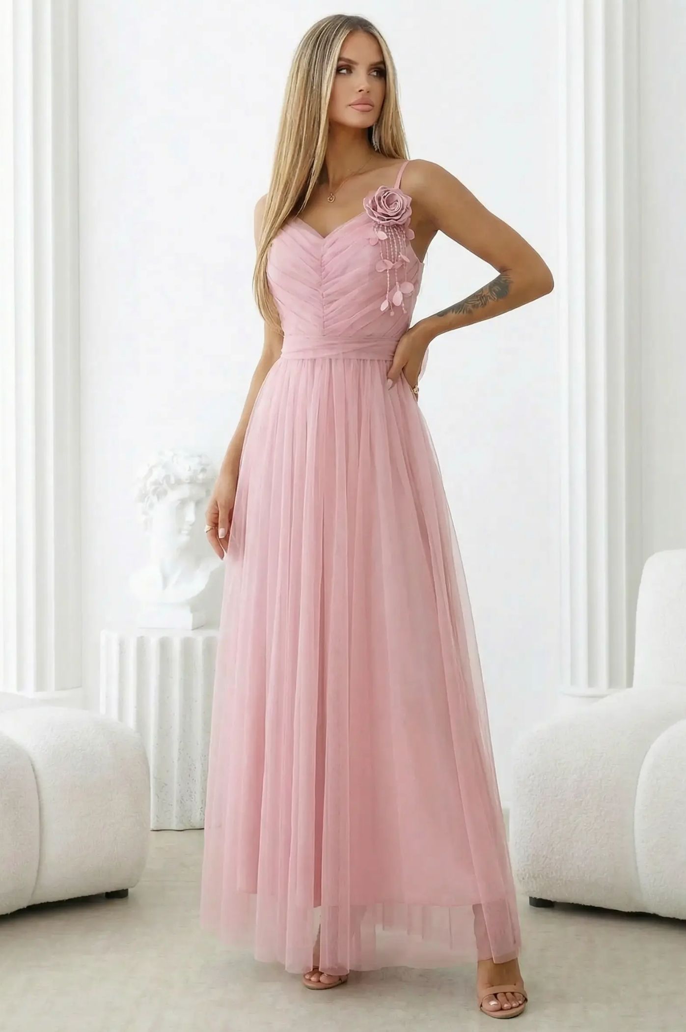 Αναδείξτε την εμφάνισή σας σε μια αιθέρια παρουσία με αυτό το πανέμορφο maxi φόρεμα από τούλι. Η αέρινη γραμμή του το καθιστά την απόλυτη επιλογή για περιστάσεις όπου θέλετε να ακτινοβολείτε κομψότητα και ρομαντισμό. Οι πολλαπλές στρώσεις από τούλι δημιουργούν έναν εντυπωσιακό όγκο και κίνηση, προσφέροντας μια πριγκιπική αίσθηση. Το μπούστο διαθέτει περίτεχνο σχεδιασμό με σούρες που αγκαλιάζει ομοιόμορφα το σώμα, καταλήγοντας σε μια κολακευτική λαιμόκοψη σχήματος V. Διακοσμημένο με ένα τρισδιάστατο λουλούδι στον ώμο, που προσθέτει μια μοναδική, couture πινελιά. Η ζώνη από το ίδιο ύφασμα ορίζει τη μέση, αναδεικνύοντας τη θηλυκότητά σας.