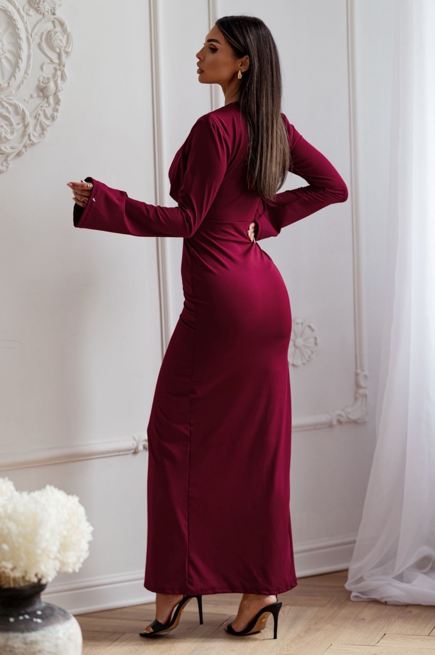 Εντυπωσιάστε σε κάθε επίσημη εκδήλωση με αυτό το εκθαμβωτικό μάξι φόρεμα που αποπνέει πολυτέλεια και δυναμισμό. Το φόρεμα είναι η επιτομή του βραδινού chic και αποτελεί την ιδανική επιλογή για επίσημες εμφανίσεις, γάμους ή κοκτέιλ πάρτι. Διαθέτει βαθύ ντεκολτέ V με περίτεχνες χρυσές διακοσμήσεις σε σχήμα ήλιου/άστρου, οι οποίες τονίζουν το μπούστο και τη μέση. Η μακρυά γραμμή του φορέματος και το ψηλό σχίσιμο στο πόδι δημιουργούν μια άκρως θηλυκή σιλουέτα που επιμηκύνει το σώμα. Τα μακριά μανίκια καταλήγουν σε άνοιγμα, προσθέτοντας μια δραματική πινελιά. Αναζητάτε ένα sexy φόρεμα ή ένα φόρεμα τουαλέτα; Αυτό το κομμάτι είναι η απόλυτη δήλωση στυλ.
