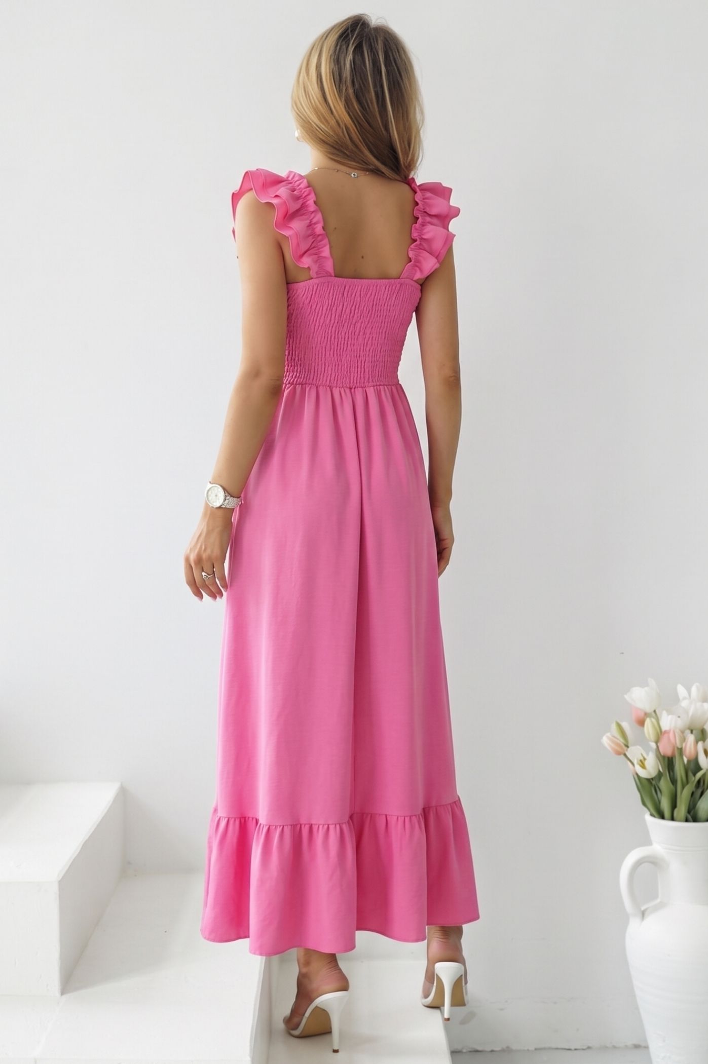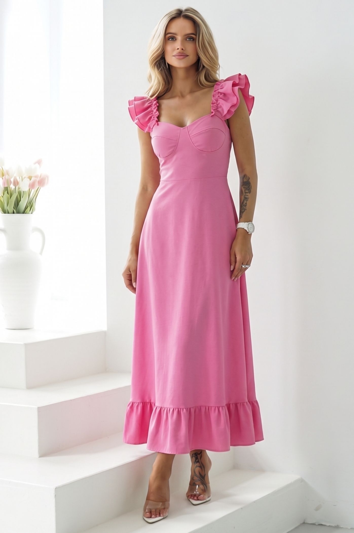 Κλέψτε την παράσταση με αυτό το μοναδικό maxi φόρεμα. Ένα statement κομμάτι που συνδυάζει τον ρομαντισμό με τη δυναμική εμφάνιση, ιδανικό για να ξεχωρίσετε σε κάθε επίσημη ή κοινωνική σας εμφάνιση. Τα διακριτικά βολάν στους ώμους προσθέτουν μια θηλυκή και παιχνιδιάρικη διάθεση, ενώ το βολάν στο τελείωμα χαρίζει κίνηση και χάρη στη σιλουέτα. Το μπούστο σε στυλ κορσέ αγκαλιάζει και αναδεικνύει το στήθος, προσφέροντας μια κομψή και σταθερή εφαρμογή. Η maxi γραμμή του εξασφαλίζει άνεση, καθιστώντας το ιδανικό για γάμους, βαπτίσεις ή καλοκαιρινά events.