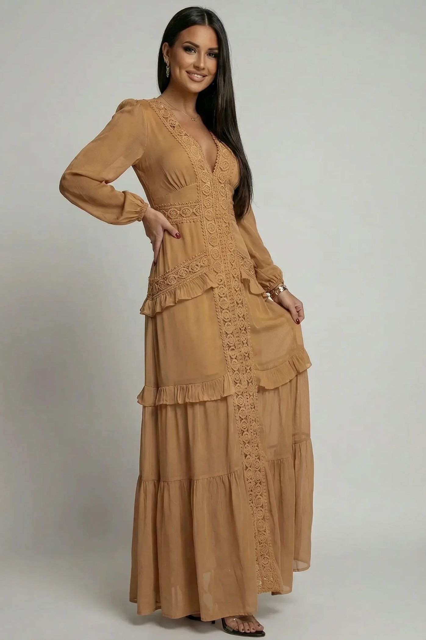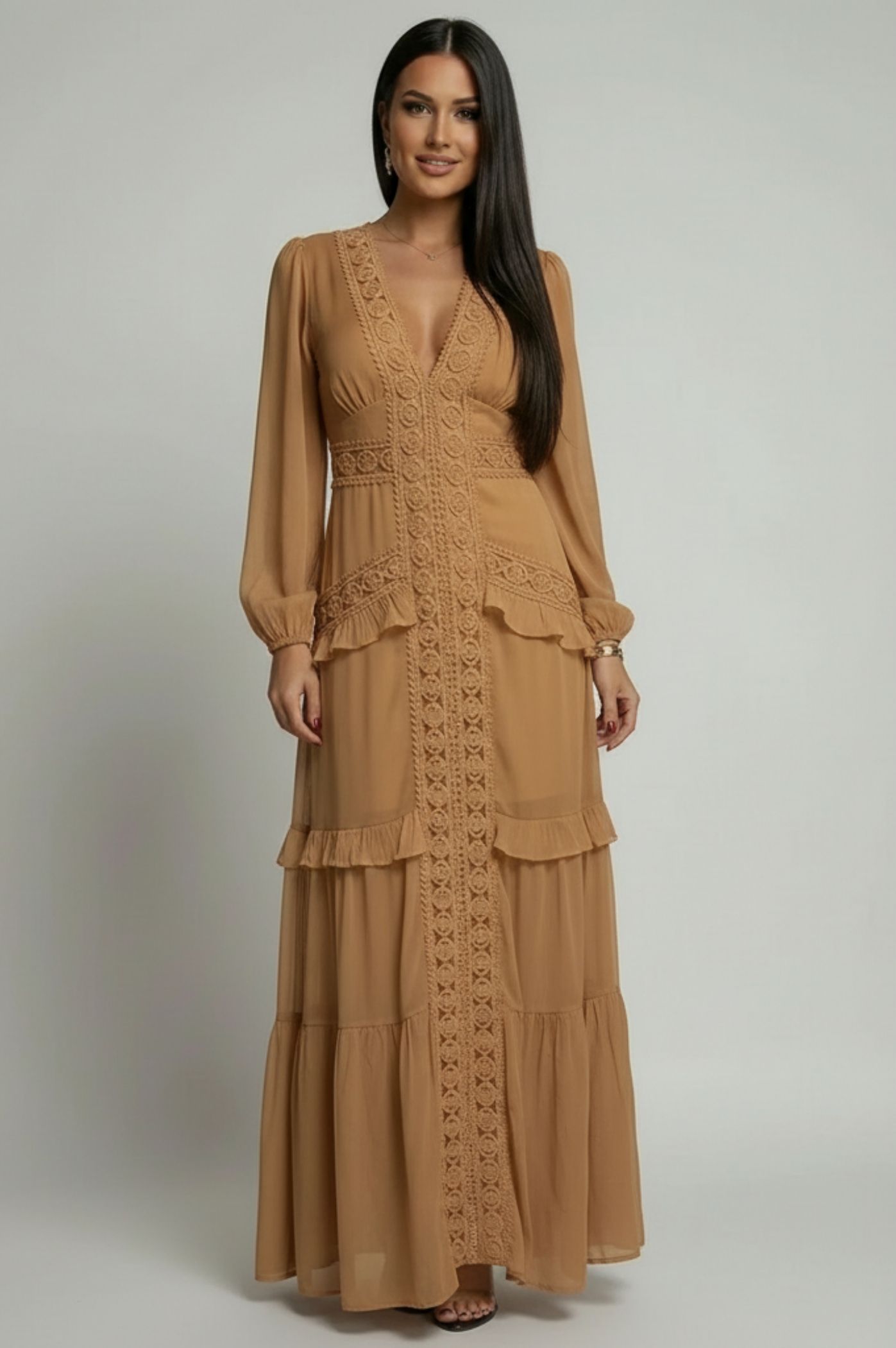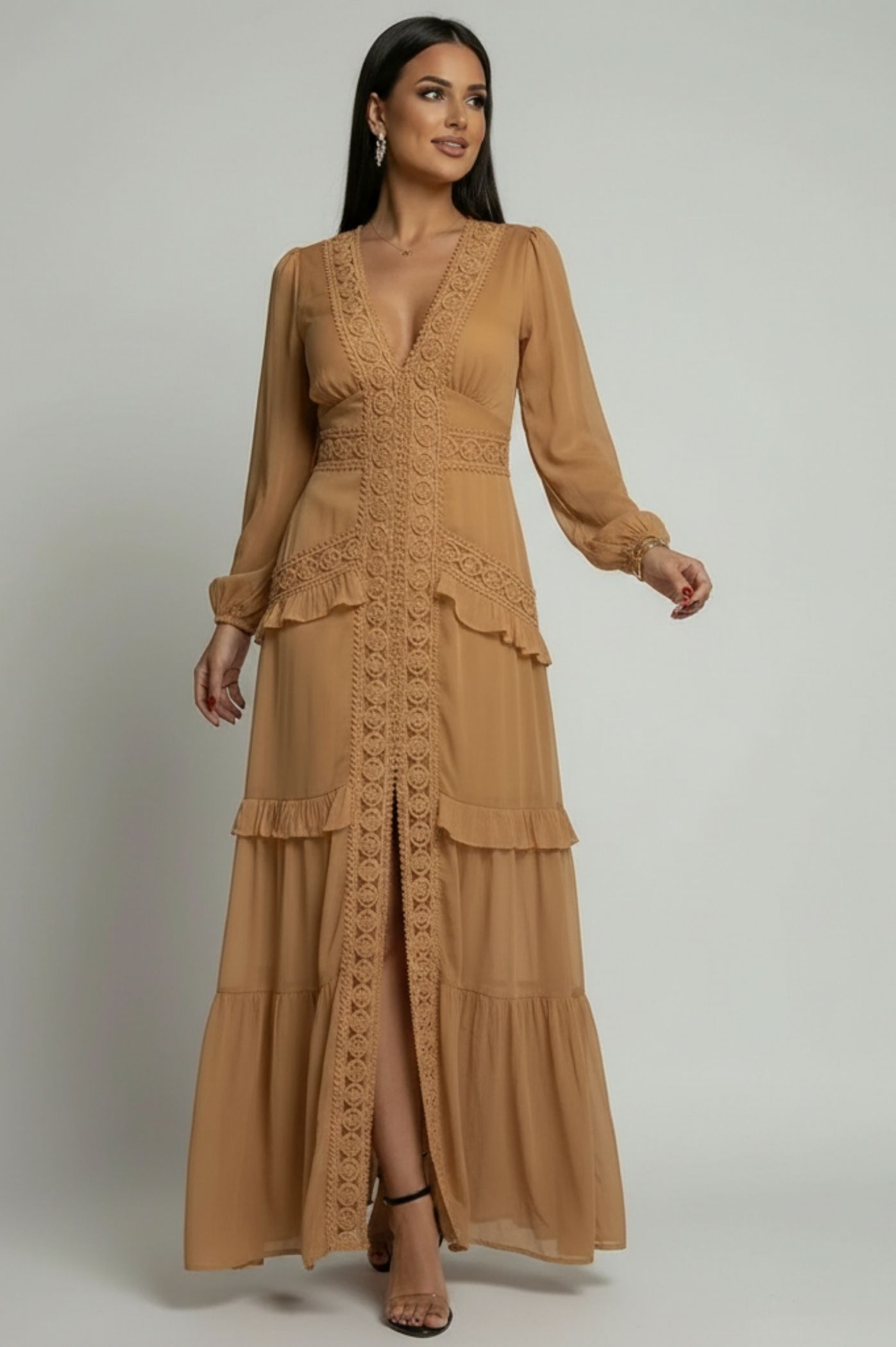 Αναδείξτε τη θηλυκότητά σας με αυτό το εντυπωσιακό μάξι φόρεμα, ιδανικό για κοινωνικές εκδηλώσεις, βαπτίσεις ή καλοκαιρινές βραδινές εξόδους. Σχεδιασμένο με έμφαση στη λεπτομέρεια, συνδυάζει την αέρινη αίσθηση του σιφόν με ρομαντικά boho στοιχεία. Διακοσμημένο με περίτεχνο κέντημα που πλαισιώνει το στήθος και συνεχίζει κάθετα, επιμηκύνοντας τη σιλουέτα. Διαθέτει διακριτικά βολάν στη μέση και στο κάτω μέρος της φούστας, προσθέτοντας κίνηση και όγκο στο πέρασμά σας. Τα ελαφριά μανίκια με λάστιχο στους καρπούς προσφέρουν μια chic και ταυτόχρονα ανάλαφρη κάλυψη. Η εφαρμοστή μέση και η χυτή φούστα κολακεύουν κάθε σωματότυπο, προσφέροντας άνεση και στυλ.