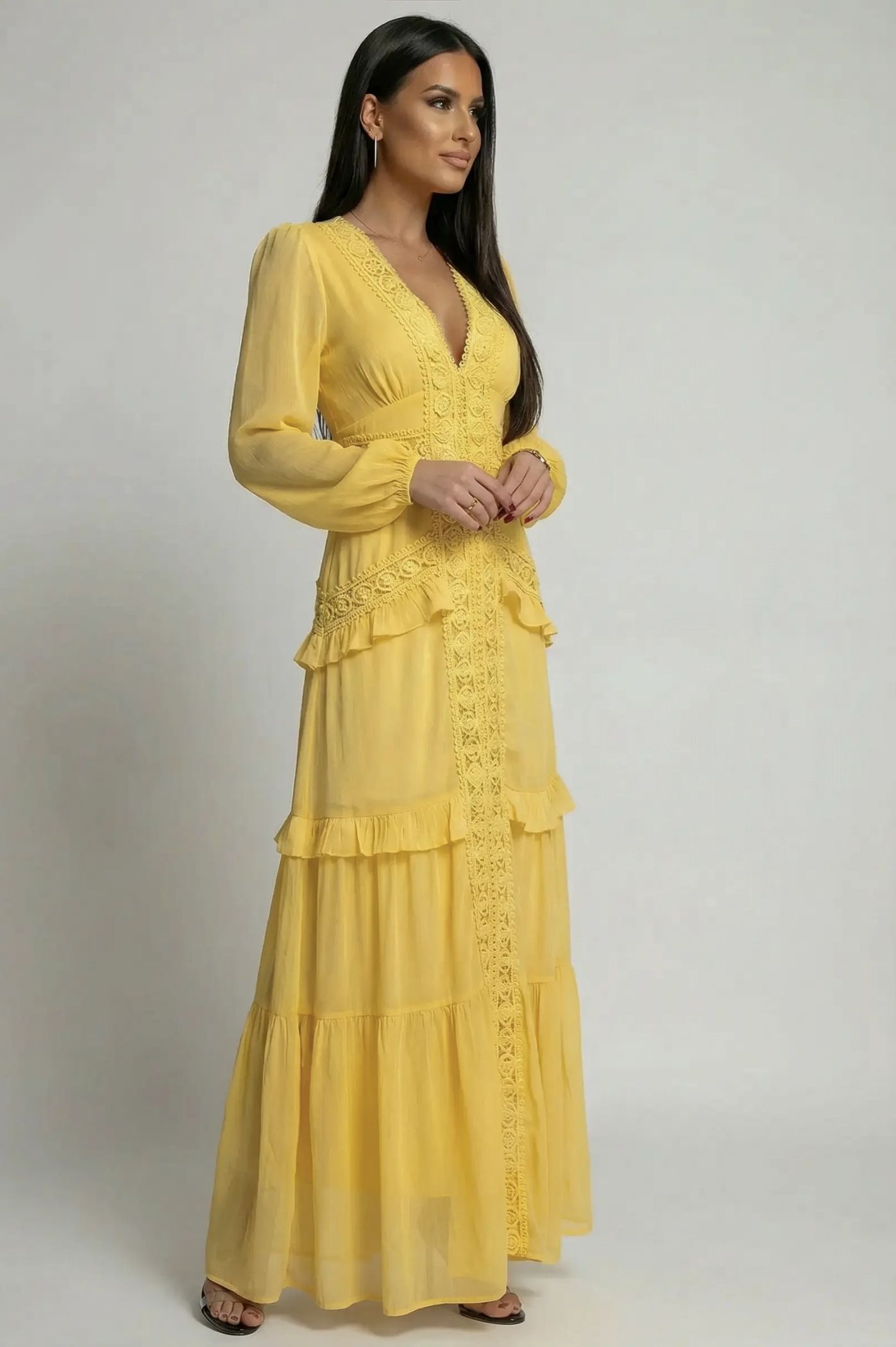 Αναδείξτε τη θηλυκότητά σας με αυτό το εντυπωσιακό μάξι φόρεμα, ιδανικό για κοινωνικές εκδηλώσεις, βαπτίσεις ή καλοκαιρινές βραδινές εξόδους. Σχεδιασμένο με έμφαση στη λεπτομέρεια, συνδυάζει την αέρινη αίσθηση του σιφόν με ρομαντικά boho στοιχεία. Διακοσμημένο με περίτεχνο κέντημα που πλαισιώνει το στήθος και συνεχίζει κάθετα, επιμηκύνοντας τη σιλουέτα. Διαθέτει διακριτικά βολάν στη μέση και στο κάτω μέρος της φούστας, προσθέτοντας κίνηση και όγκο στο πέρασμά σας. Τα ελαφριά μανίκια με λάστιχο στους καρπούς προσφέρουν μια chic και ταυτόχρονα ανάλαφρη κάλυψη. Η εφαρμοστή μέση και η χυτή φούστα κολακεύουν κάθε σωματότυπο, προσφέροντας άνεση και στυλ.