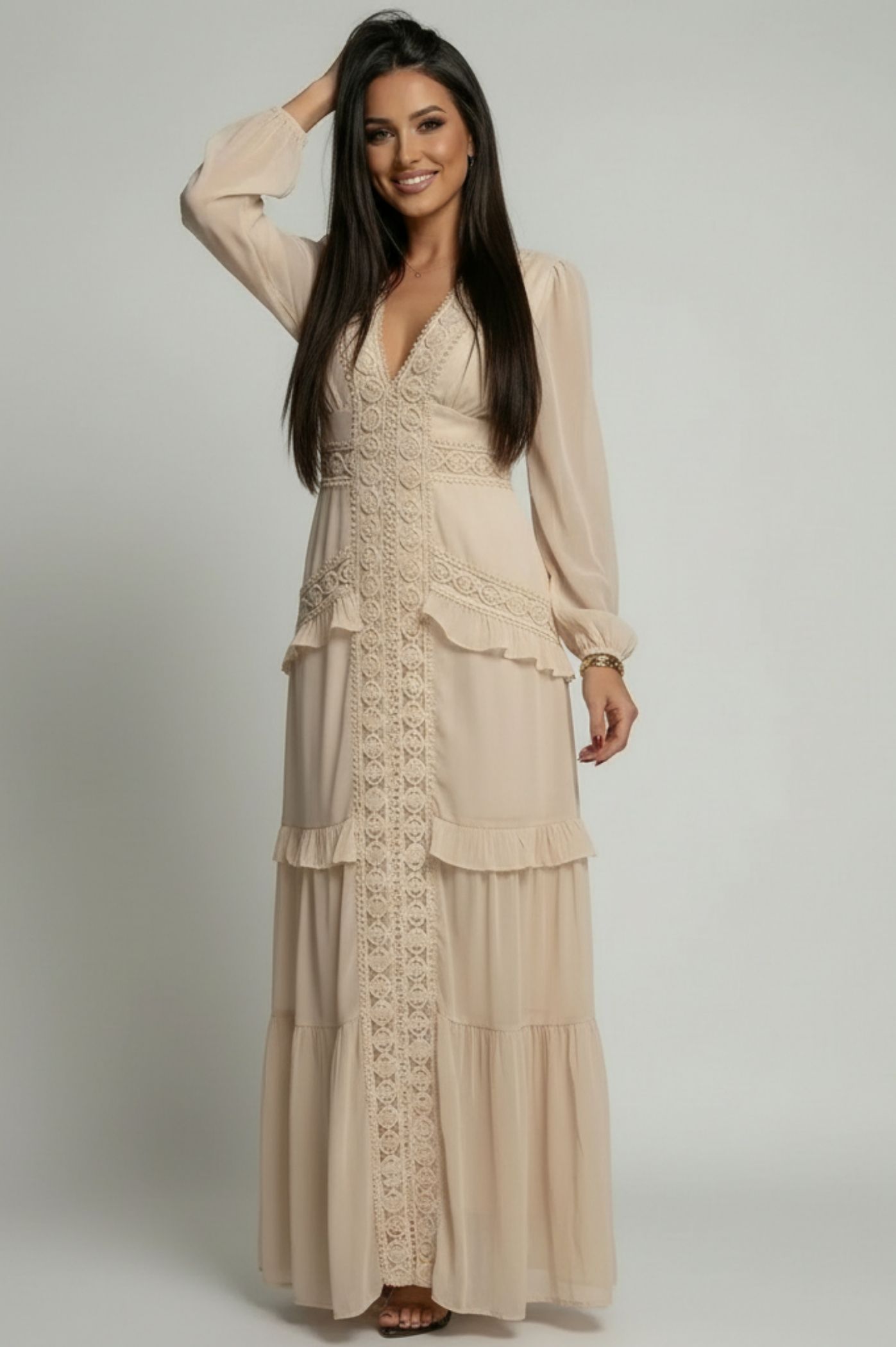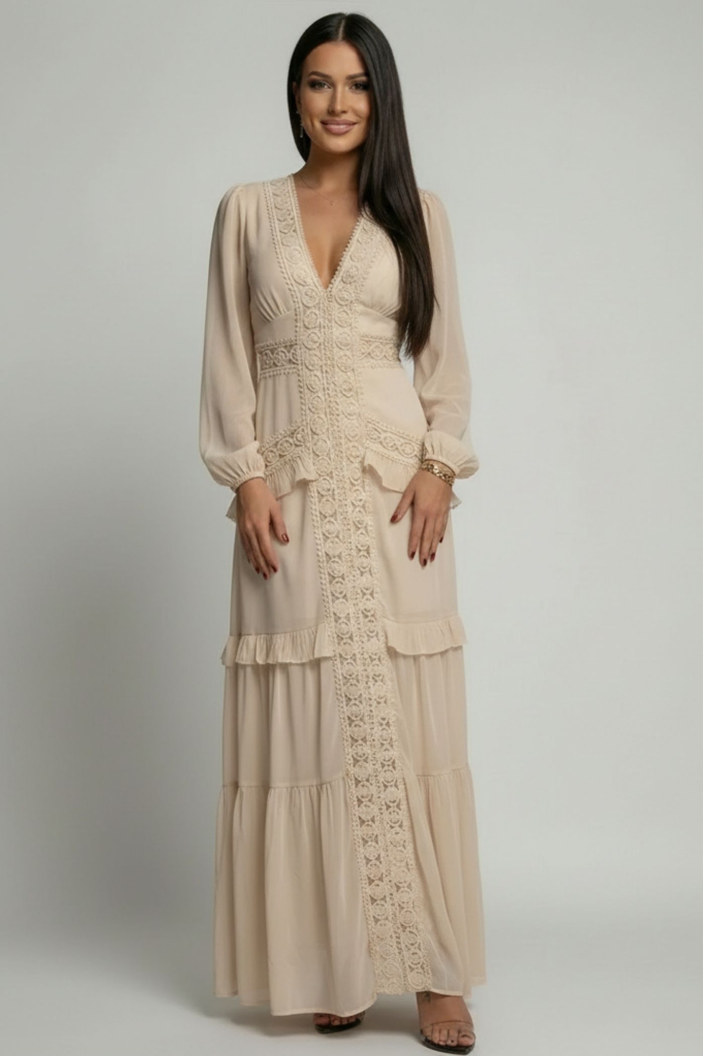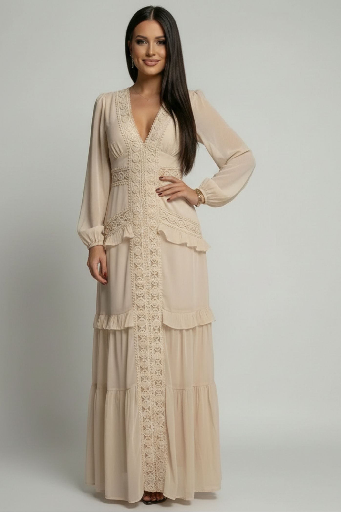 Αναδείξτε τη θηλυκότητά σας με αυτό το εντυπωσιακό μάξι φόρεμα, ιδανικό για κοινωνικές εκδηλώσεις, βαπτίσεις ή καλοκαιρινές βραδινές εξόδους. Σχεδιασμένο με έμφαση στη λεπτομέρεια, συνδυάζει την αέρινη αίσθηση του σιφόν με ρομαντικά boho στοιχεία. Διακοσμημένο με περίτεχνο κέντημα που πλαισιώνει το στήθος και συνεχίζει κάθετα, επιμηκύνοντας τη σιλουέτα. Διαθέτει διακριτικά βολάν στη μέση και στο κάτω μέρος της φούστας, προσθέτοντας κίνηση και όγκο στο πέρασμά σας. Τα ελαφριά μανίκια με λάστιχο στους καρπούς προσφέρουν μια chic και ταυτόχρονα ανάλαφρη κάλυψη. Η εφαρμοστή μέση και η χυτή φούστα κολακεύουν κάθε σωματότυπο, προσφέροντας άνεση και στυλ.