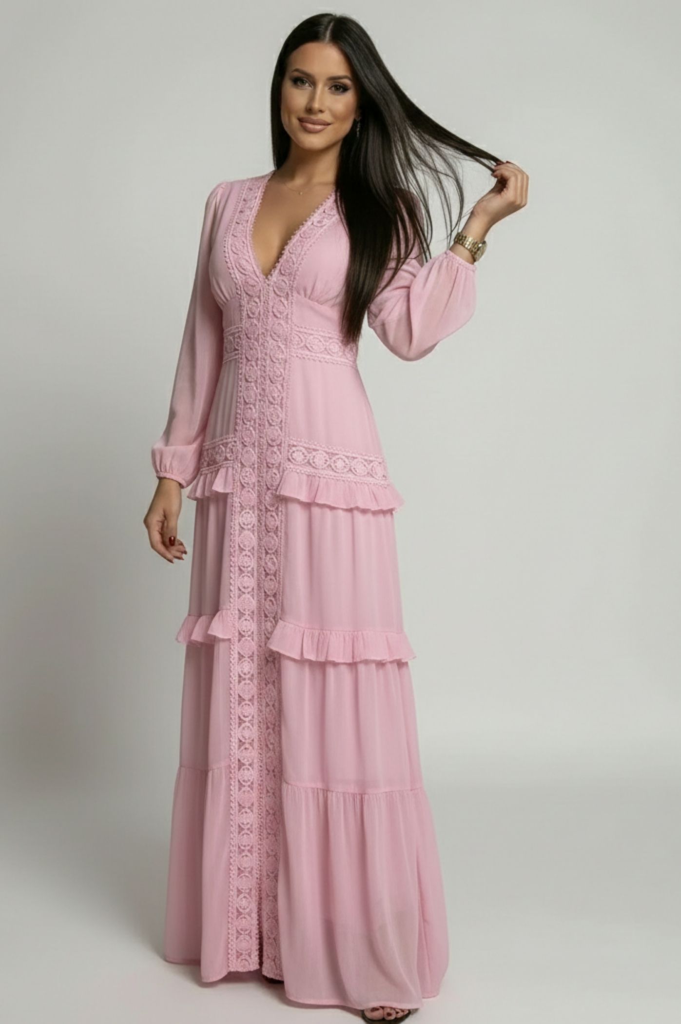 Αναδείξτε τη θηλυκότητά σας με αυτό το εντυπωσιακό μάξι φόρεμα, ιδανικό για κοινωνικές εκδηλώσεις, βαπτίσεις ή καλοκαιρινές βραδινές εξόδους. Σχεδιασμένο με έμφαση στη λεπτομέρεια, συνδυάζει την αέρινη αίσθηση του σιφόν με ρομαντικά boho στοιχεία. Διακοσμημένο με περίτεχνο κέντημα που πλαισιώνει το στήθος και συνεχίζει κάθετα, επιμηκύνοντας τη σιλουέτα. Διαθέτει διακριτικά βολάν στη μέση και στο κάτω μέρος της φούστας, προσθέτοντας κίνηση και όγκο στο πέρασμά σας. Τα ελαφριά μανίκια με λάστιχο στους καρπούς προσφέρουν μια chic και ταυτόχρονα ανάλαφρη κάλυψη. Η εφαρμοστή μέση και η χυτή φούστα κολακεύουν κάθε σωματότυπο, προσφέροντας άνεση και στυλ.