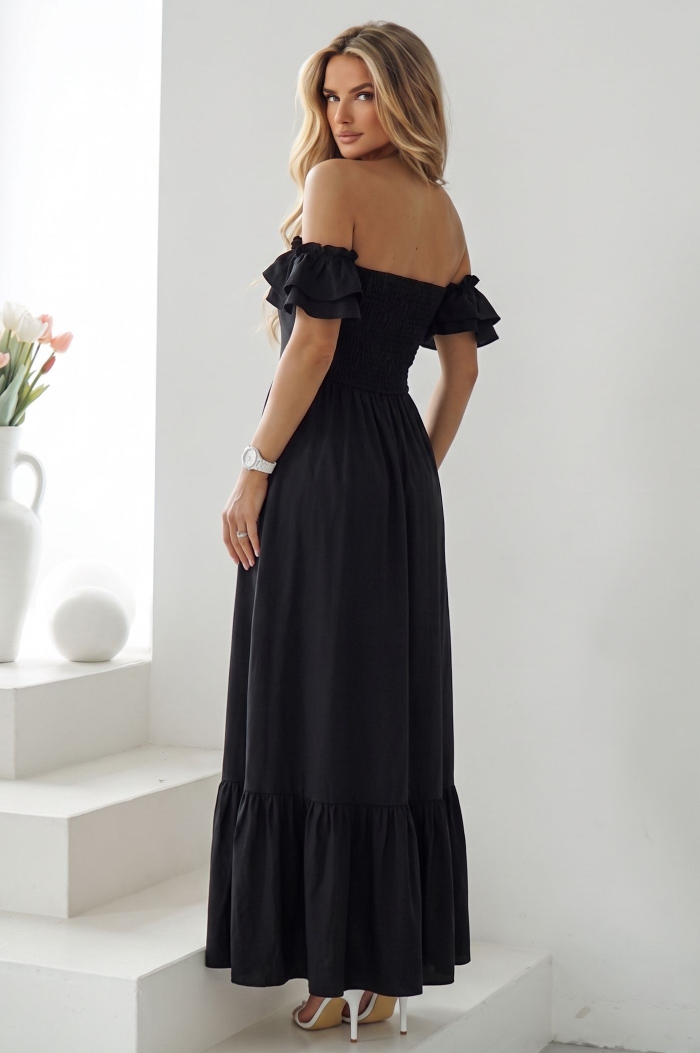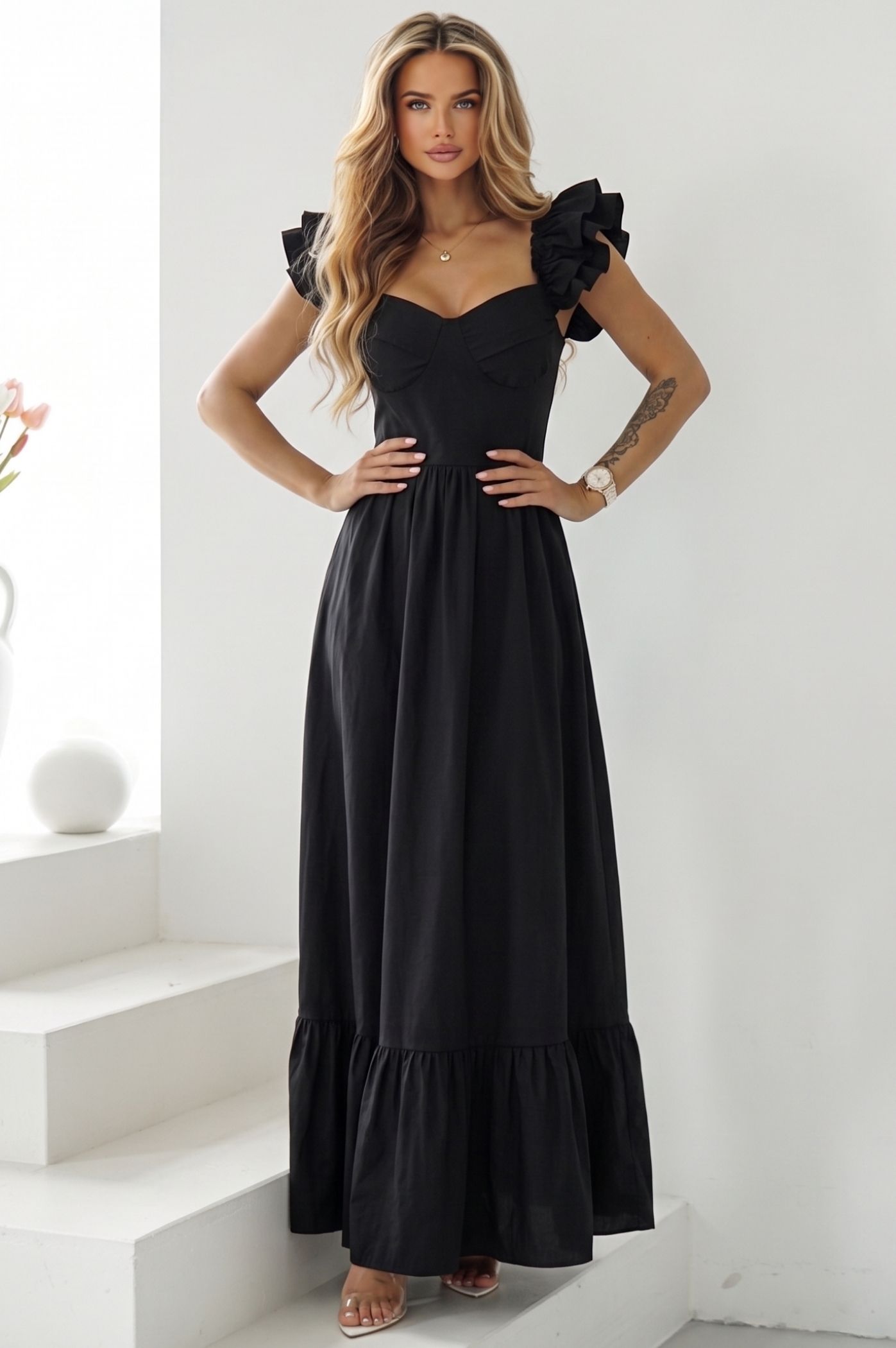 Κλέψτε την παράσταση με αυτό το μοναδικό maxi φόρεμα. Ένα statement κομμάτι που συνδυάζει τον ρομαντισμό με τη δυναμική εμφάνιση, ιδανικό για να ξεχωρίσετε σε κάθε επίσημη ή κοινωνική σας εμφάνιση. Τα διακριτικά βολάν στους ώμους προσθέτουν μια θηλυκή και παιχνιδιάρικη διάθεση, ενώ το βολάν στο τελείωμα χαρίζει κίνηση και χάρη στη σιλουέτα. Το μπούστο σε στυλ κορσέ αγκαλιάζει και αναδεικνύει το στήθος, προσφέροντας μια κομψή και σταθερή εφαρμογή. Η maxi γραμμή του εξασφαλίζει άνεση, καθιστώντας το ιδανικό για γάμους, βαπτίσεις ή καλοκαιρινά events.