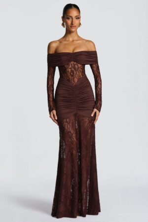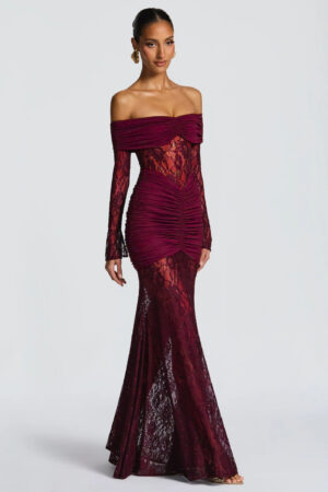 Ένα αποκλειστικό επίσημο φόρεμα! Αυτό το μάξι φόρεμα συνδυάζει θηλυκή δαντέλα και διαφάνεια. Το μπούστο διαθέτει off shoulder γραμμή με σούρες, ενώ ο κορμός είναι από δαντέλα και ριμπ ύφασμα. Η φούστα είναι από δαντέλα και διαφάνεια στο κάτω μέρος, προσδίδοντας έναν αέρα μυστηρίου και ρομαντικής κομψότητας. Ιδανικό για γάμους, δεξιώσεις και επίσημες περιστάσεις.