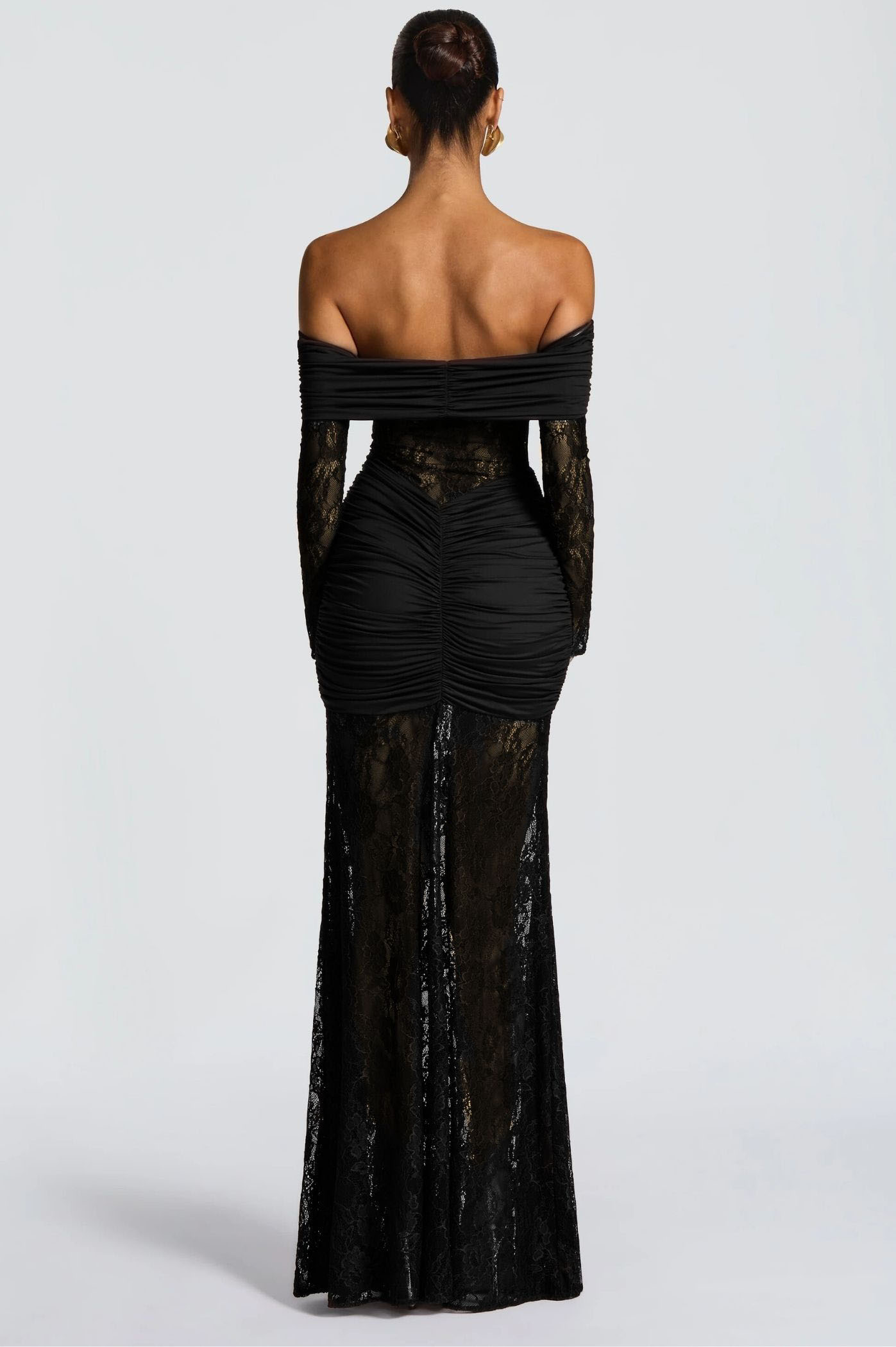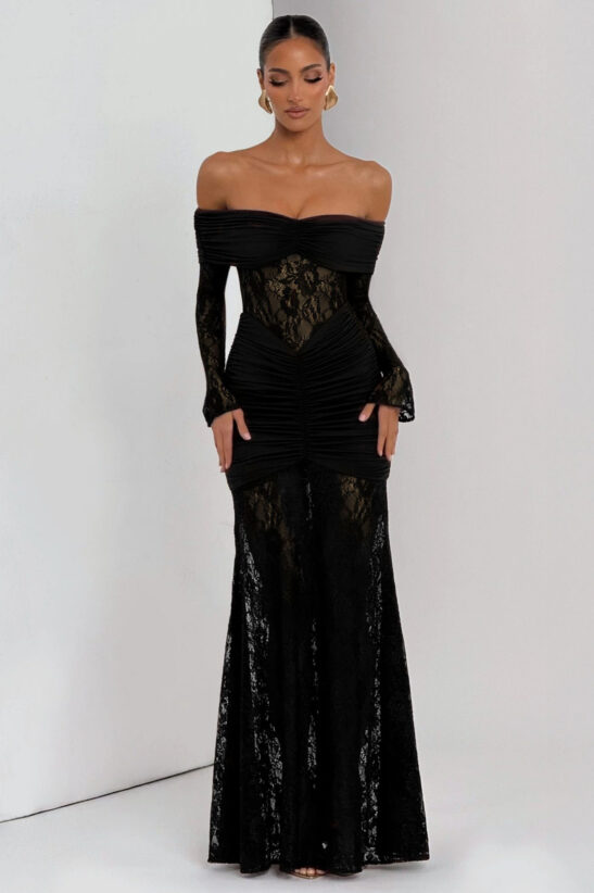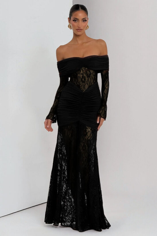 ΦΟΡΕΜΑ MAXI OFF SHOULDER ΜΕ ΔΑΝΤΕΛΑ ΔΙΑΦΑΝΕΙΑ – ΜΑΥΡΟ