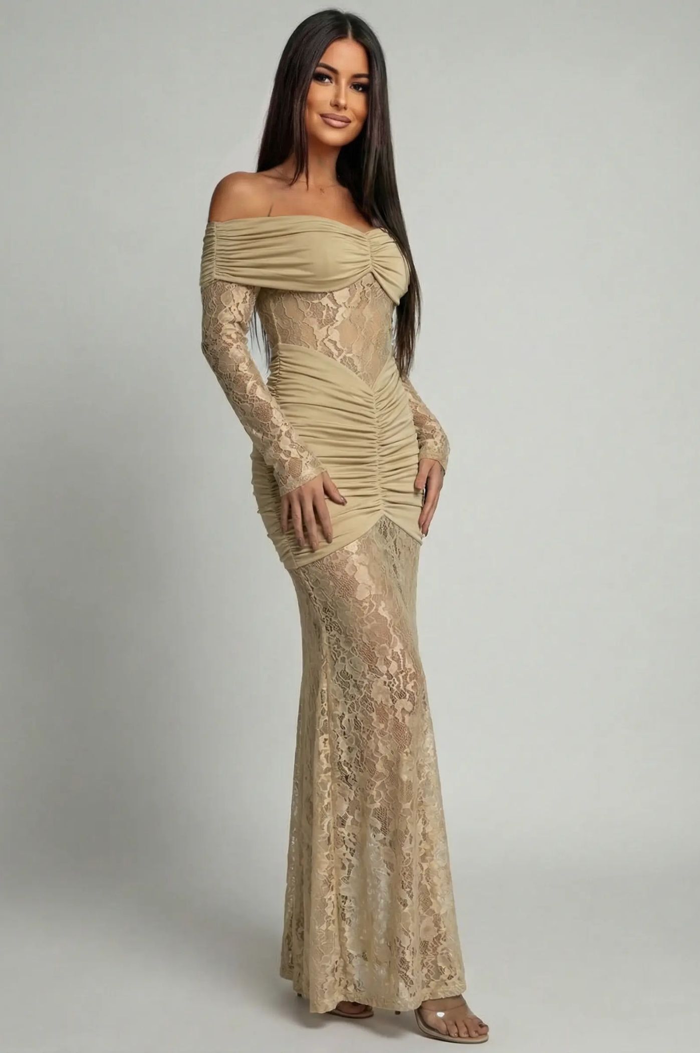 ΦΟΡΕΜΑ MAXI OFF SHOULDER ΜΕ ΔΑΝΤΕΛΑ ΔΙΑΦΑΝΕΙΑ – ΜΠΕΖ