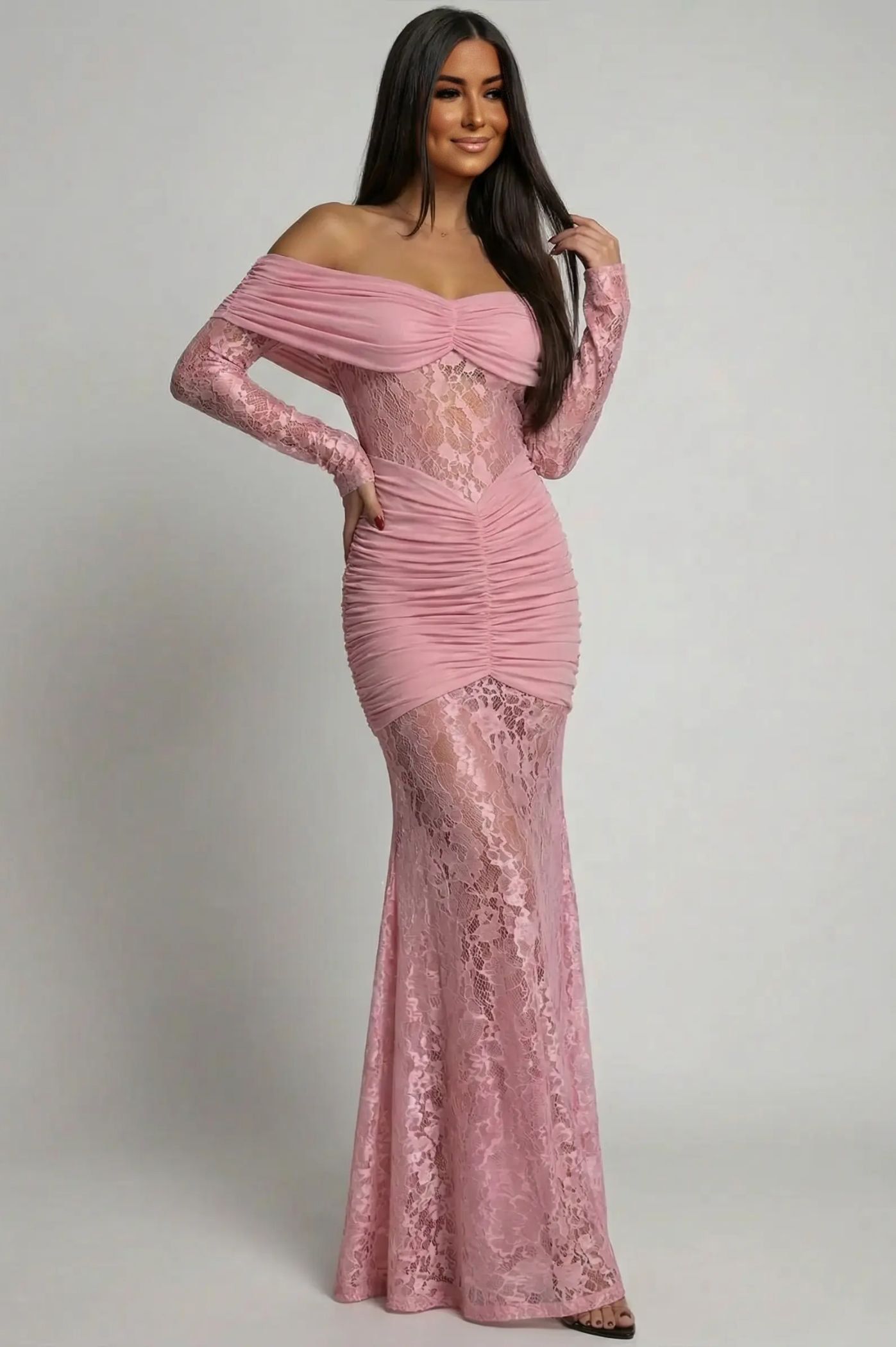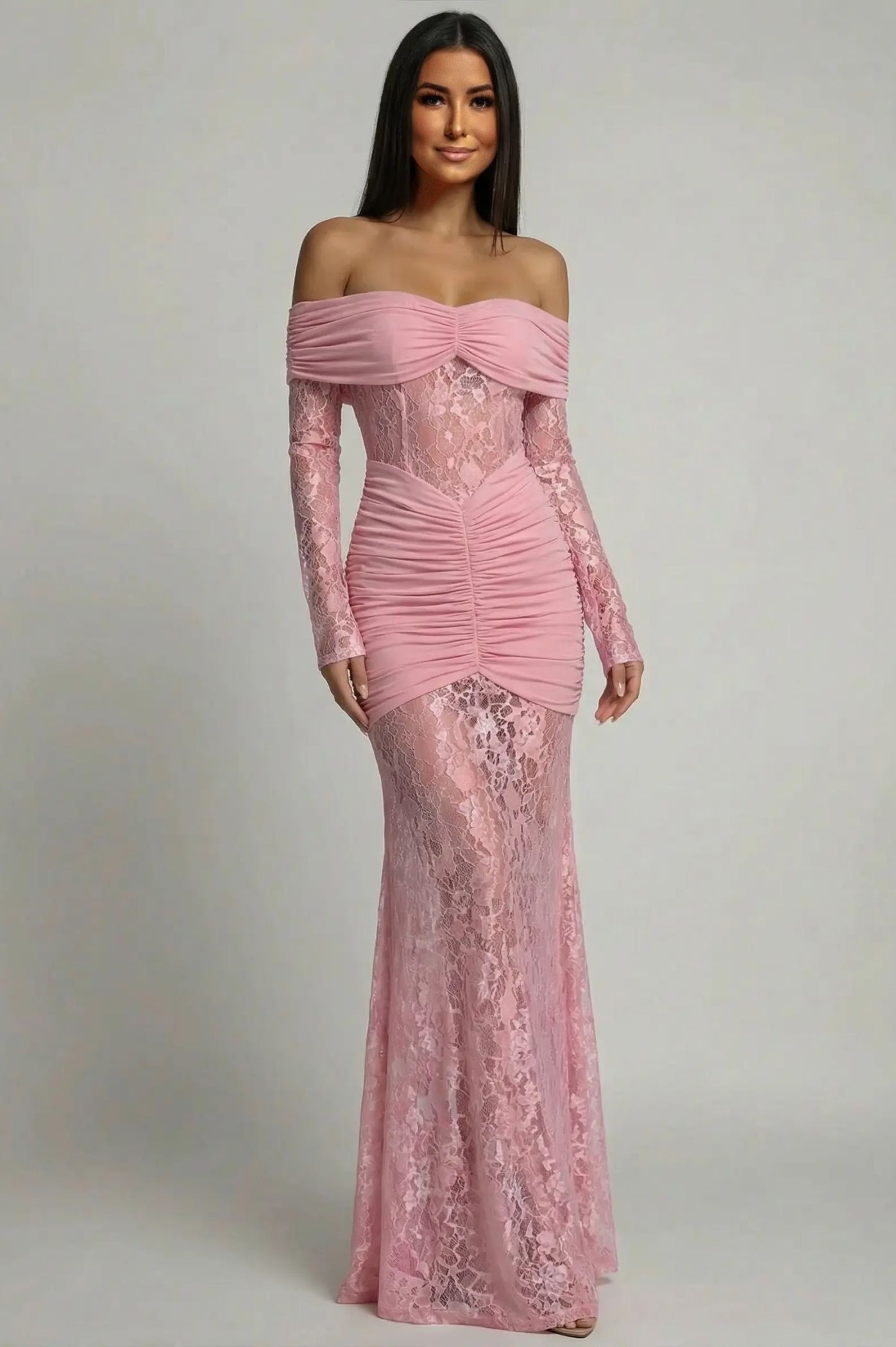 ΦΟΡΕΜΑ MAXI OFF SHOULDER ΜΕ ΔΑΝΤΕΛΑ ΔΙΑΦΑΝΕΙΑ – ΡΟΖ