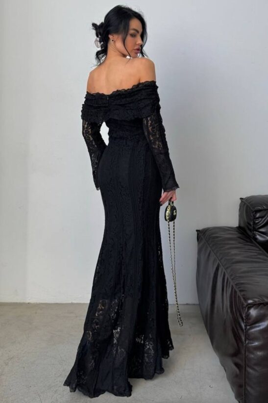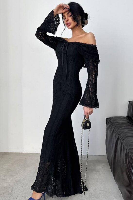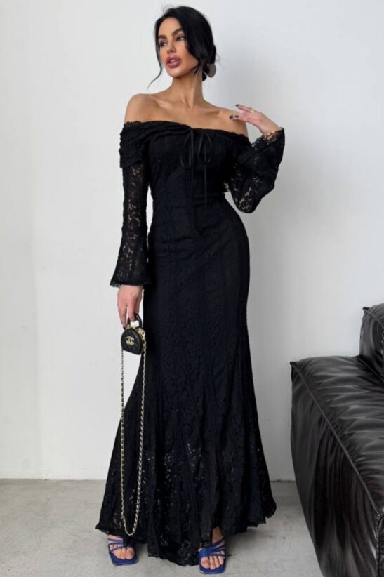 ΦΟΡΕΜΑ MAXI OFF SHOULDER ΜΕ ΔΑΝΤΕΛΑ ΚΑΙ ΚΑΜΠΑΝΑ ΜΑΝΙΚΙΑ – ΜΑΥΡΟ