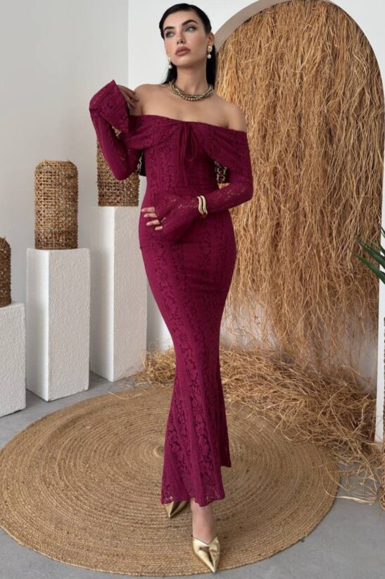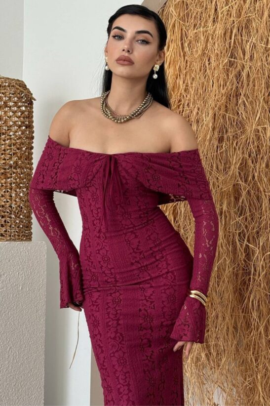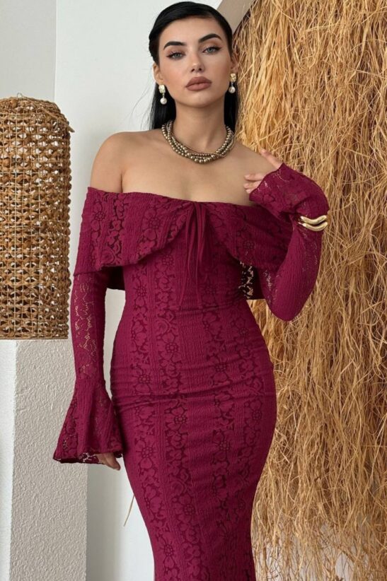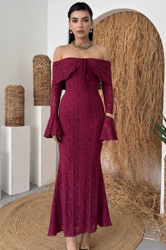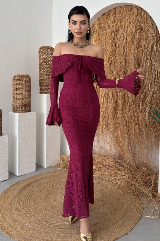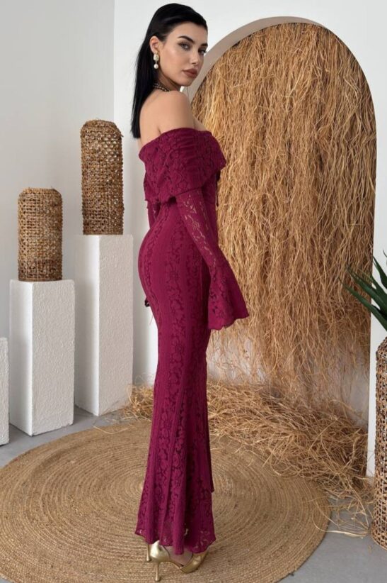 ΦΟΡΕΜΑ MAXI OFF SHOULDER ΜΕ ΔΑΝΤΕΛΑ ΚΑΙ ΚΑΜΠΑΝΑ ΜΑΝΙΚΙΑ – ΜΠΟΡΝΤΟ