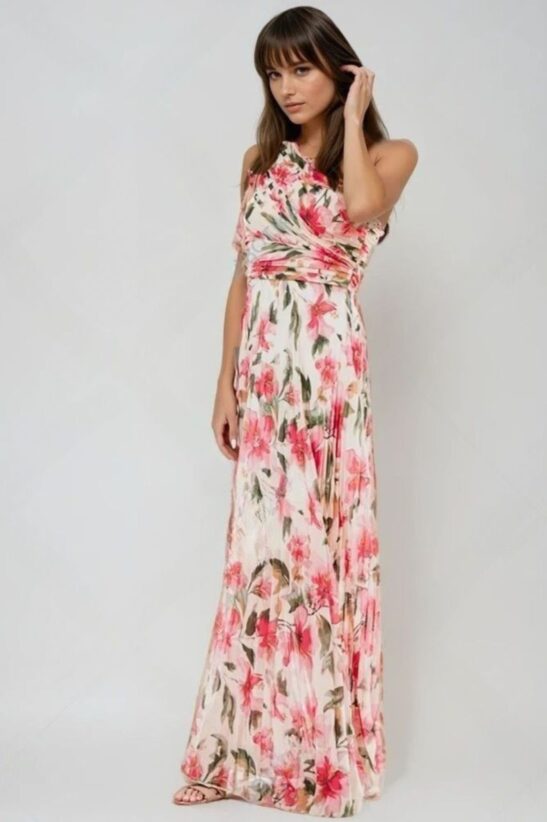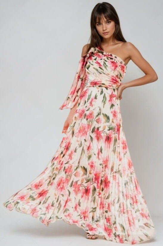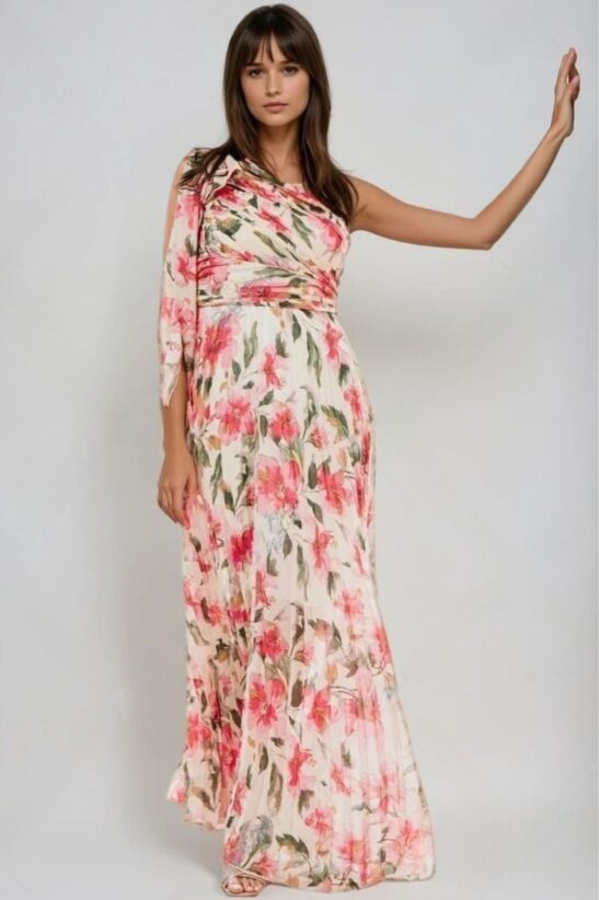 ΦΟΡΕΜΑ MAXI ΠΛΙΣΕ FLORAL ΜΕ ΕΝΑΝ ΩΜΟ – ΡΟΖ