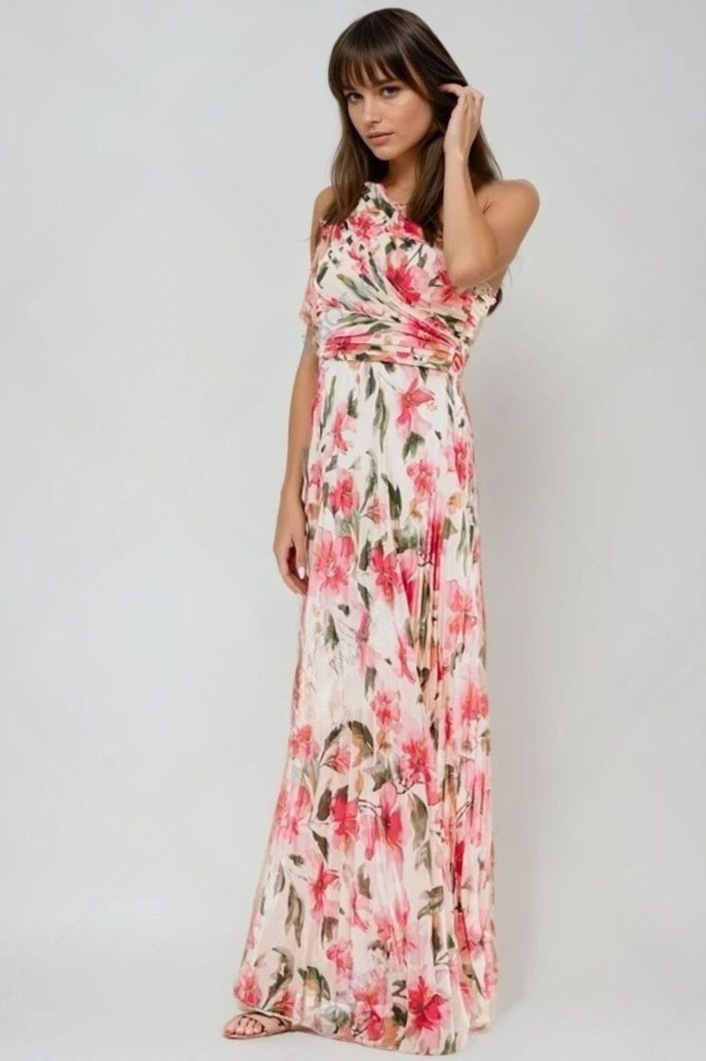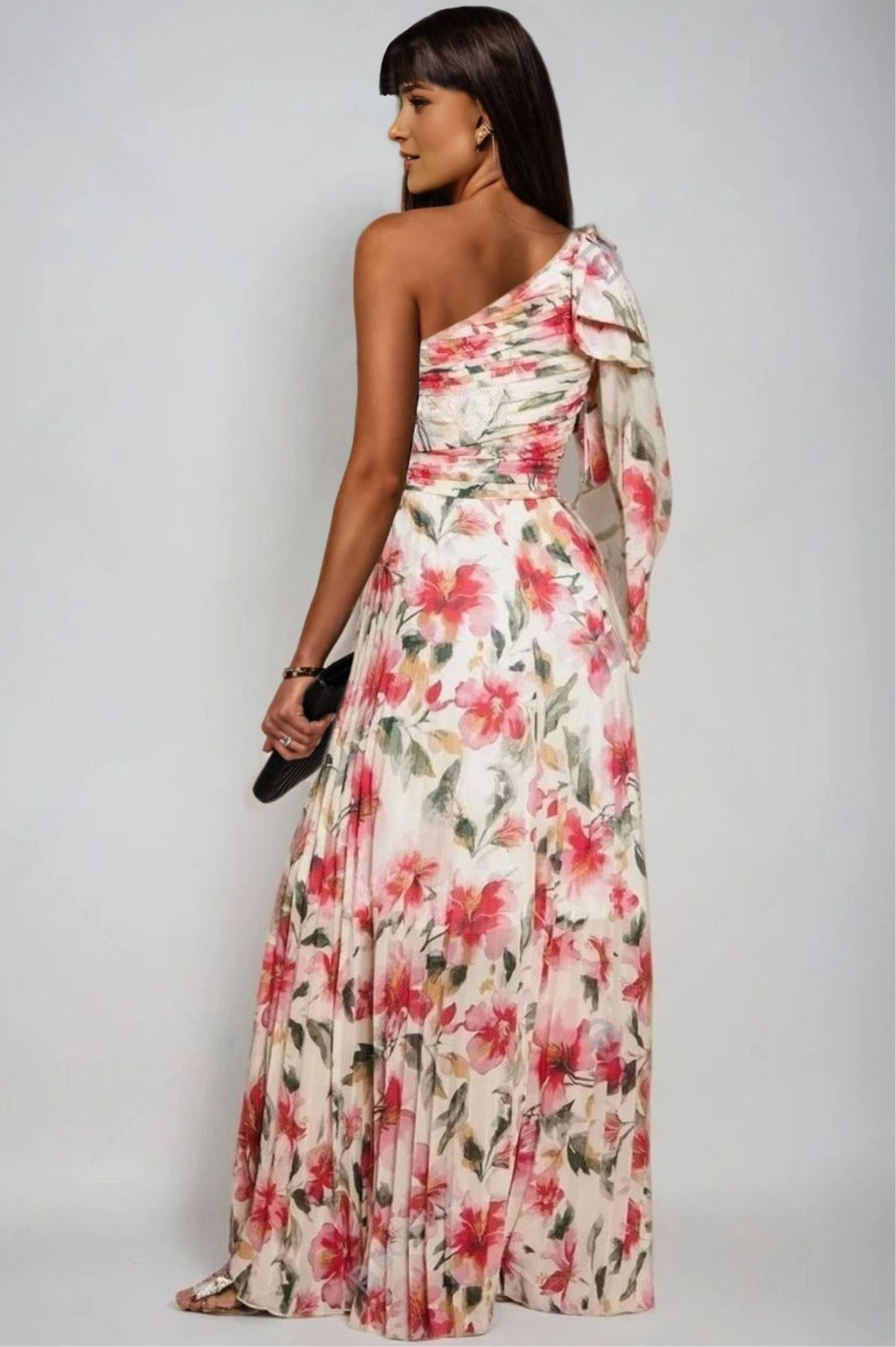 Φόρεμα maxi πλισέ floral , με έναν ώμο και πιέτες. Διαθέτει μεσοφόρι.