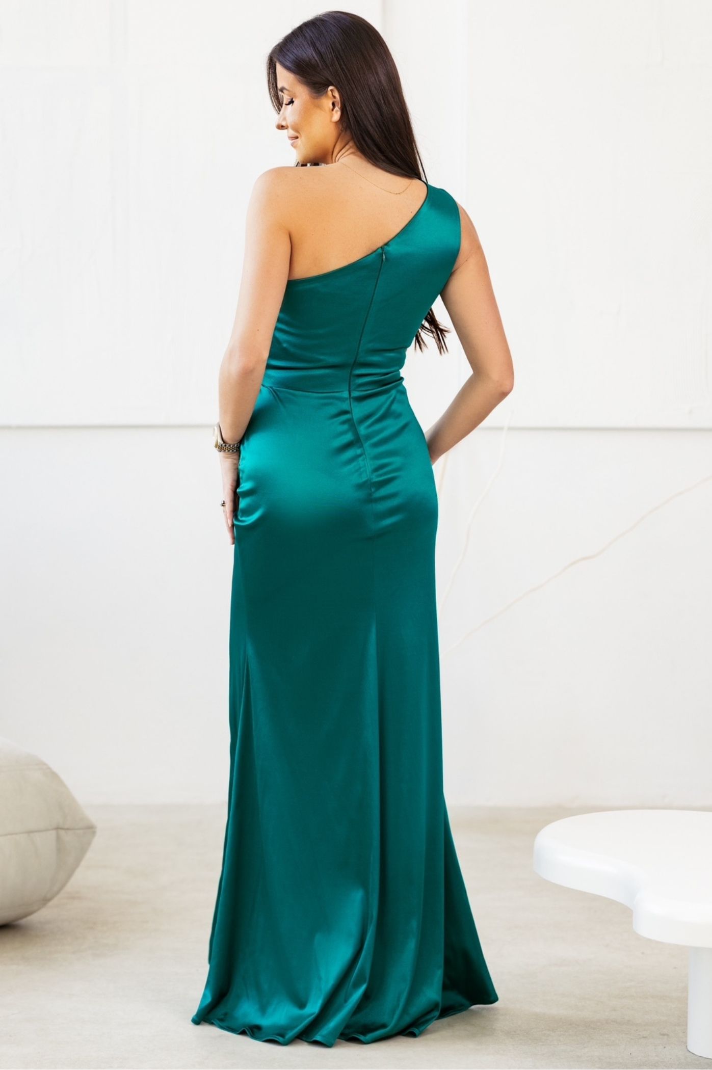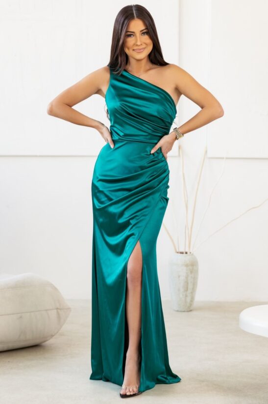 Φόρεμα maxi σατέν με έναν ώμο και σκίσιμο στο πόδι. Διαθέτει κλείσιμο με φερμουάρ στην πλάτη, σούρα στο πλάι και σκίσιμο στο πόδι.