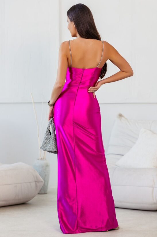 Φόρεμα maxi σατέν με τιράντες από strass και σκίσιμο στο πόδι. Διαθέτει κλείσιμο με φερμουάρ στην πλάτη και εσωτερικά cups.