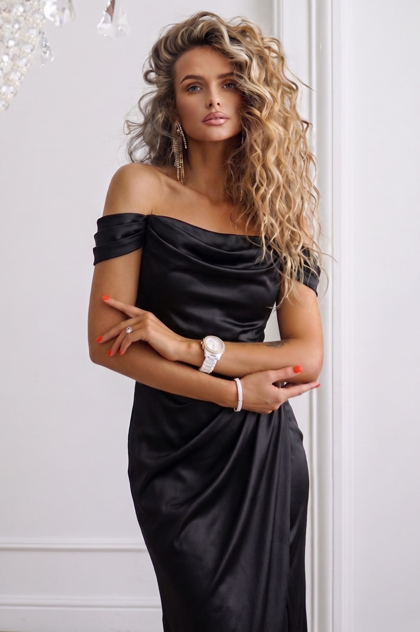 ΦΟΡΕΜΑ MAXI ΣΑΤΕΝ OFF SHOULDER ΜΕ ΧΙΑΣΤΗ ΠΛΑΤΗ – ΜΑΥΡΟ