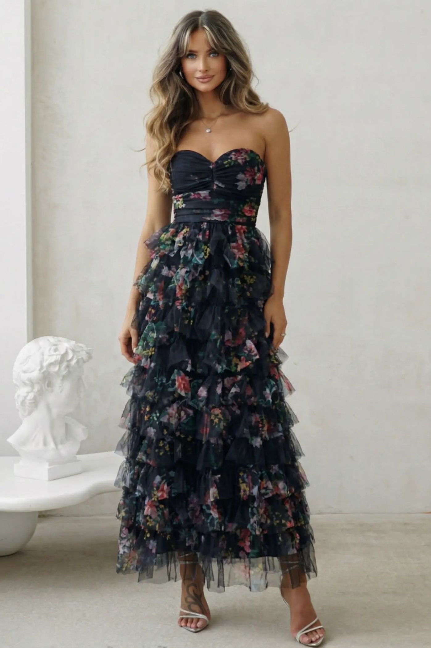 Κλέψτε τις εντυπώσεις με το strapless floral maxi φόρεμα, ένα κομμάτι που επαναφέρει τον απόλυτο ρομαντισμό στη σύγχρονη μόδα. Σχεδιασμένο για να προσφέρει μια παραμυθένια αίσθηση, αυτό το φόρεμα είναι η επιτομή της κομψότητας και της θηλυκότητας. Διαθέτει σταθερό μπούστο σε σχήμα καρδιάς με διακριτικές σούρες που αναδεικνύουν το ντεκολτέ και τους ώμους. Η φούστα αποτελείται από αλλεπάλληλα επίπεδα βολάν από ανάλαφρο τούλι, χαρίζοντας όγκο, κίνηση και μια αίσθηση πολυτέλειας. Στενή εφαρμογή στον κορμό που καταλήγει σε μια πλούσια, αέρινη maxi φούστα, δημιουργώντας μια άκρως κολακευτική σιλουέτα.