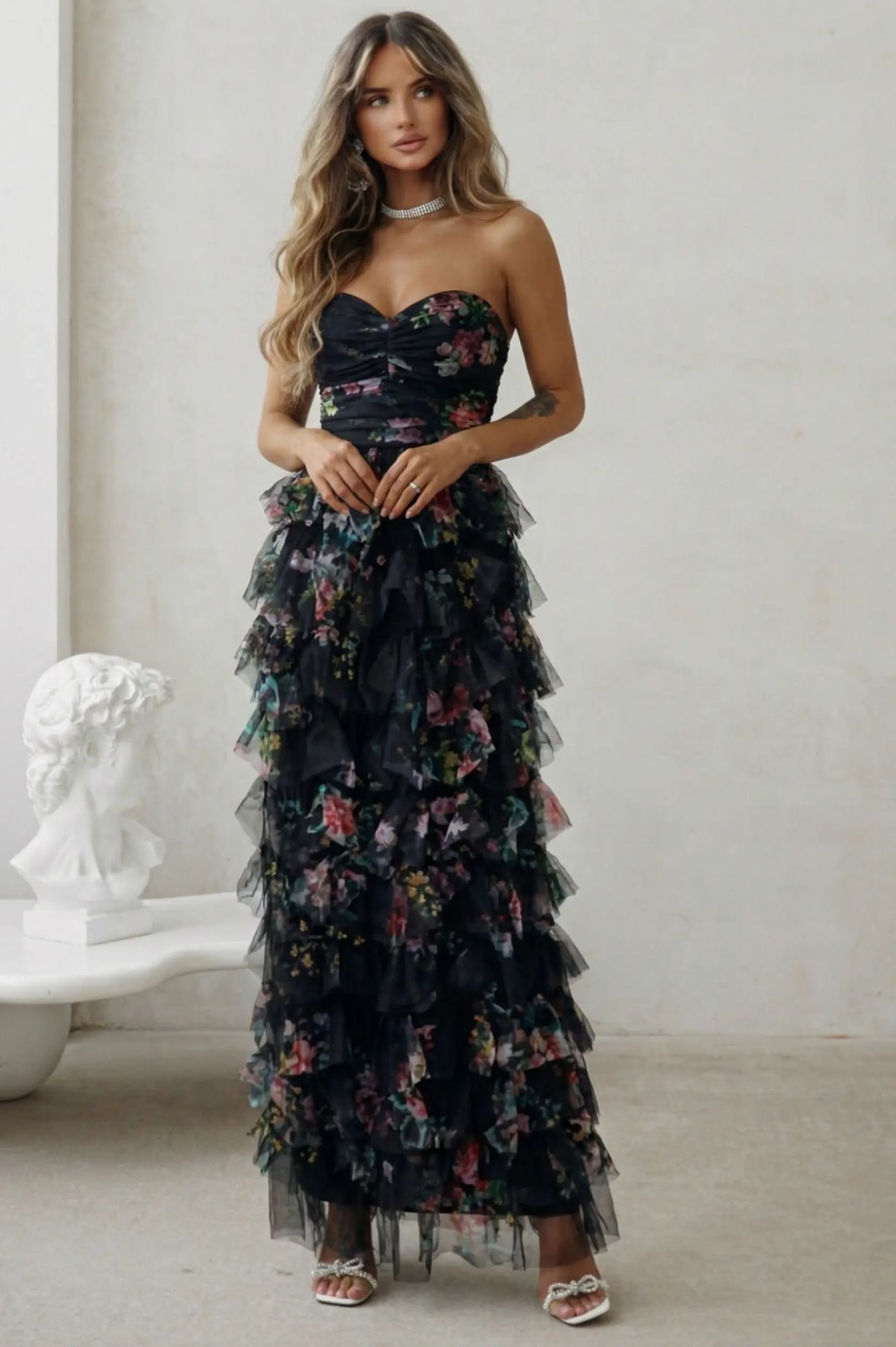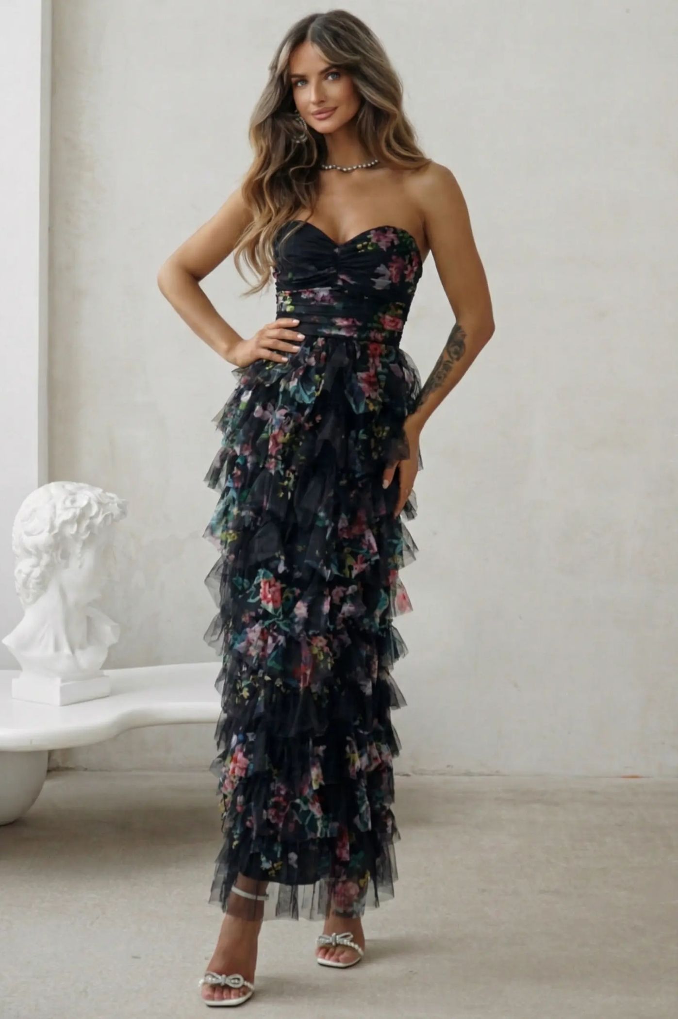ΦΟΡΕΜΑ MAXI STRAPLESS ΜΕ ΒΟΛΑΝ FLORAL – ΜΑΥΡΟ