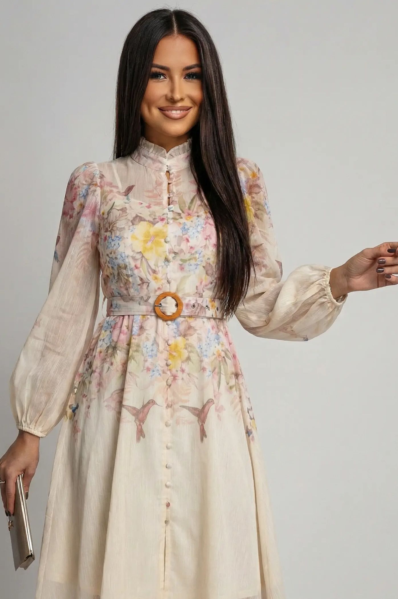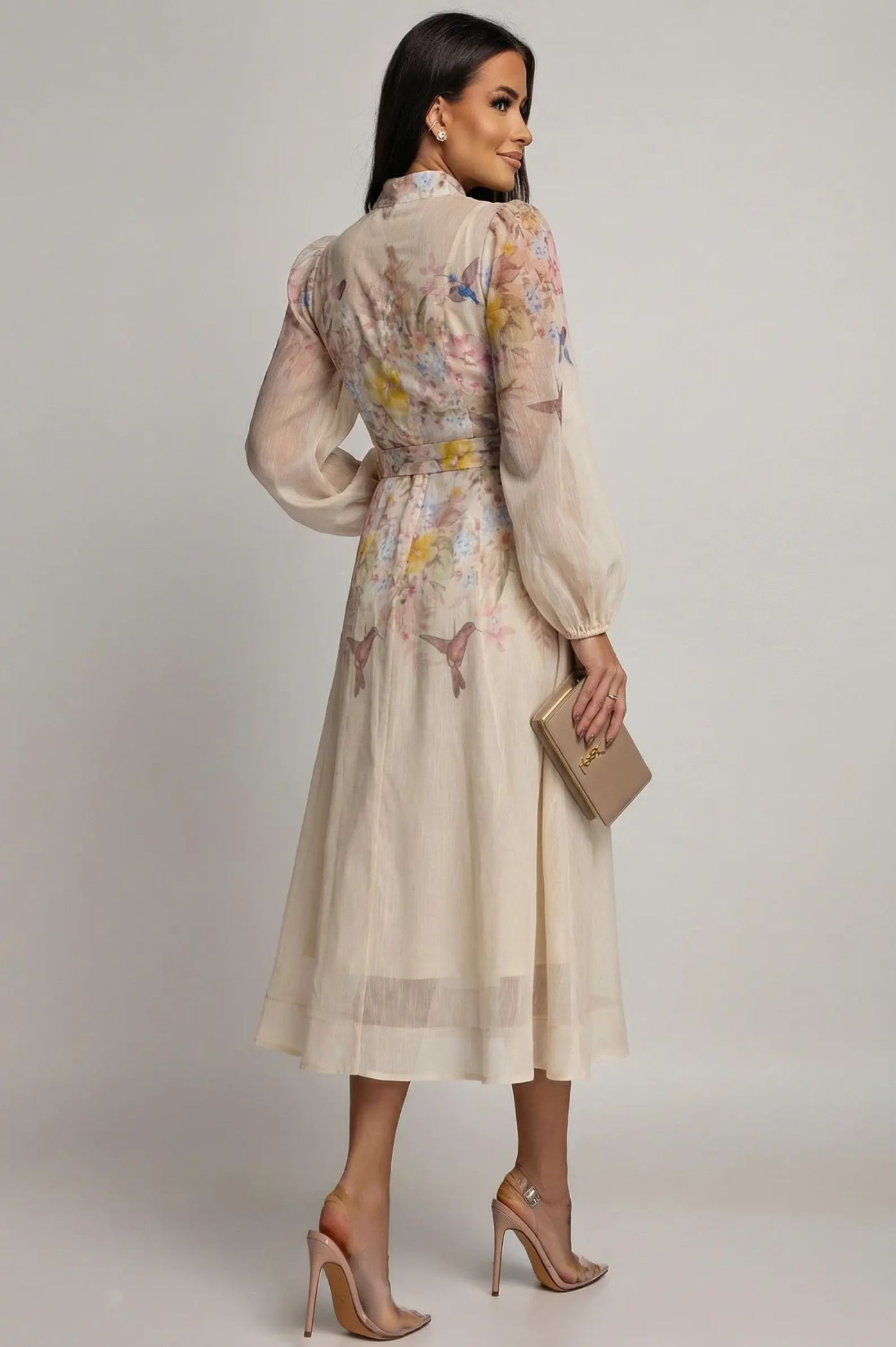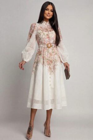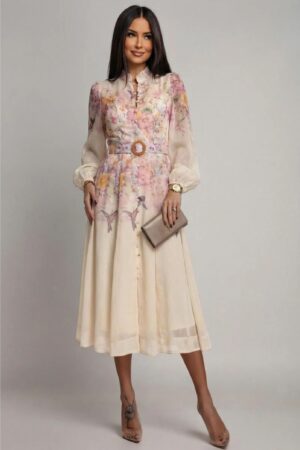 Αναδείξτε τη θηλυκότητά σας με αυτό το εντυπωσιακό midi φόρεμα, ιδανικό για επίσημες εμφανίσεις, βαπτίσεις ή ανοιξιάτικες εξόδους. Σχεδιασμένο με γνώμονα την κομψότητα και την άνεση, το συγκεκριμένο κομμάτι συνδυάζει το ρομαντικό στυλ με μοντέρνες λεπτομέρειες. Διαθέτει ζώνη με μεταλλική αγκράφα που τονίζει τη μέση, δημιουργώντας μια άψογη γραμμή. Ψηλός γιακάς (mao collar) για classy εμφάνιση. Κλείσιμο με κουμπιά στο μπροστινό μέρος. Μακριά, ημιδιάφανα μανίκια με ελαφρύ όγκο (balloon style) που καταλήγουν σε κομψές μανσέτες. Ελαφρύ, αέρινο ύφασμα με διακριτική υφή που προσφέρει κίνηση και χάρη σε κάθε σας βήμα.