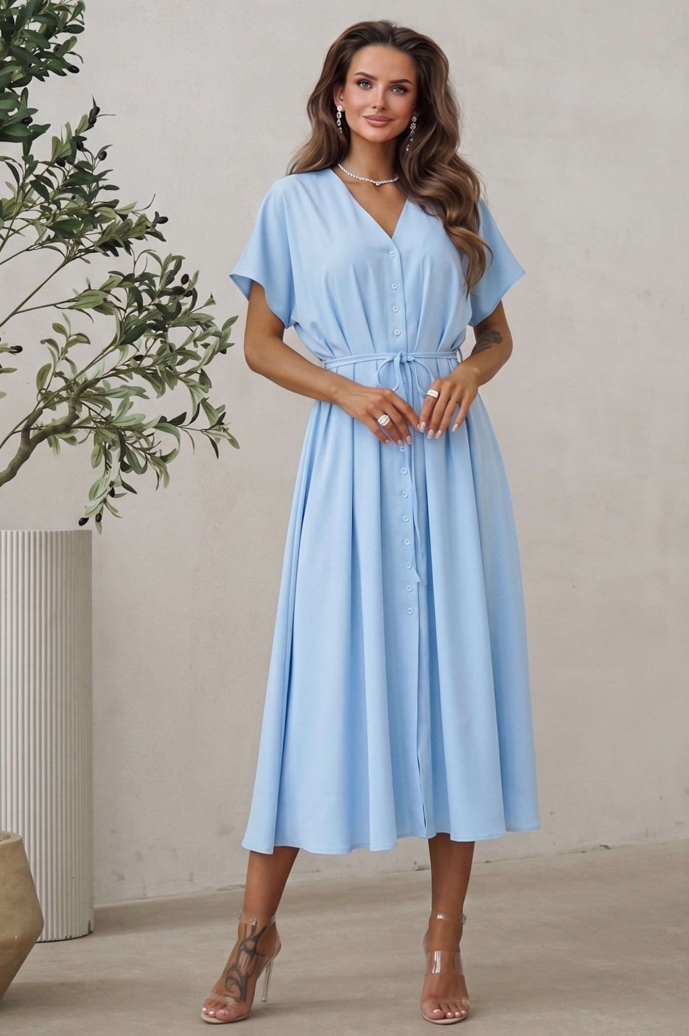 Αναζητάτε την απόλυτη ισορροπία μεταξύ άνεσης και στυλ; Αυτό το αέρινο midi φόρεμα σε υπέροχο χρώμα είναι η ιδανική επιλογή για τις καθημερινές σας εμφανίσεις αλλά και για πιο ειδικές περιστάσεις. Με σχεδιασμό που αποπνέει φρεσκάδα και κομψότητα, θα γίνει το αγαπημένο κομμάτι της γκαρνταρόμπας σας. Το ύφασμά του προσφέρει μια ανάλαφρη αίσθηση και εντυπωσιακή κίνηση, κολακεύοντας κάθε τύπο σιλουέτας. Το σχέδιο με τα κουμπιά κατά μήκος και τον γιακά προσδίδει μια διαχρονική, chic εμφάνιση που δεν φεύγει ποτέ από τη μόδα. Η ενσωματωμένη ζώνη σάς επιτρέπει να προσαρμόσετε την εφαρμογή στη μέση σας, δημιουργώντας μια όμορφη θηλυκή σιλουέτα.