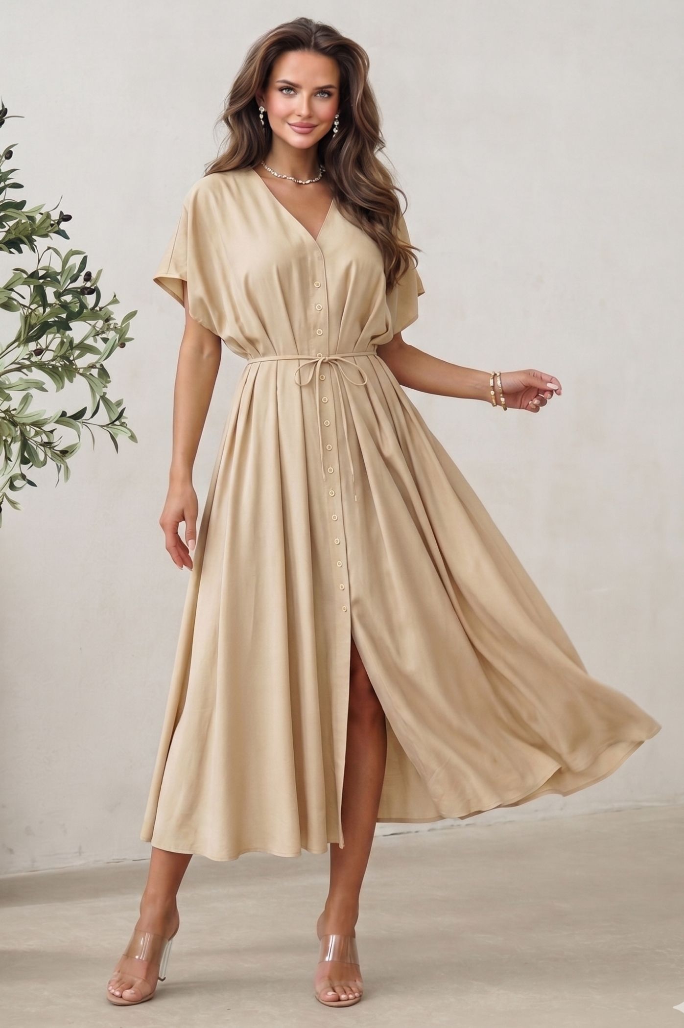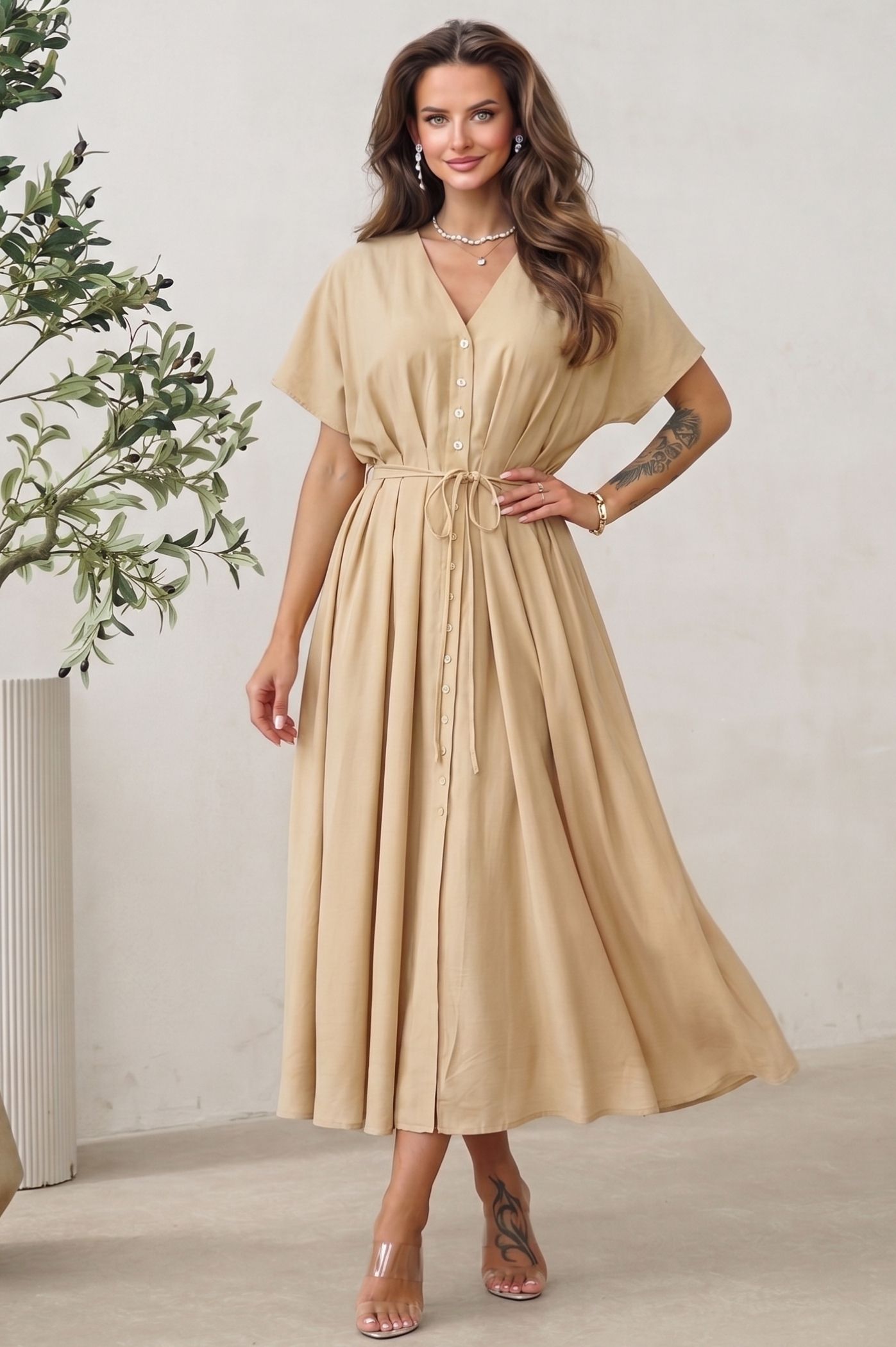 Αναζητάτε την απόλυτη ισορροπία μεταξύ άνεσης και στυλ; Αυτό το αέρινο midi φόρεμα σε υπέροχο χρώμα είναι η ιδανική επιλογή για τις καθημερινές σας εμφανίσεις αλλά και για πιο ειδικές περιστάσεις. Με σχεδιασμό που αποπνέει φρεσκάδα και κομψότητα, θα γίνει το αγαπημένο κομμάτι της γκαρνταρόμπας σας. Το ύφασμά του προσφέρει μια ανάλαφρη αίσθηση και εντυπωσιακή κίνηση, κολακεύοντας κάθε τύπο σιλουέτας. Το σχέδιο με τα κουμπιά κατά μήκος και τον γιακά προσδίδει μια διαχρονική, chic εμφάνιση που δεν φεύγει ποτέ από τη μόδα. Η ενσωματωμένη ζώνη σάς επιτρέπει να προσαρμόσετε την εφαρμογή στη μέση σας, δημιουργώντας μια όμορφη θηλυκή σιλουέτα.