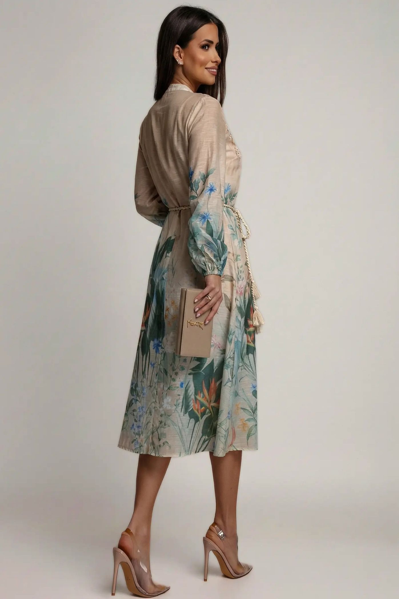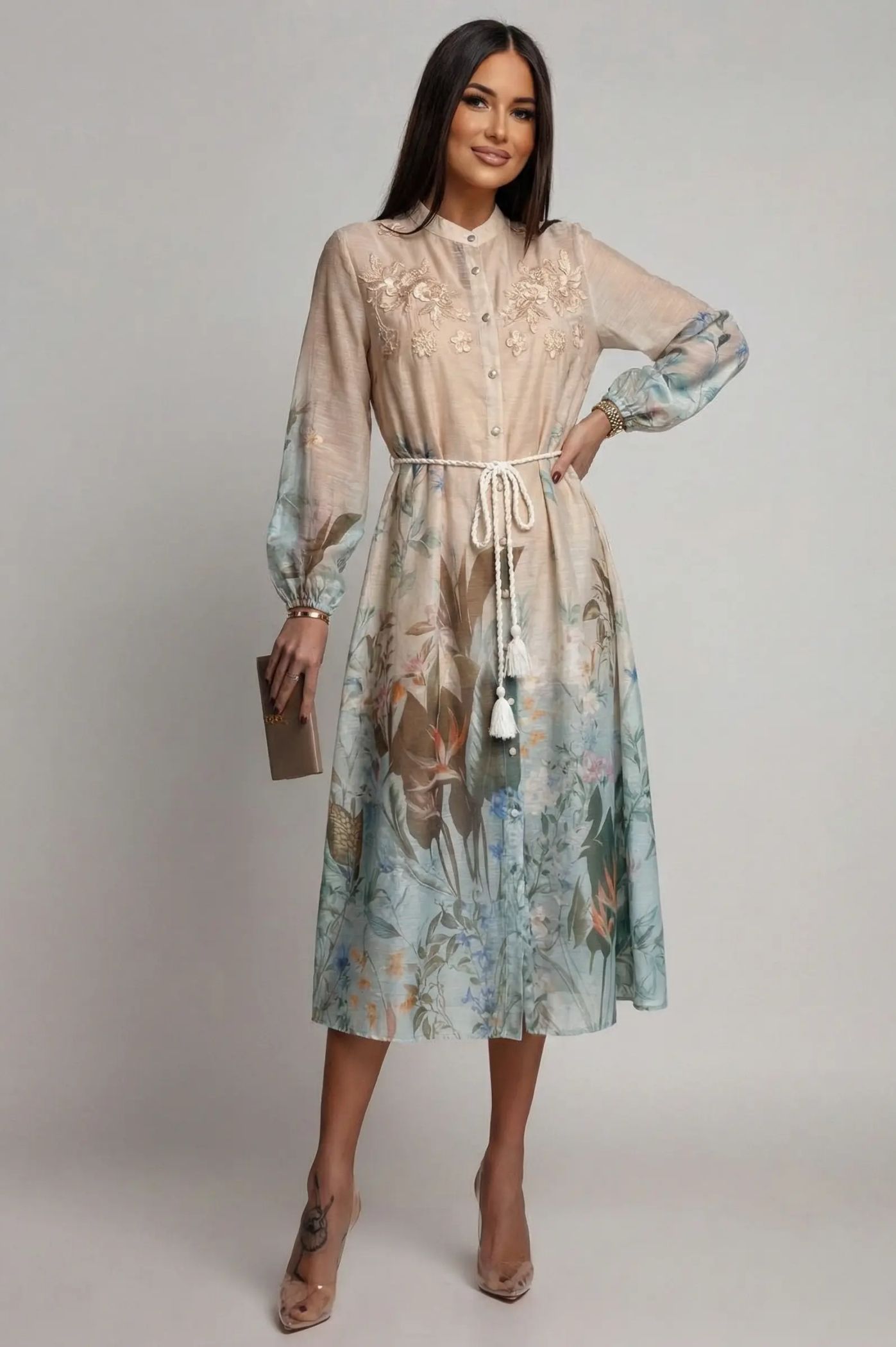 Αναδείξτε το στυλ σας με αυτό το εκλεπτυσμένο γυναικείο midi φόρεμα σεμιζιέ, που συνδυάζει την κλασική κομψότητα με μοντέρνα floral στοιχεία. Ένα κομμάτι-κλειδί για την γκαρνταρόμπα σας, ιδανικό για αέρινες εμφανίσεις από το πρωί στο γραφείο μέχρι μια απογευματινή κοινωνική εκδήλωση. Διαθέτει κομψή πατιλέτα με κουμπιά σε όλο το μήκος και γιακά τύπου mao, προσφέροντας μια διαχρονική και προσεγμένη εμφάνιση. Το πάνω μέρος διακοσμείται από ανάγλυφα, floral κεντήματα, προσθέτοντας μια ρομαντική και premium αίσθηση. Το κάτω μέρος του φορέματος και τα μανίκια εντυπωσιάζουν με ένα μοναδικό τύπωμα από λουλούδια. Διαθέτει μια ιδιαίτερη ζώνη, που τονίζει τη μέση και προσδίδει έναν ακαταμάχητο boho-chic χαρακτήρα.