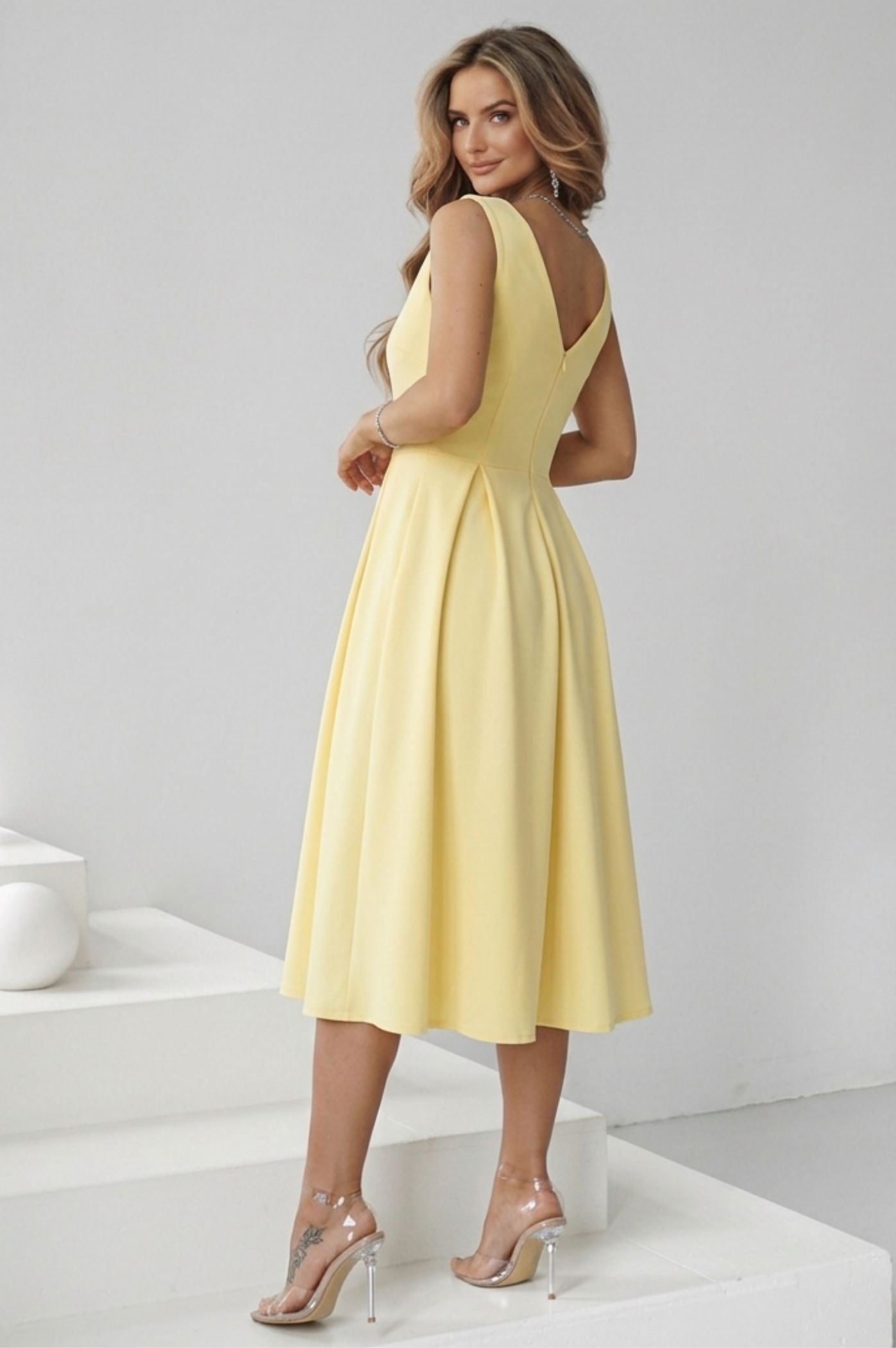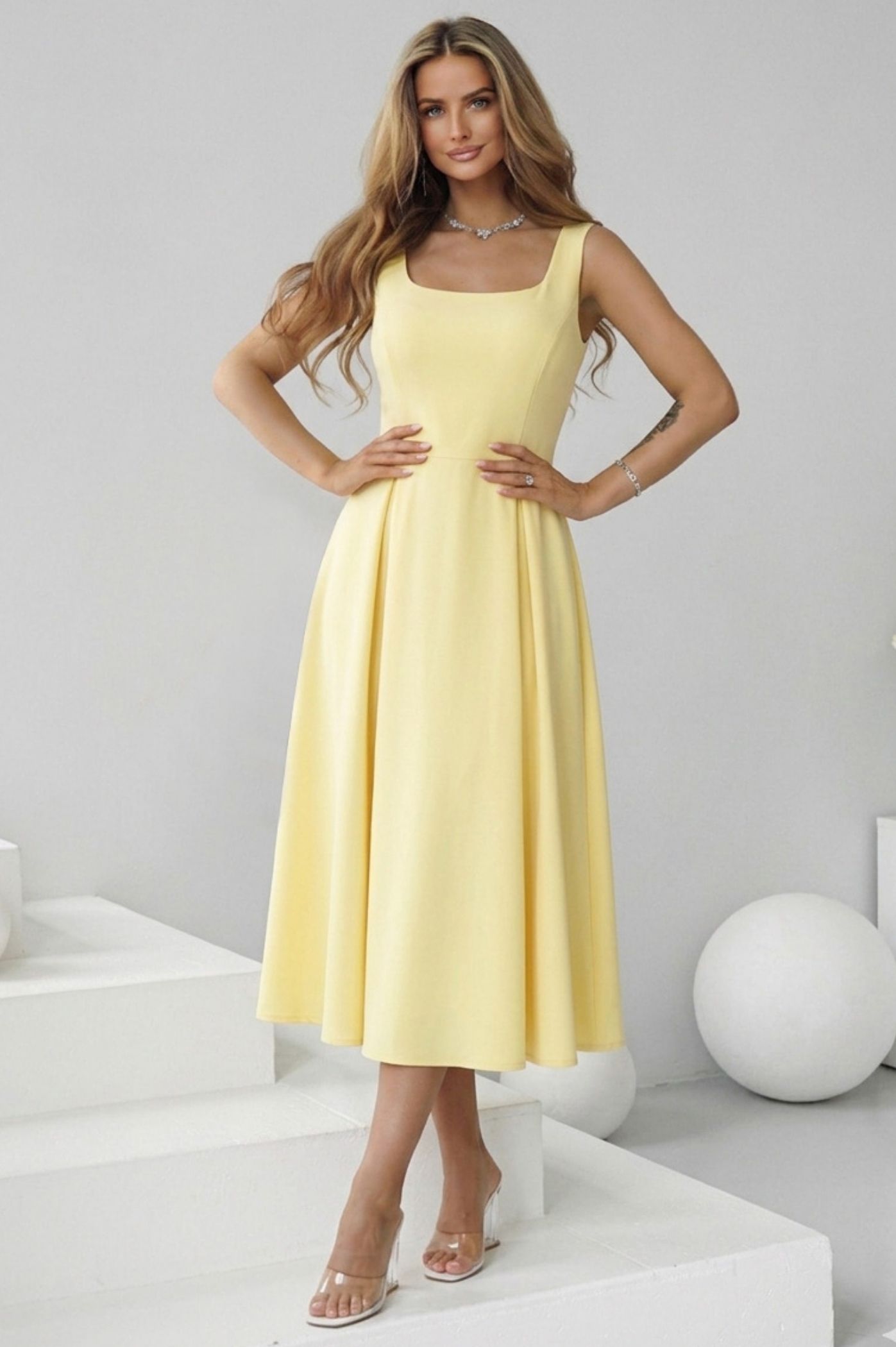 Αναδείξτε τη θηλυκότητά σας με αυτό το υπέροχο midi αμάνικο φόρεμα, μια επιλογή που συνδυάζει τη ρομαντική διάθεση με τη σοφιστικέ κομψότητα. Αυτό το φόρεμα είναι η ιδανική λύση για κάθε επίσημη ή ημι-επίσημη περίσταση, από μια βάπτιση μέχρι ένα cocktail party. Η τετράγωνη λαιμόκοψη προσφέρει ένα μοντέρνο και καθαρό look, αναδεικνύοντας υπέροχα το ντεκολτέ και τους ώμους. Η φούστα ανοίγει σε γραμμή άλφα με διακριτικές πιέτες, χαρίζοντας κίνηση και αέρινη αίσθηση, ενώ κολακεύει κάθε τύπο σιλουέτας. Το κομψό μήκος κάτω από το γόνατο προσδίδει μια αριστοκρατική νότα, κάνοντας το κατάλληλο για όλες τις ώρες της ημέρας. Η καθαρή του γραμμή επιτρέπει να το "μεταμορφώσετε" ανάλογα με τα αξεσουάρ που θα επιλέξετε.