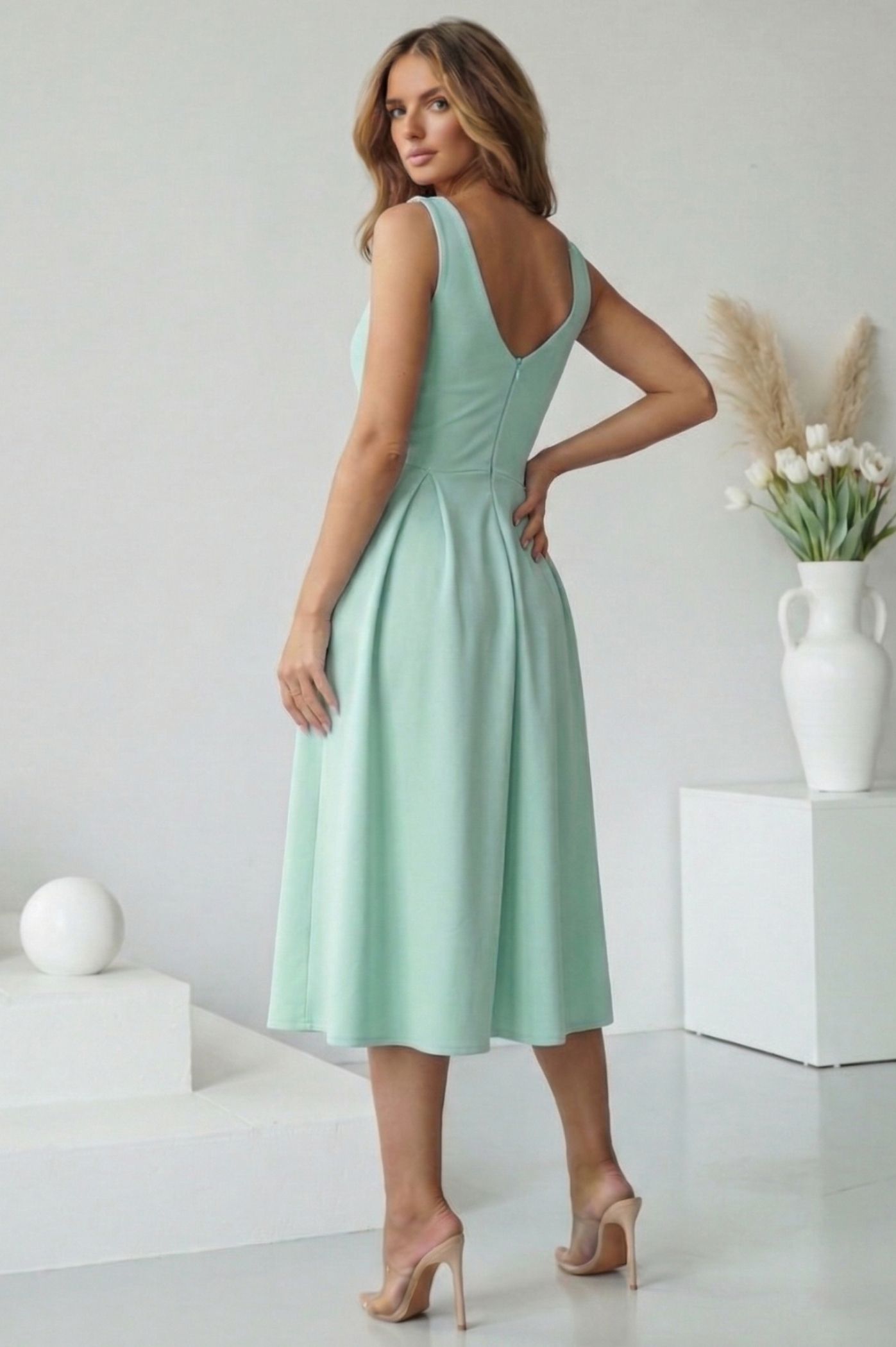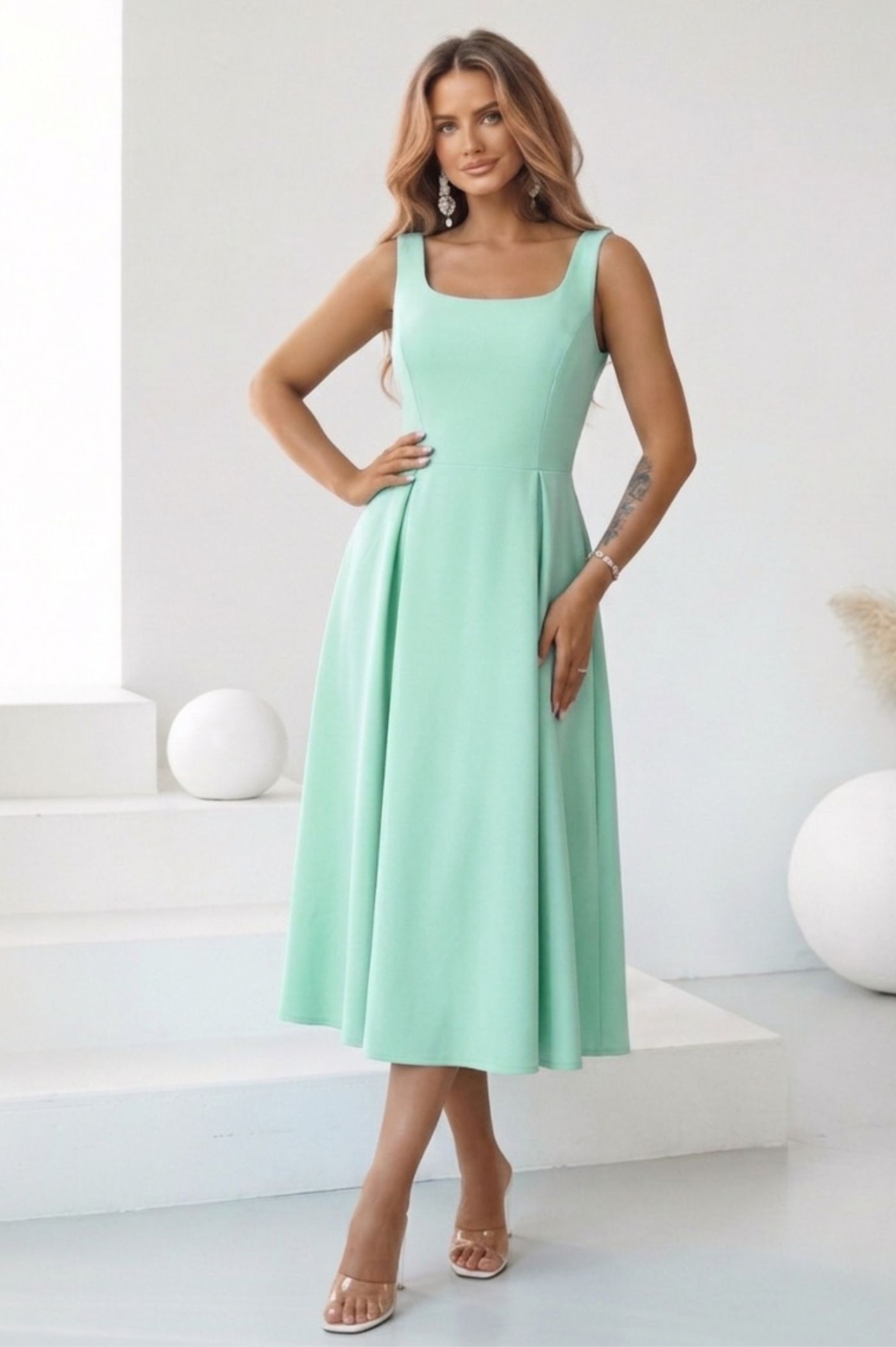 Αναδείξτε τη θηλυκότητά σας με αυτό το υπέροχο midi αμάνικο φόρεμα, μια επιλογή που συνδυάζει τη ρομαντική διάθεση με τη σοφιστικέ κομψότητα. Αυτό το φόρεμα είναι η ιδανική λύση για κάθε επίσημη ή ημι-επίσημη περίσταση, από μια βάπτιση μέχρι ένα cocktail party. Η τετράγωνη λαιμόκοψη προσφέρει ένα μοντέρνο και καθαρό look, αναδεικνύοντας υπέροχα το ντεκολτέ και τους ώμους. Η φούστα ανοίγει σε γραμμή άλφα με διακριτικές πιέτες, χαρίζοντας κίνηση και αέρινη αίσθηση, ενώ κολακεύει κάθε τύπο σιλουέτας. Το κομψό μήκος κάτω από το γόνατο προσδίδει μια αριστοκρατική νότα, κάνοντας το κατάλληλο για όλες τις ώρες της ημέρας. Η καθαρή του γραμμή επιτρέπει να το "μεταμορφώσετε" ανάλογα με τα αξεσουάρ που θα επιλέξετε.