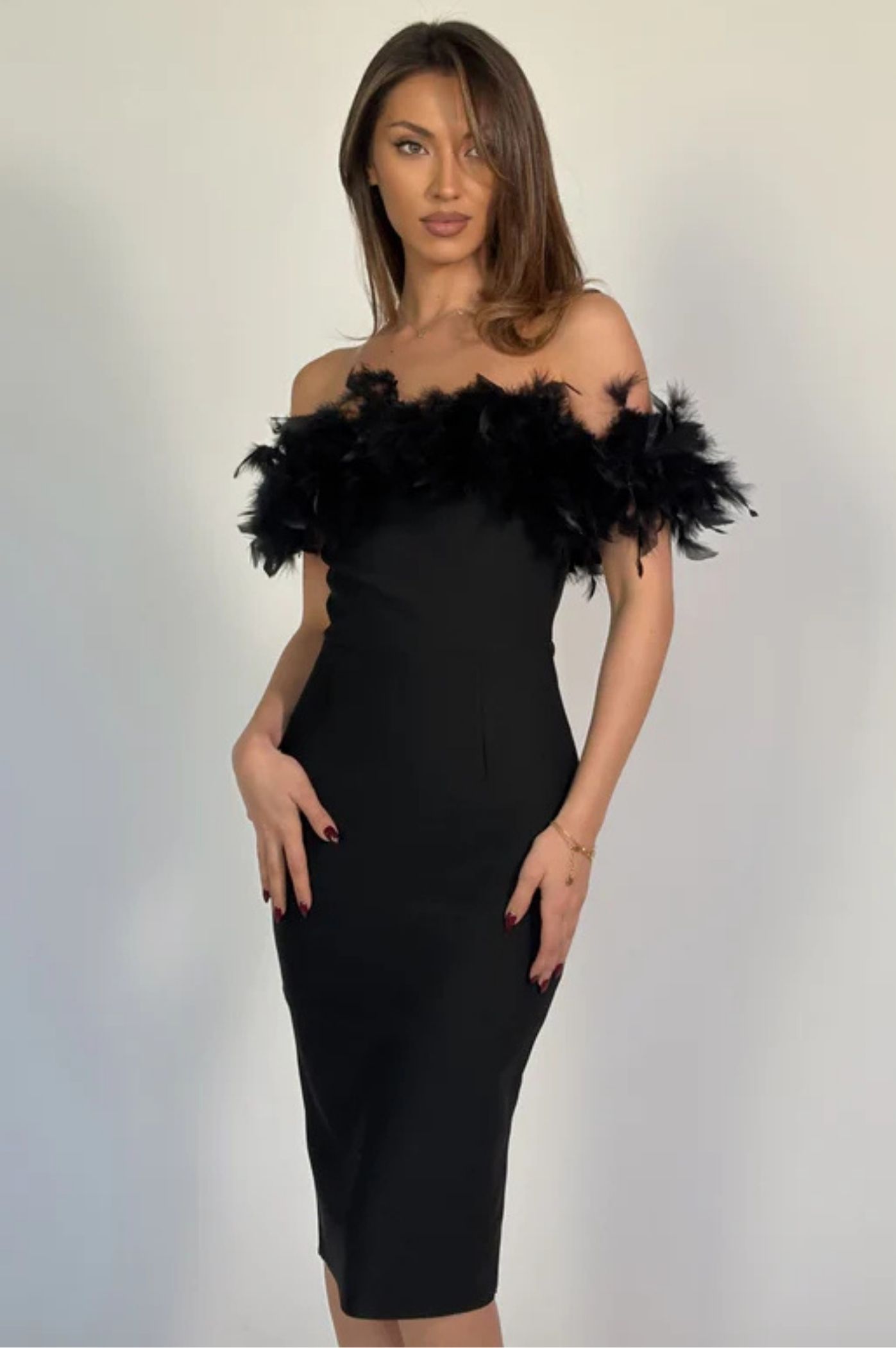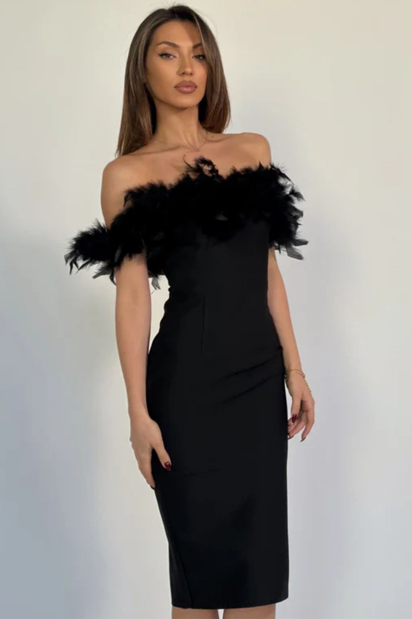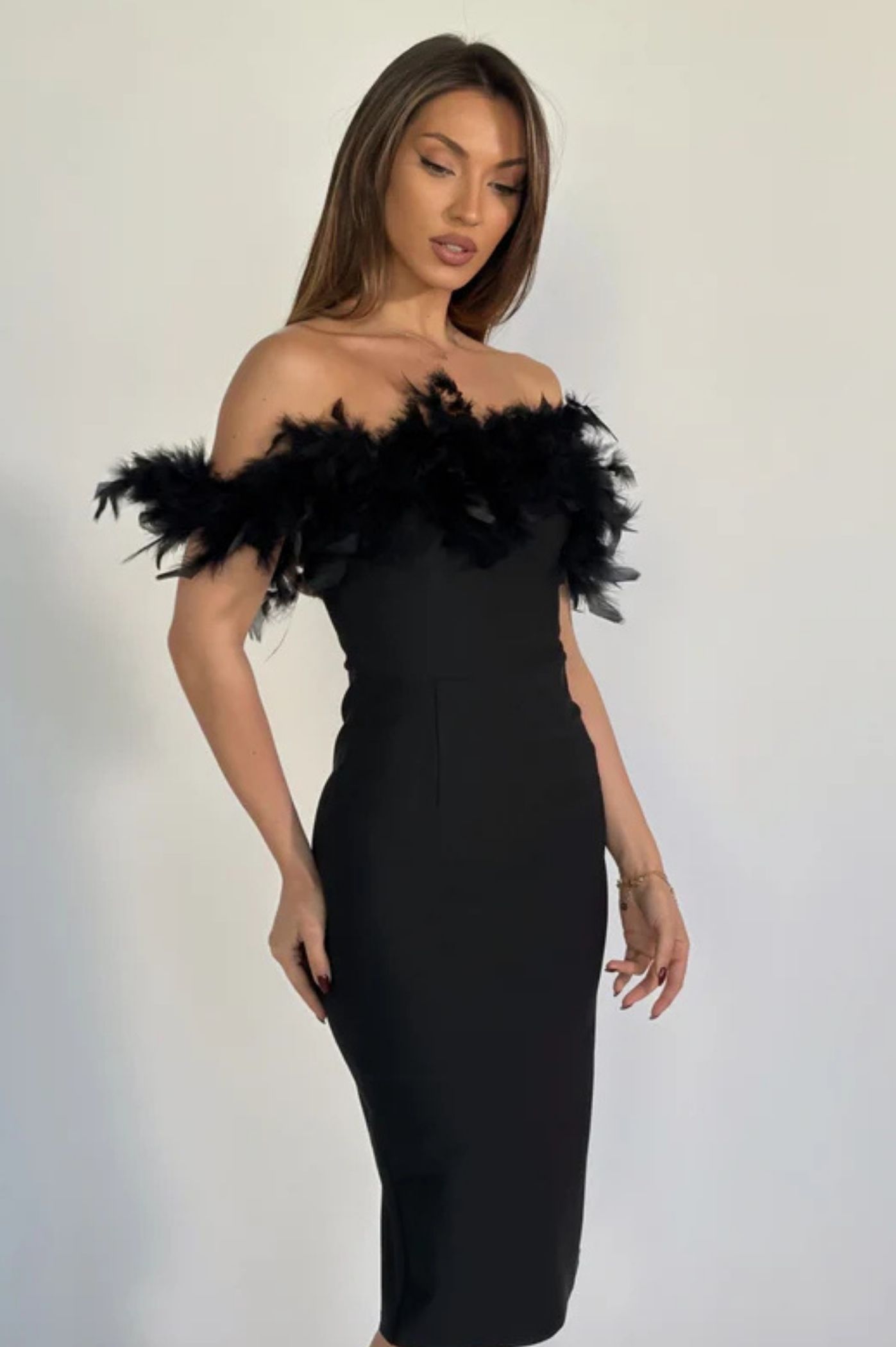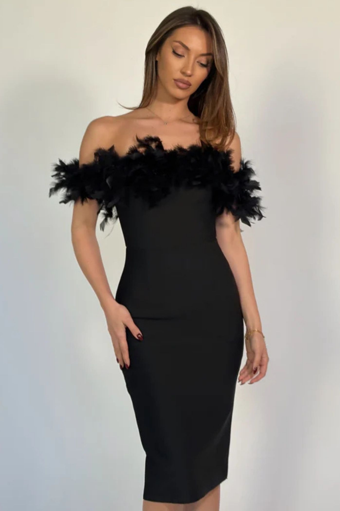 Αναδείξτε τη θηλυκότητά σας με αυτό το εκθαμβωτικό μαύρο midi φόρεμα! Σχεδιασμένο για να τραβάει τα βλέμματα, διαθέτει εντυπωσιακό off-shoulder ντεκολτέ διακοσμημένο με πλούσια, αιθέρια πούπουλα, προσδίδοντας μια νότα glamour και πολυτέλειας. Το ύφασμα bandage εξασφαλίζει τέλεια εφαρμογή και διαμόρφωση της σιλουέτας, αγκαλιάζοντας τις καμπύλες σας με κομψότητα. Το μήκος midi είναι ιδανικό για να δείχνετε σοφιστικέ και μοντέρνα.