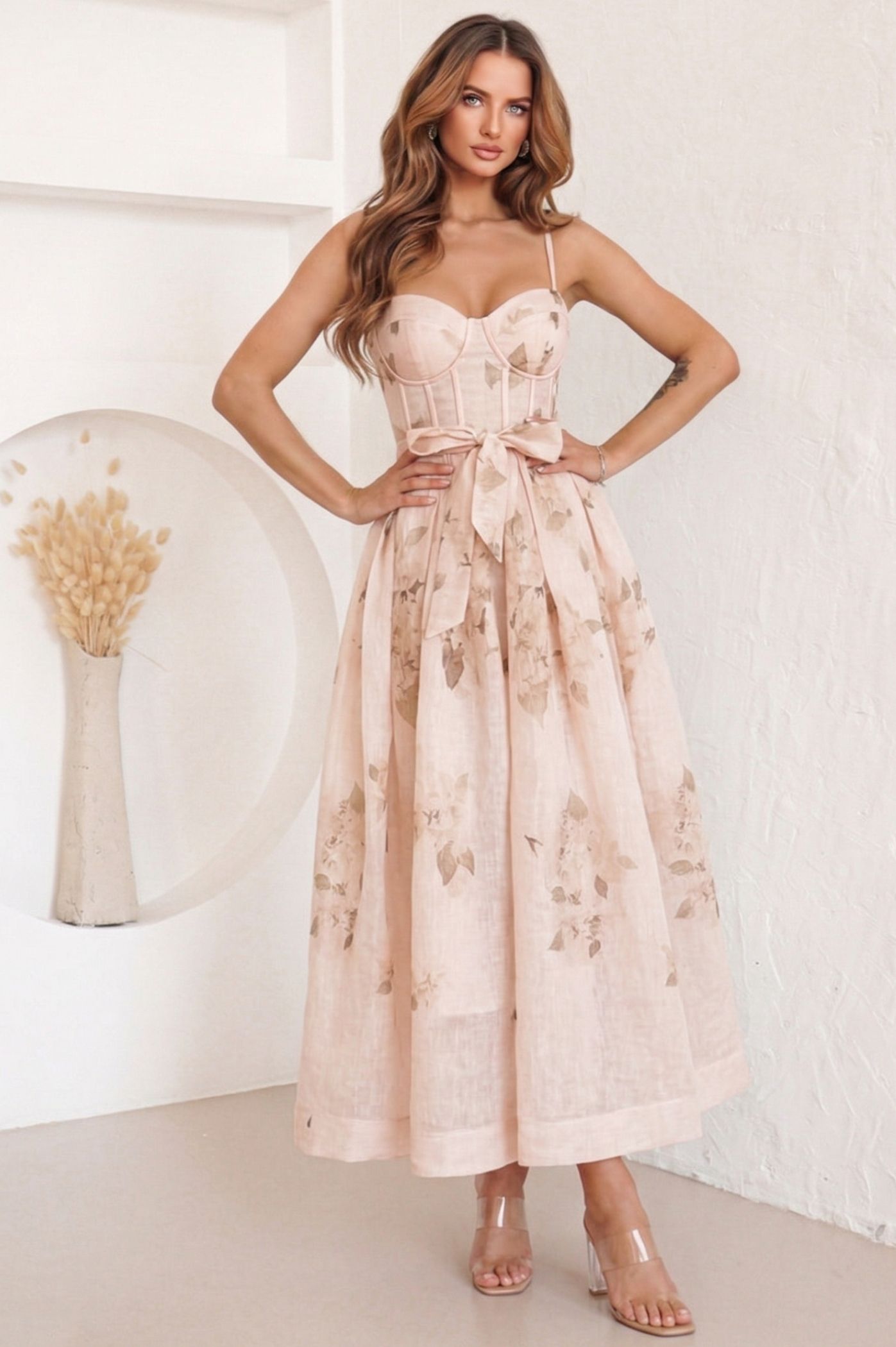 Ανακαλύψτε το απόλυτο midi φόρεμα για τις πιο ξεχωριστές σας στιγμές. Αυτό το υπέροχο φόρεμα-κορσές συνδυάζει τη θηλυκότητα με την τάση του corset top. Το λεπτό φλοράλ μοτίβο προσδίδει μια ρομαντική και vintage αίσθηση, ενώ η ζώνη με φιόγκο τονίζει τη μέση, δημιουργώντας μια άψογη σιλουέτα. Ως καλεσμένη σε γάμο, αυτό το φόρεμα προσφέρει την τέλεια ισορροπία ανάμεσα σε επίσημο και chic. Μια κομψή επιλογή για νονά ή καλεσμένη, που εκπέμπει φινέτσα. Για μια ιδιαίτερη βραδινή έξοδο ή ένα ραντεβού, αυτό το μίντι φόρεμα θα κλέψει τις εντυπώσεις. Ένα statement κομμάτι που συνδυάζεται υπέροχα με ψηλοτάκουνα πέδιλα.