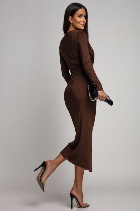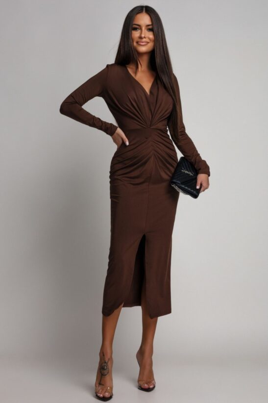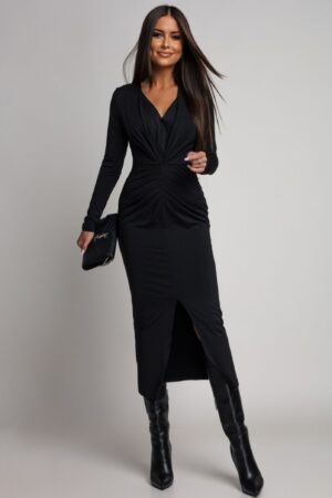 Αναδείξτε το στυλ σας με το απόλυτο ελαστικό midi φόρεμα. Το φόρεμα διαθέτει κολακευτικό V-ντεκολτέ και μακριά μανίκια, προσφέροντας μια σικ και διακριτική εμφάνιση. Το χαρακτηριστικό του γνώρισμα είναι η εντυπωσιακή λεπτομέρεια με σούρες στο μπούστο και τη μέση, που αγκαλιάζει το σώμα και τονίζει τις καμπύλες. Η ελαστική εφαρμογή εξασφαλίζει άνεση και τέλεια εφαρμογή σε κάθε σωματότυπο, ενώ το διακριτικό σχίσιμο στο πόδι προσθέτει έναν αέρα θηλυκότητας και κίνησης. Συνδυάστε το με ψηλές μπότες ή γόβες και την αγαπημένη σας τσάντα για ένα look που μαγνητίζει!